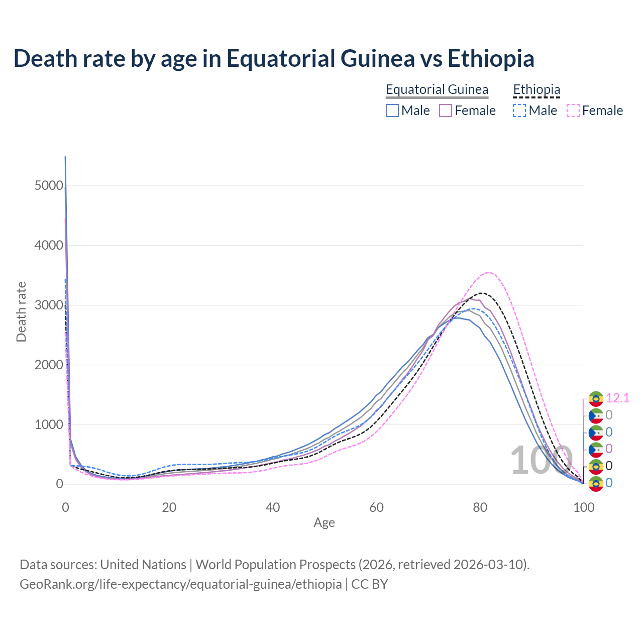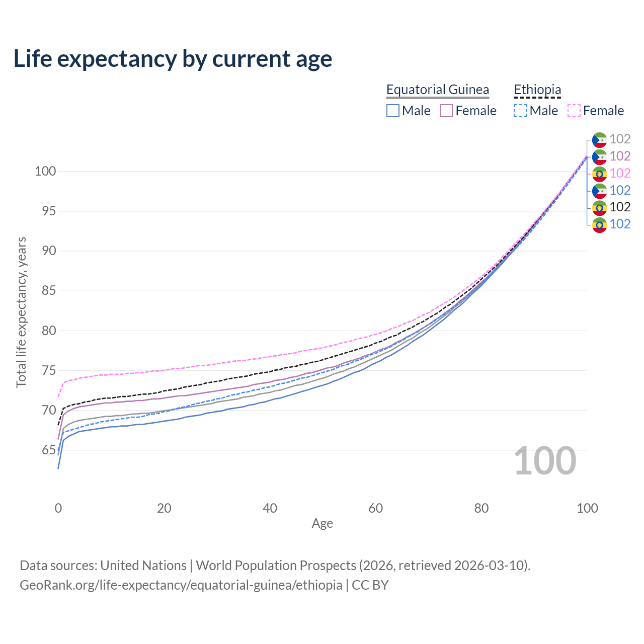 This life expectancy calculator shows the odds of living to 100, 95, 90, and below based on current age for both males and females in Equatorial Guinea and Ethiopia, along with mean and median age of death. The calculations are based on the 2026 life tables (actuarial tables) from the UN World Population Prospects.