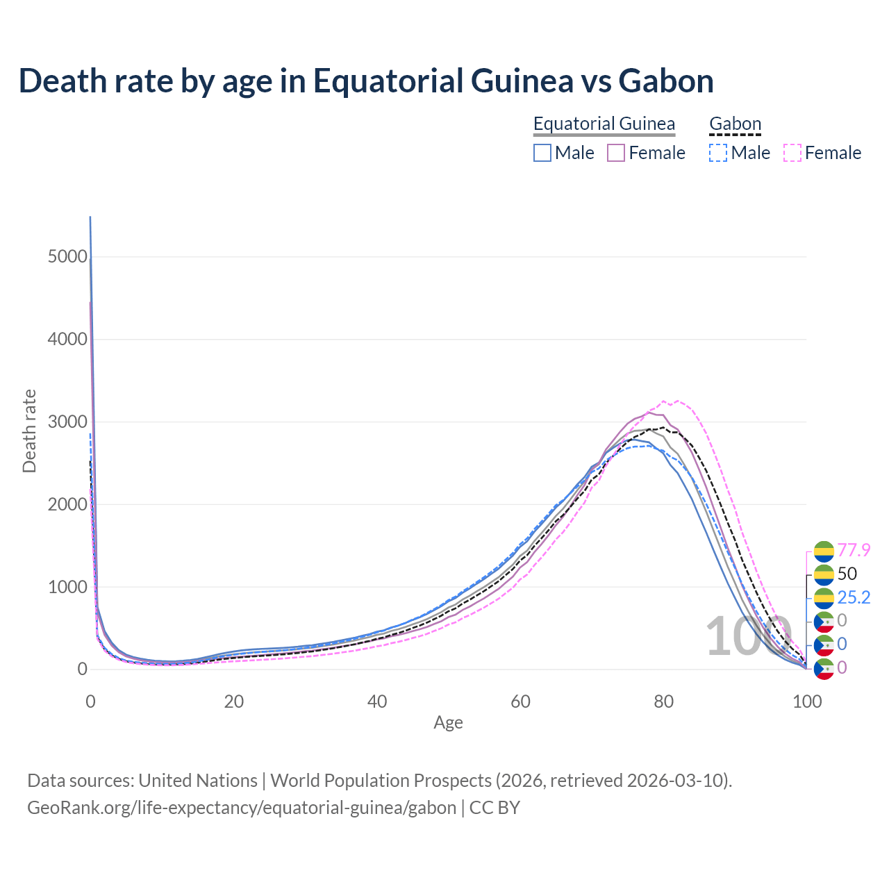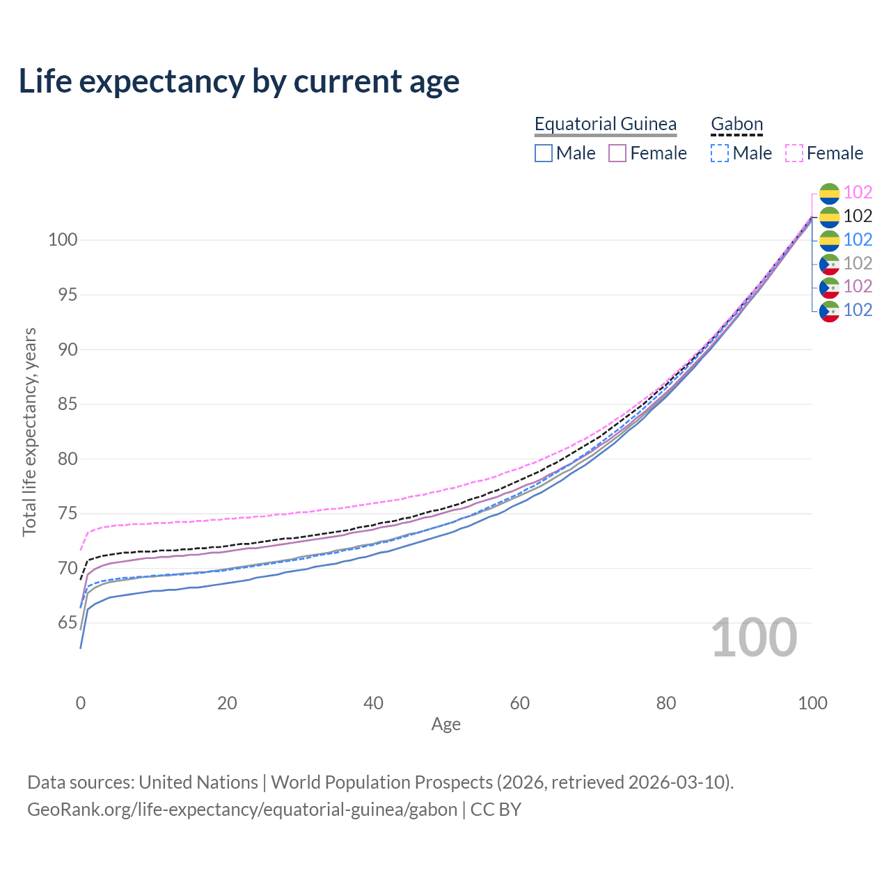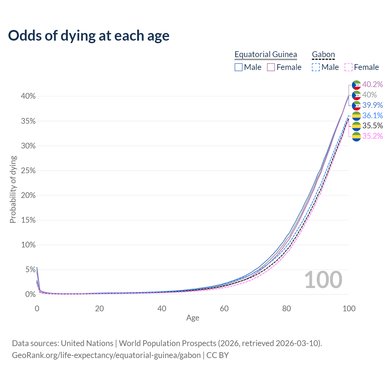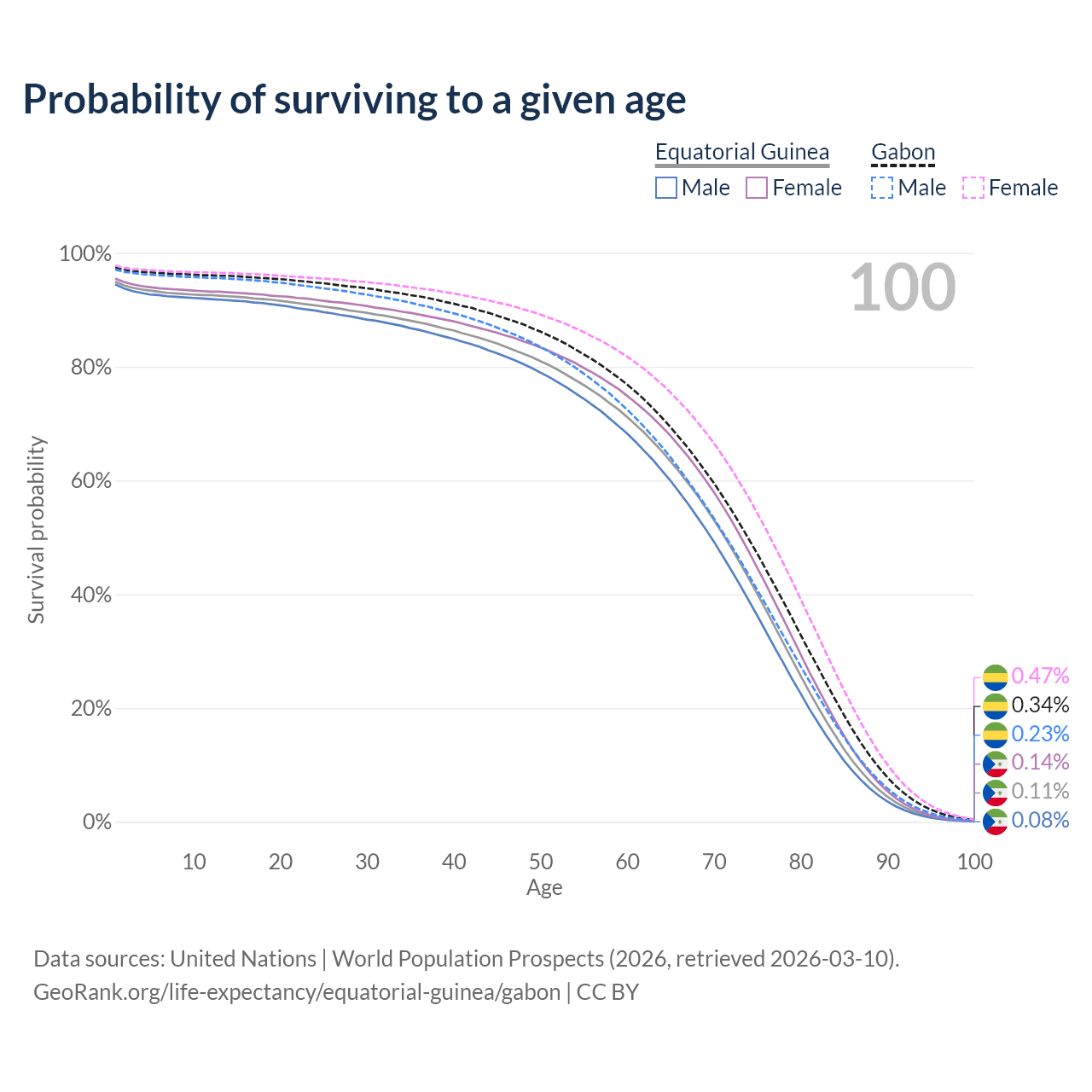 This life expectancy calculator shows the odds of living to 100, 95, 90, and below based on current age for both males and females in Equatorial Guinea and Gabon, along with mean and median age of death. The calculations are based on the 2026 life tables (actuarial tables) from the UN World Population Prospects.