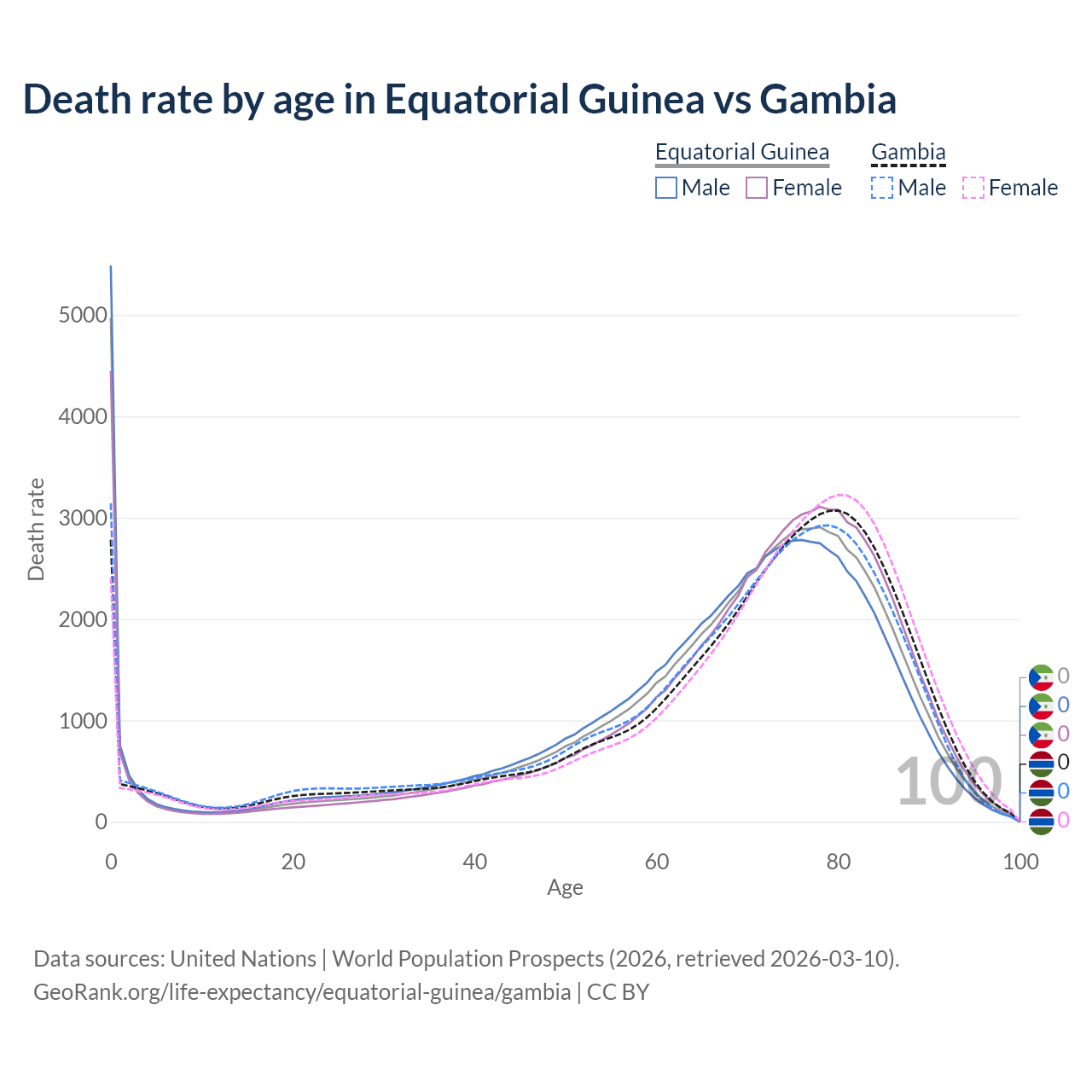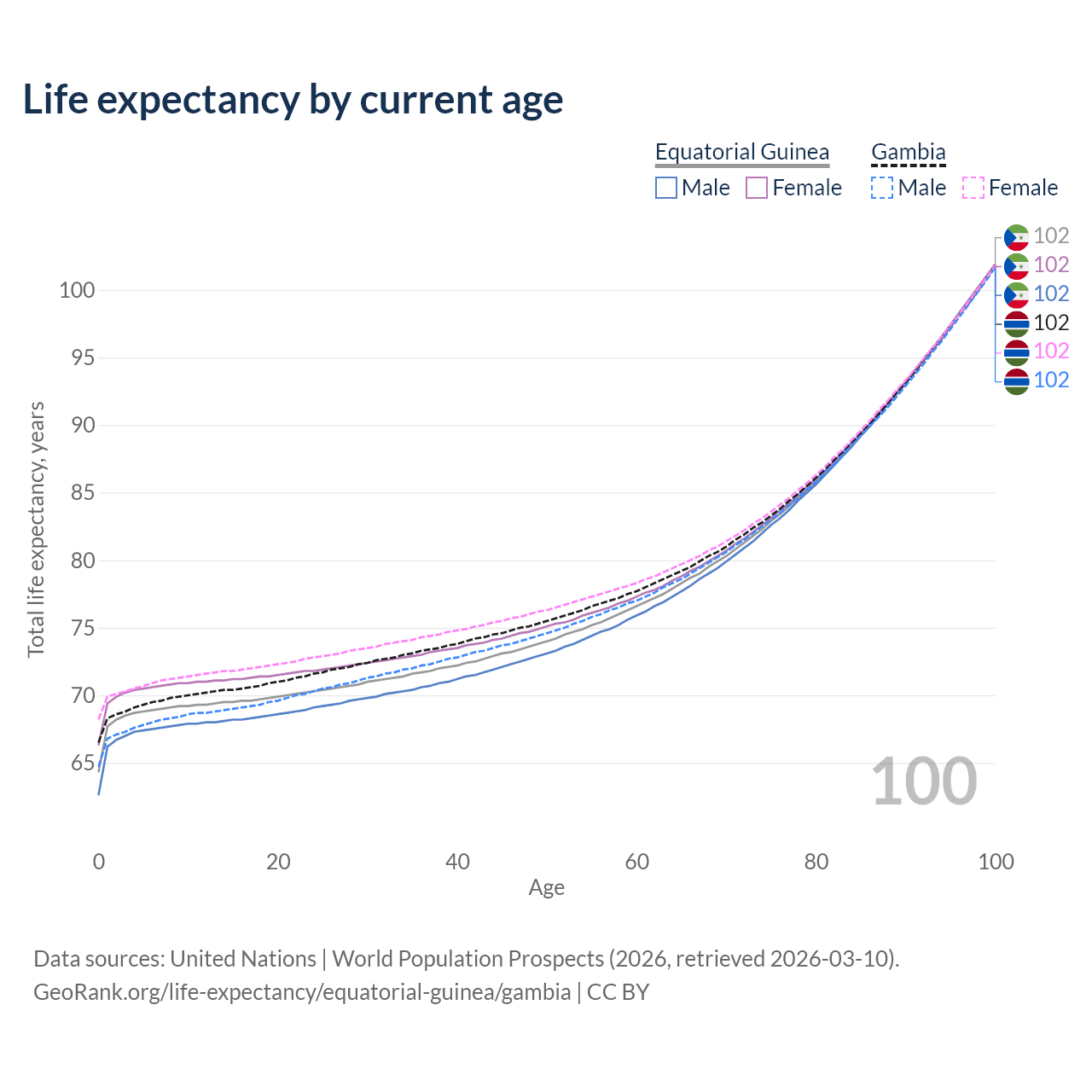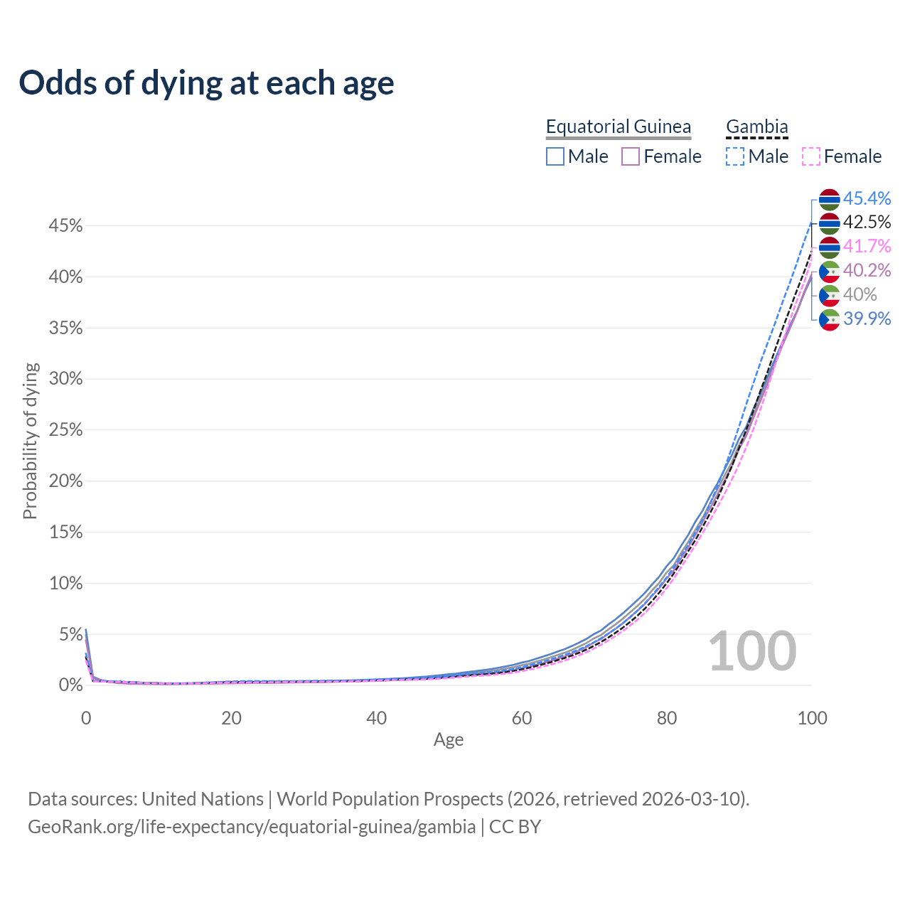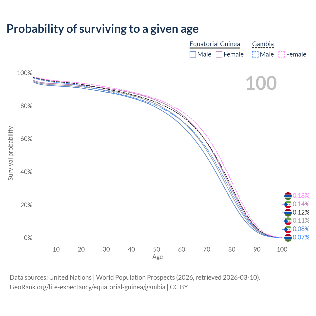 This life expectancy calculator shows the odds of living to 100, 95, 90, and below based on current age for both males and females in Equatorial Guinea and the Gambia, along with mean and median age of death. The calculations are based on the 2026 life tables (actuarial tables) from the UN World Population Prospects.