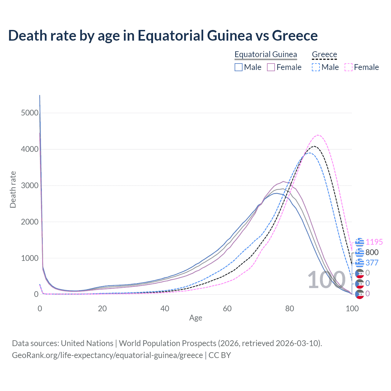 In Equatorial Guinea, the most common age of death is 0, compared to 88 in Greece. The median age of death is 71.3 in Equatorial Guinea and 84.9 in Greece, meaning only half of each cohort is expected to live past that age.