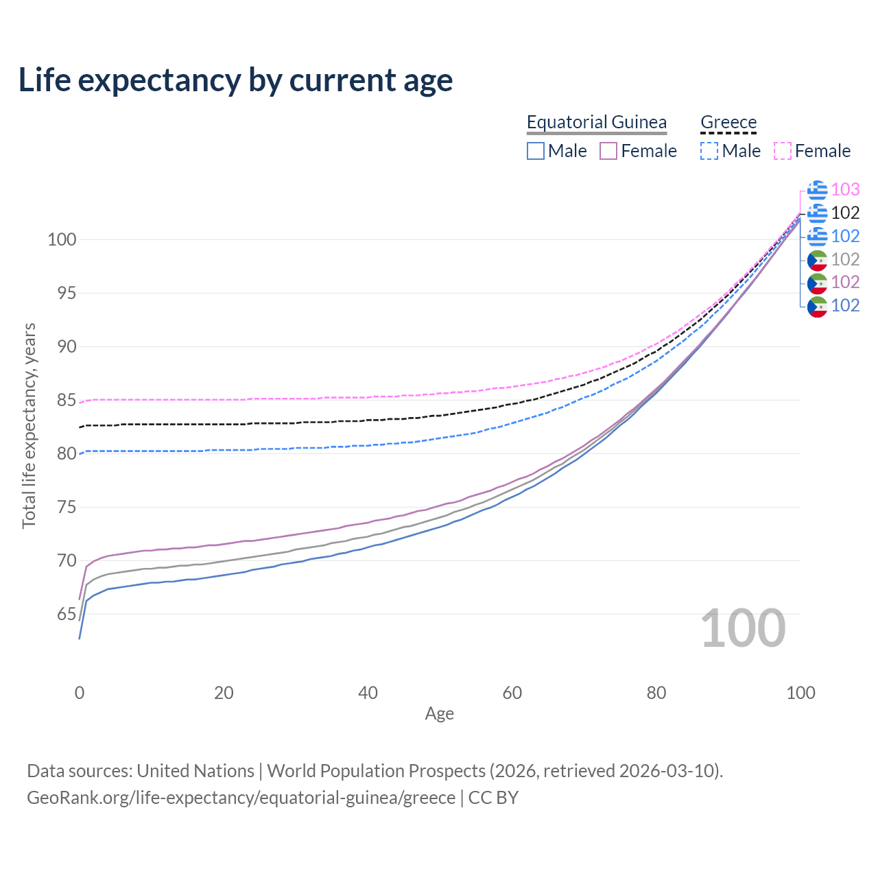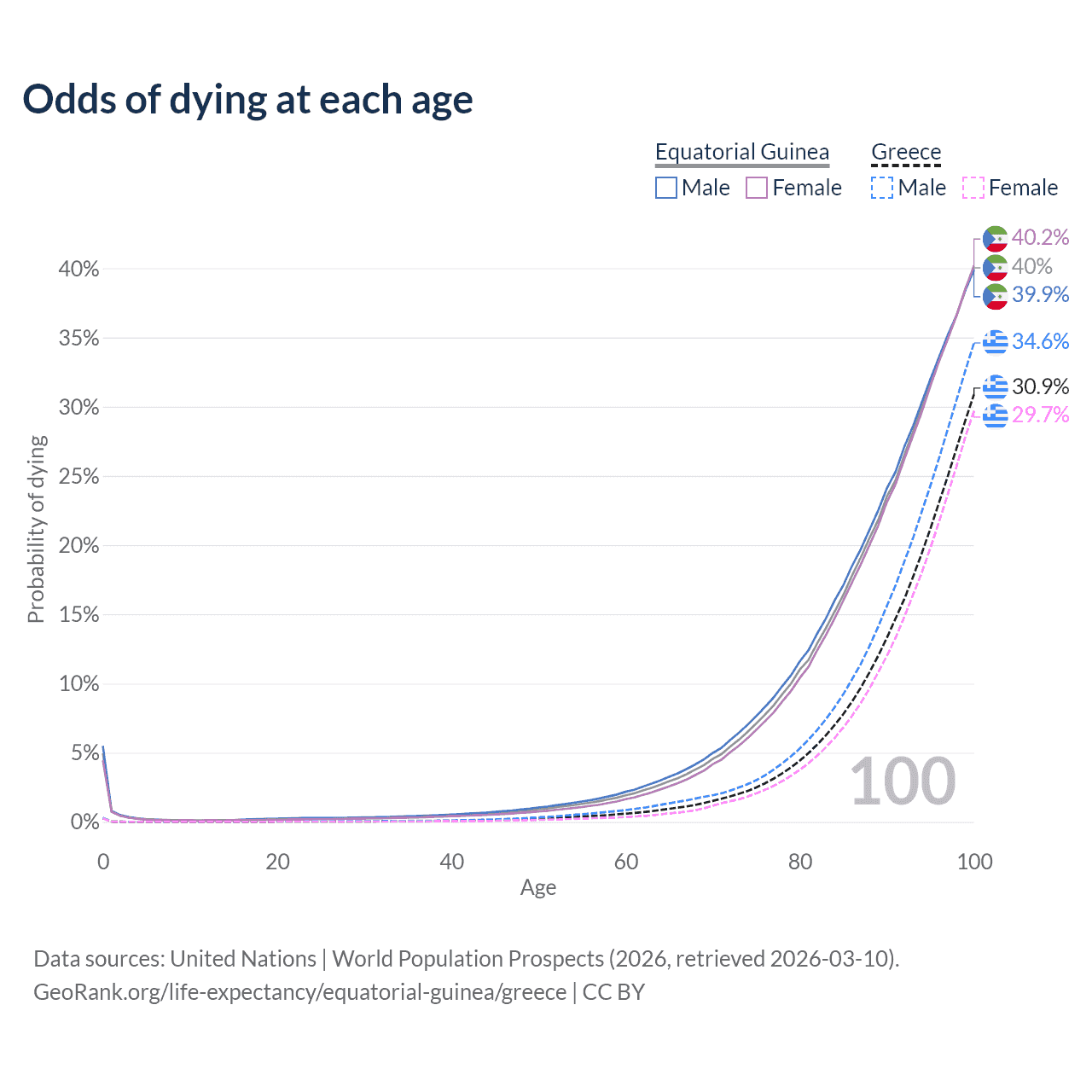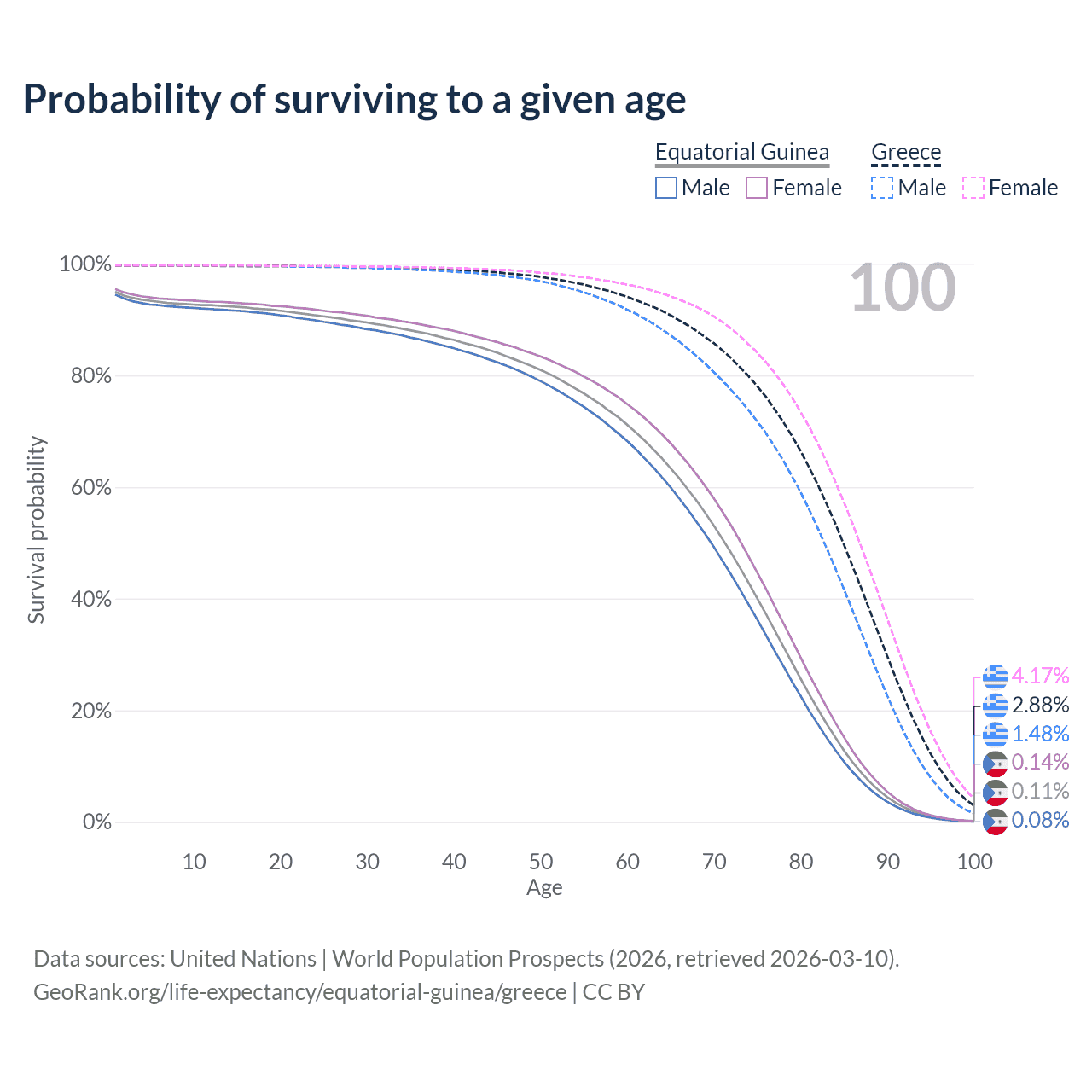 This life expectancy calculator shows the odds of living to 100, 95, 90, and below based on current age for both males and females in Equatorial Guinea and Greece, along with mean and median age of death. The calculations are based on the 2026 life tables (actuarial tables) from the UN World Population Prospects.