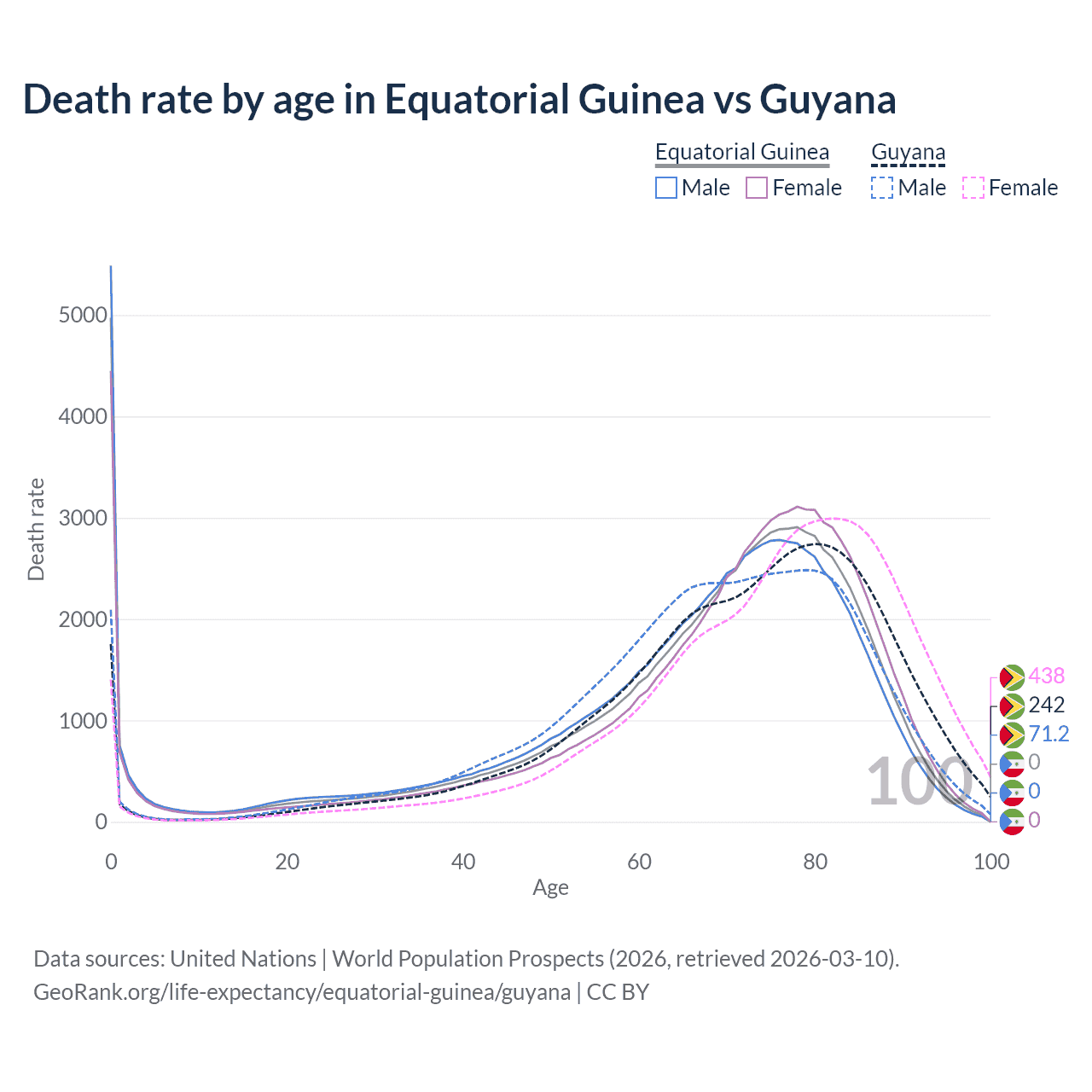 In Equatorial Guinea, the most common age of death is 0, compared to 80 in Guyana. The median age of death is 71.3 in Equatorial Guinea and 74.1 in Guyana, meaning only half of each cohort is expected to live past that age.