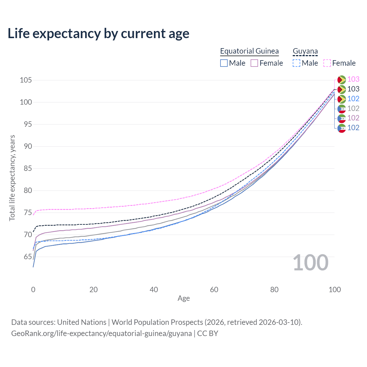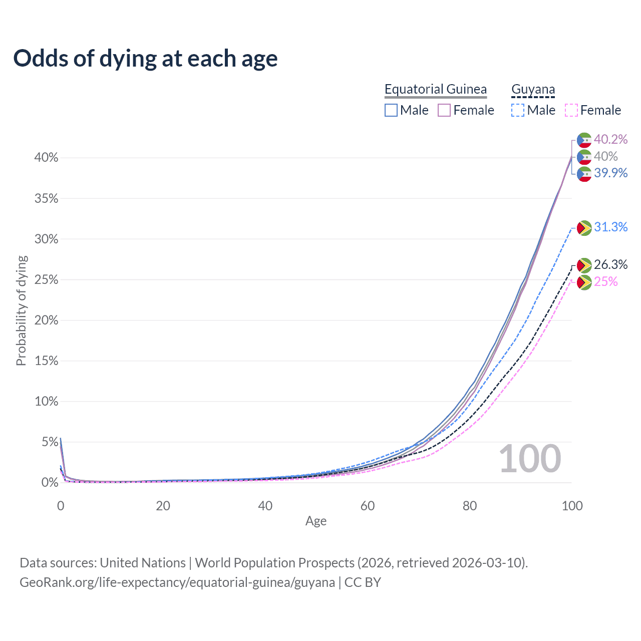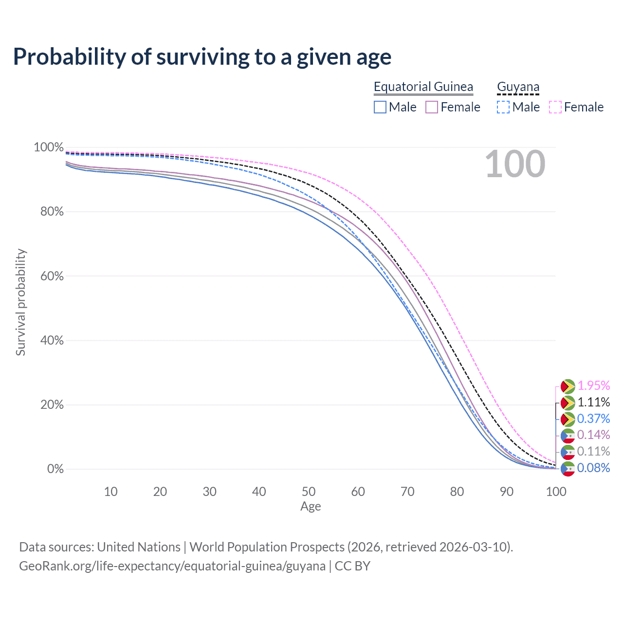 This life expectancy calculator shows the odds of living to 100, 95, 90, and below based on current age for both males and females in Equatorial Guinea and Guyana, along with mean and median age of death. The calculations are based on the 2026 life tables (actuarial tables) from the UN World Population Prospects.