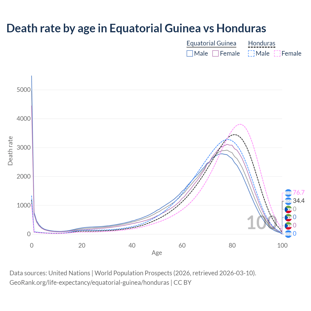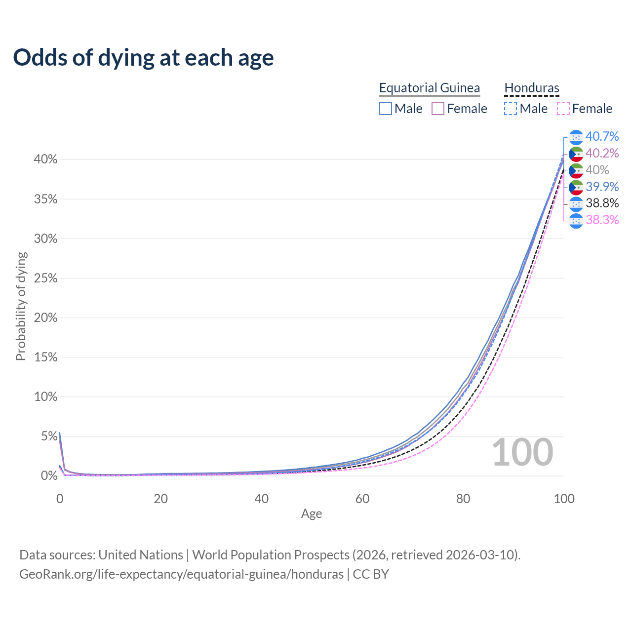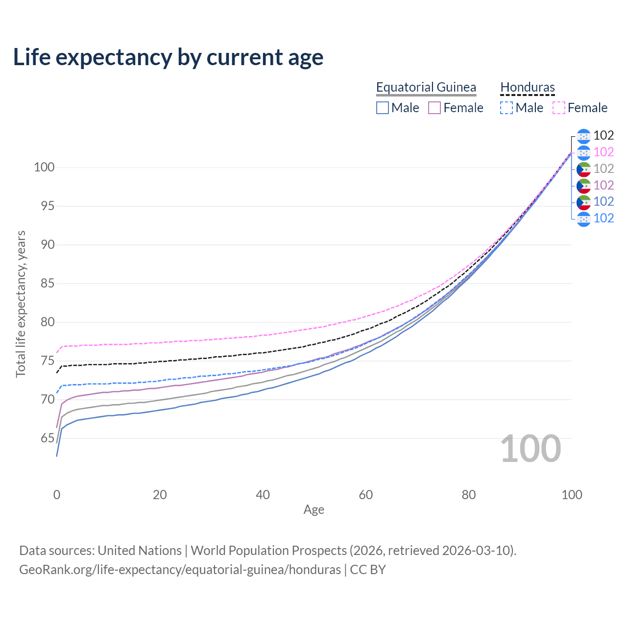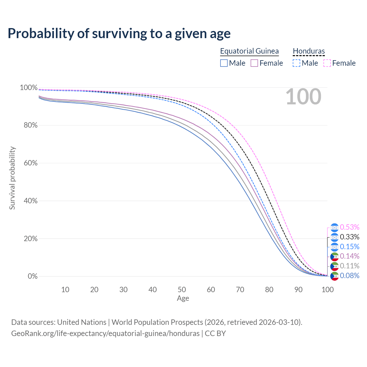 This life expectancy calculator shows the odds of living to 100, 95, 90, and below based on current age for both males and females in Equatorial Guinea and Honduras, along with mean and median age of death. The calculations are based on the 2026 life tables (actuarial tables) from the UN World Population Prospects.