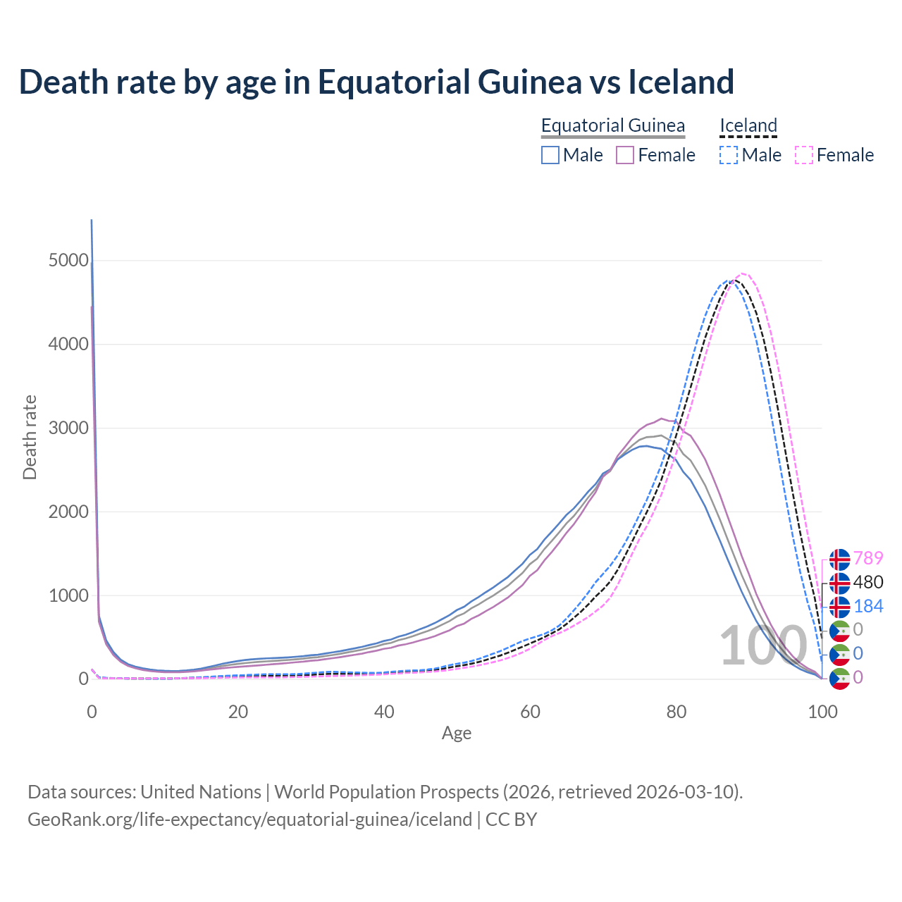 In Equatorial Guinea, the most common age of death is 0, compared to 88 in Iceland. The median age of death is 71.3 in Equatorial Guinea and 85.9 in Iceland, meaning only half of each cohort is expected to live past that age.