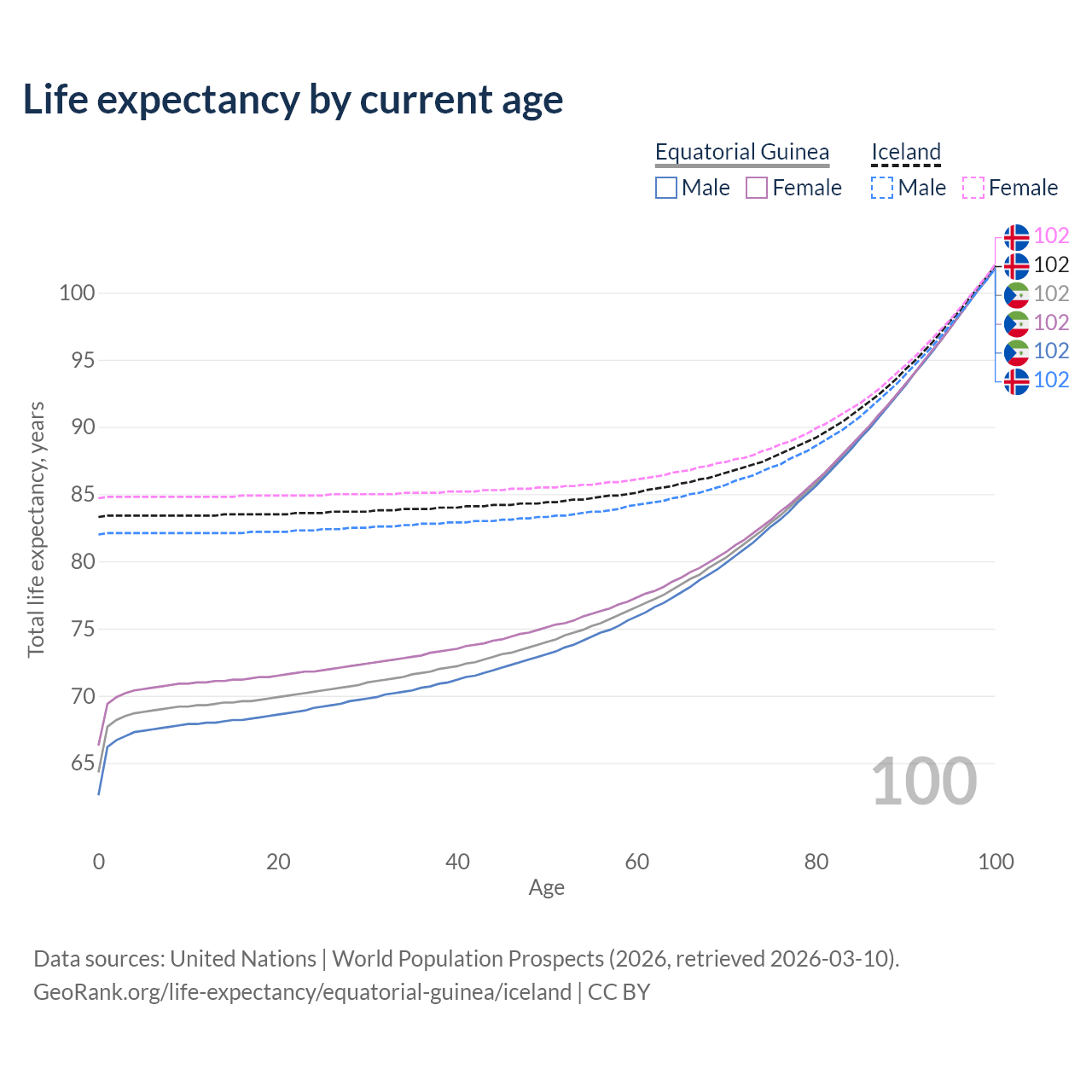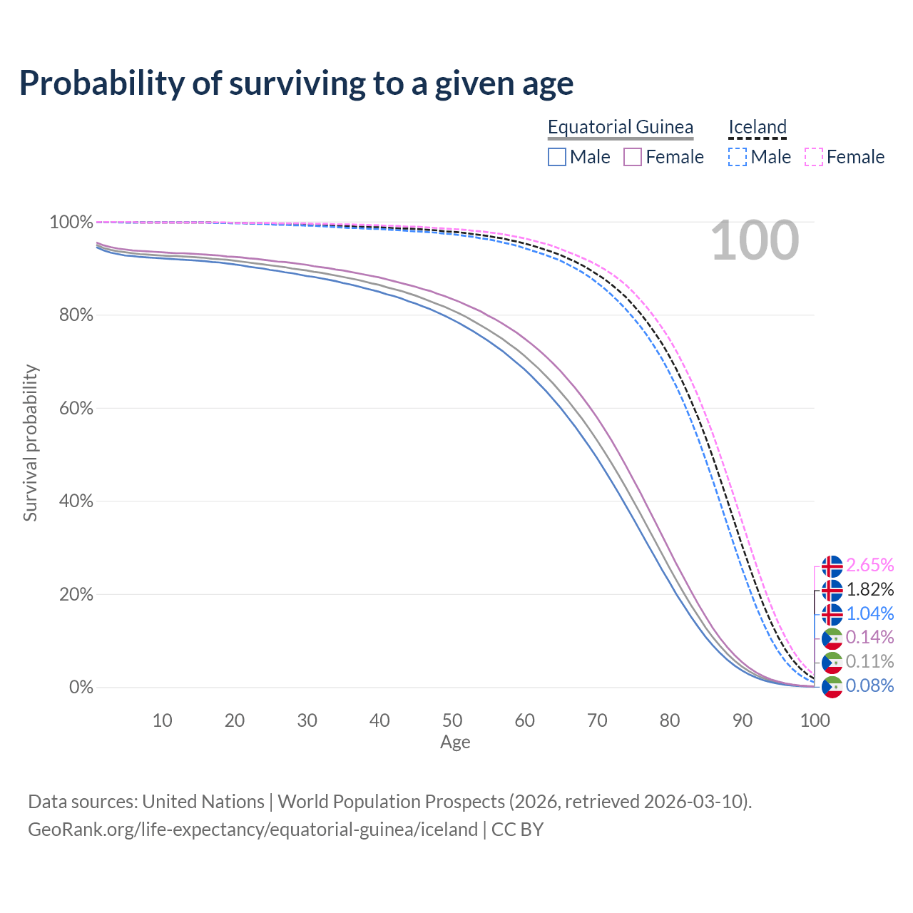 This life expectancy calculator shows the odds of living to 100, 95, 90, and below based on current age for both males and females in Equatorial Guinea and Iceland, along with mean and median age of death. The calculations are based on the 2026 life tables (actuarial tables) from the UN World Population Prospects.