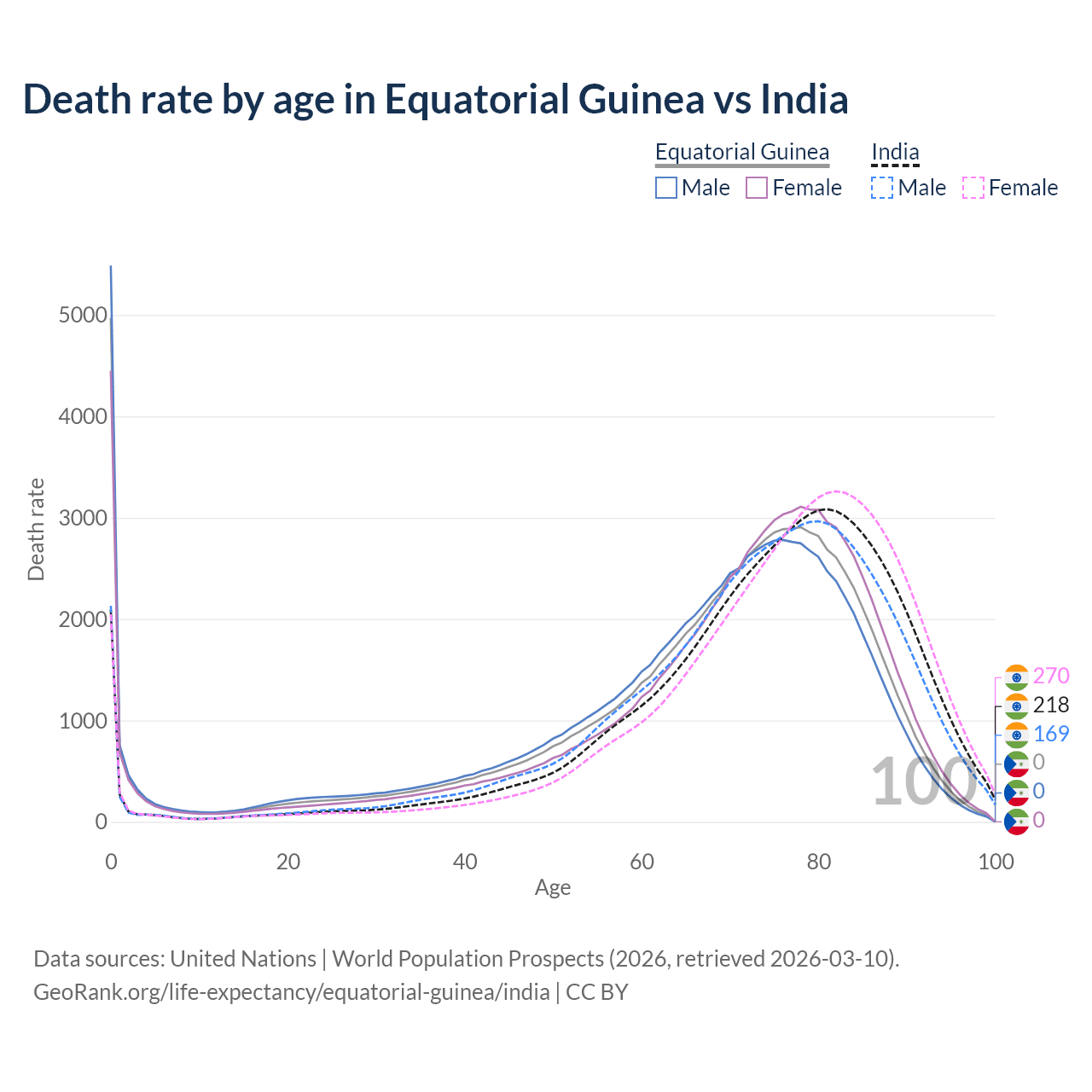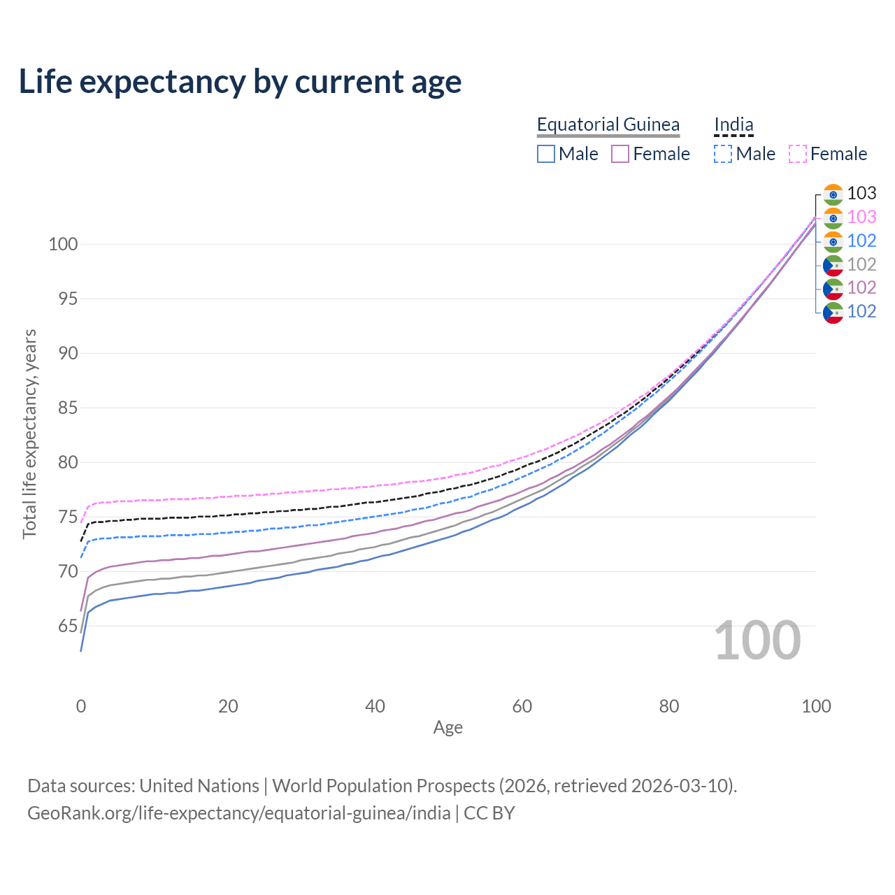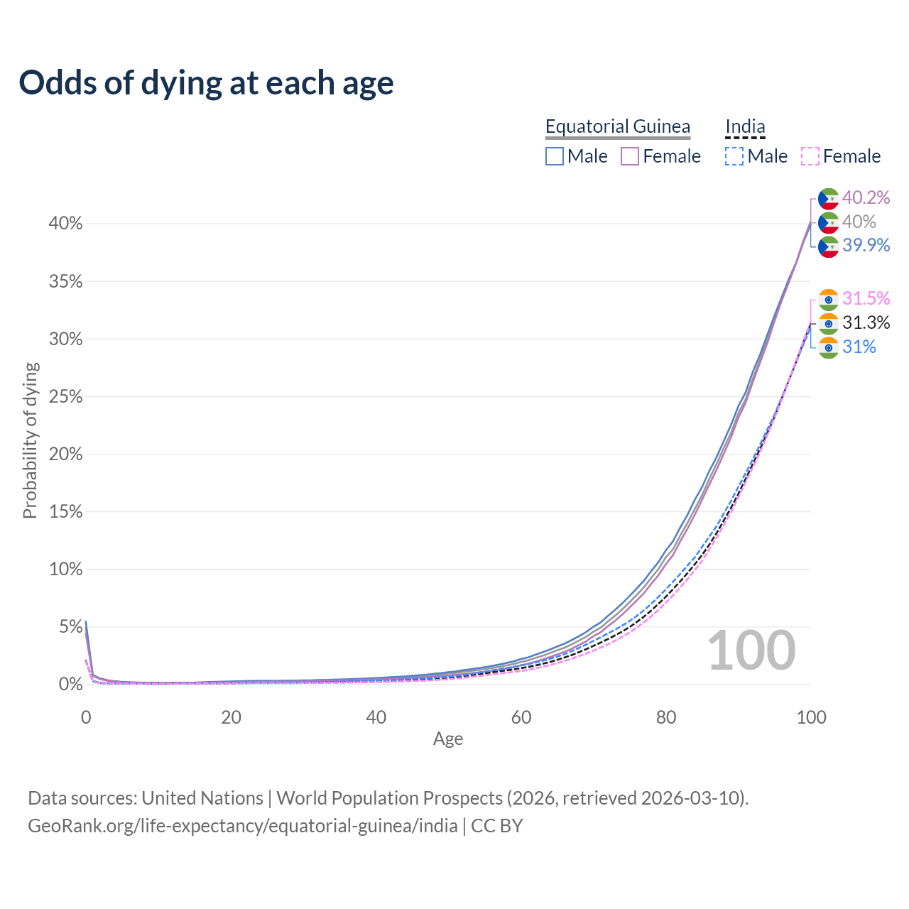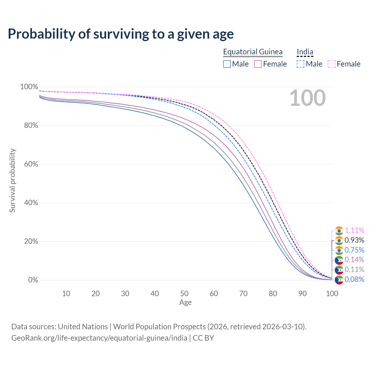 This life expectancy calculator shows the odds of living to 100, 95, 90, and below based on current age for both males and females in Equatorial Guinea and India, along with mean and median age of death. The calculations are based on the 2026 life tables (actuarial tables) from the UN World Population Prospects.