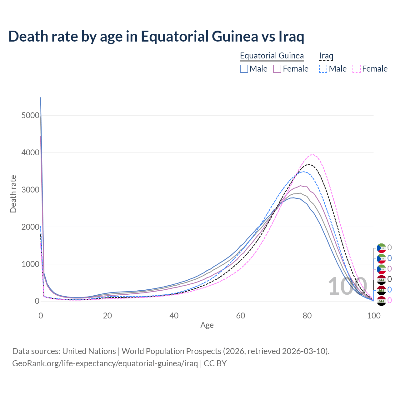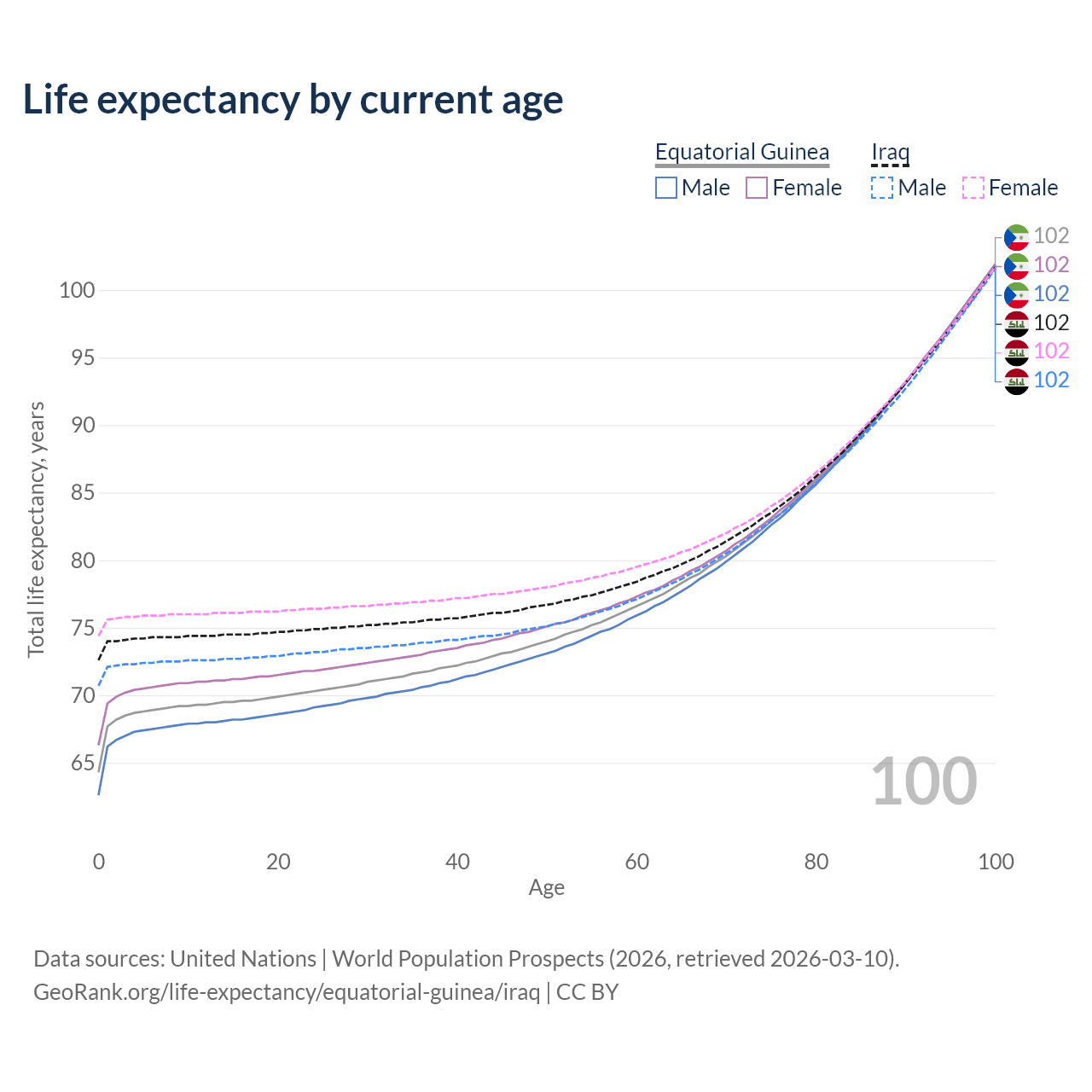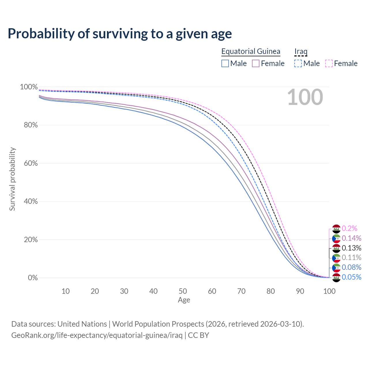 This life expectancy calculator shows the odds of living to 100, 95, 90, and below based on current age for both males and females in Equatorial Guinea and Iraq, along with mean and median age of death. The calculations are based on the 2026 life tables (actuarial tables) from the UN World Population Prospects.