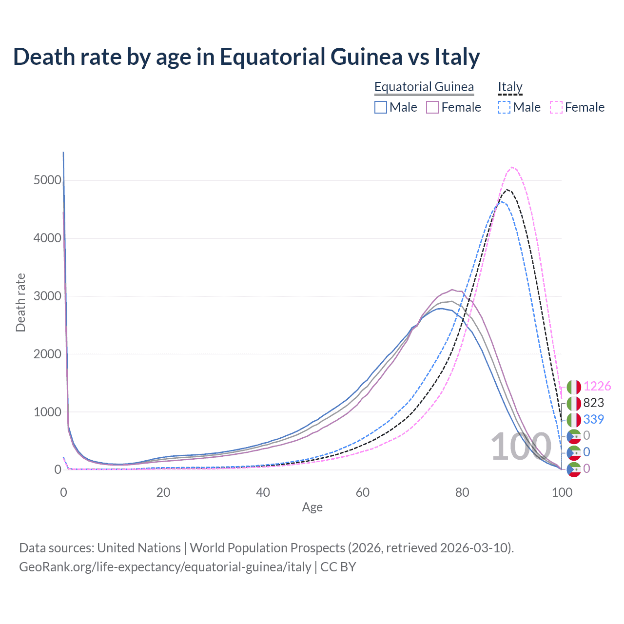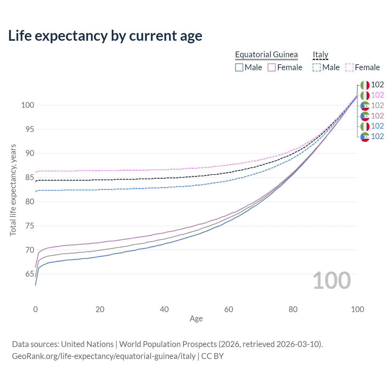 This life expectancy calculator shows the odds of living to 100, 95, 90, and below based on current age for both males and females in Equatorial Guinea and Italy, along with mean and median age of death. The calculations are based on the 2026 life tables (actuarial tables) from the UN World Population Prospects.