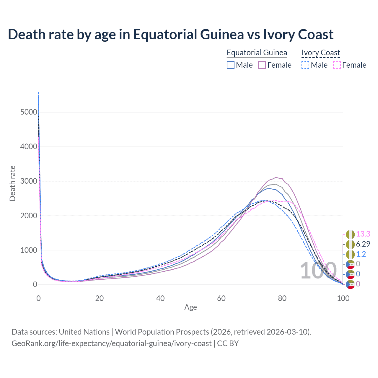 In Equatorial Guinea, the most common age of death is 0, compared to 0 in Ivory Coast. The median age of death is 71.3 in Equatorial Guinea and 68.6 in Ivory Coast, meaning only half of each cohort is expected to live past that age.