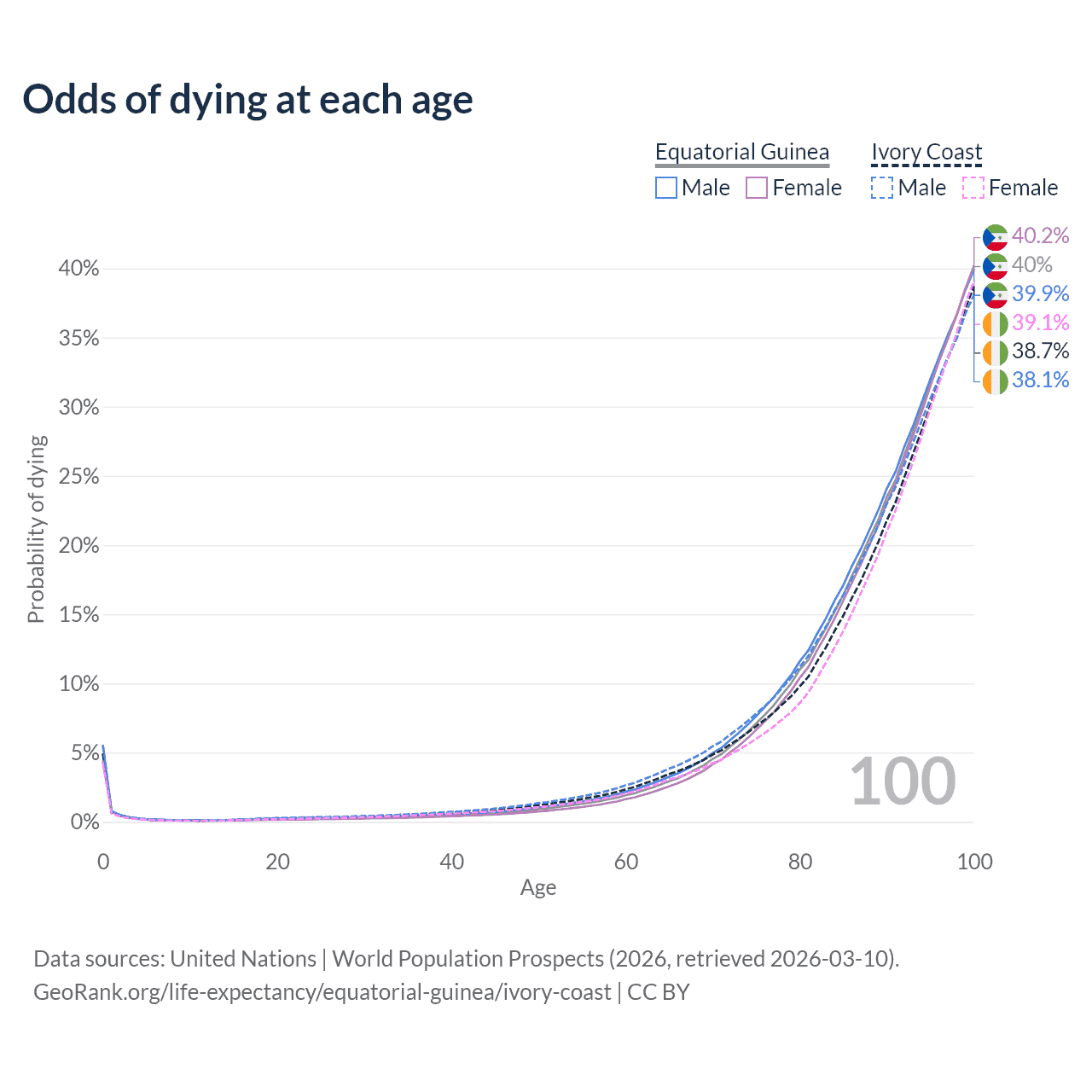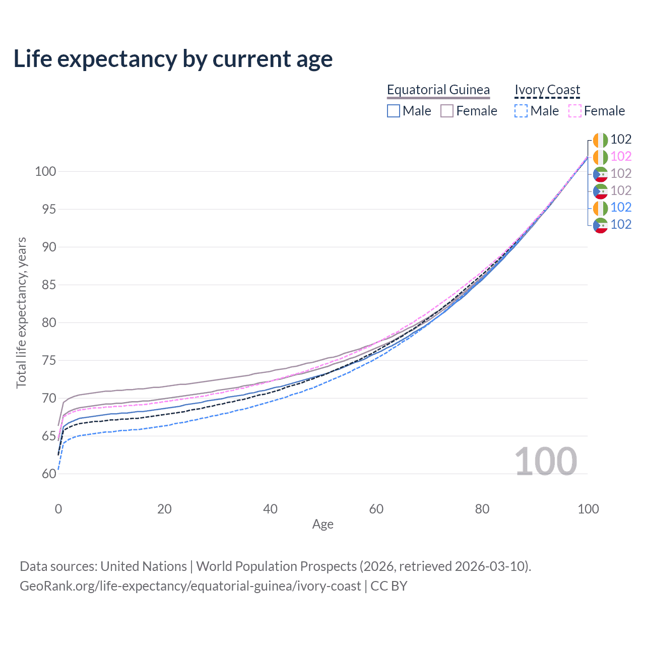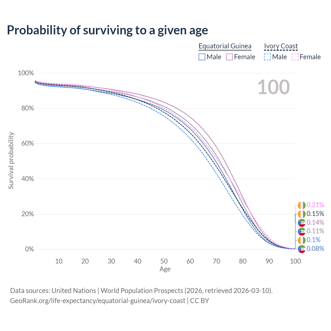 This life expectancy calculator shows the odds of living to 100, 95, 90, and below based on current age for both males and females in Equatorial Guinea and Ivory Coast, along with mean and median age of death. The calculations are based on the 2026 life tables (actuarial tables) from the UN World Population Prospects.