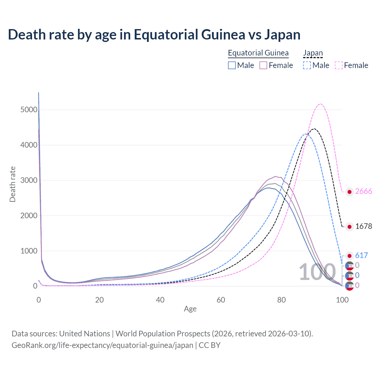 In Equatorial Guinea, the most common age of death is 0, compared to 91 in Japan. The median age of death is 71.3 in Equatorial Guinea and 88.1 in Japan, meaning only half of each cohort is expected to live past that age.