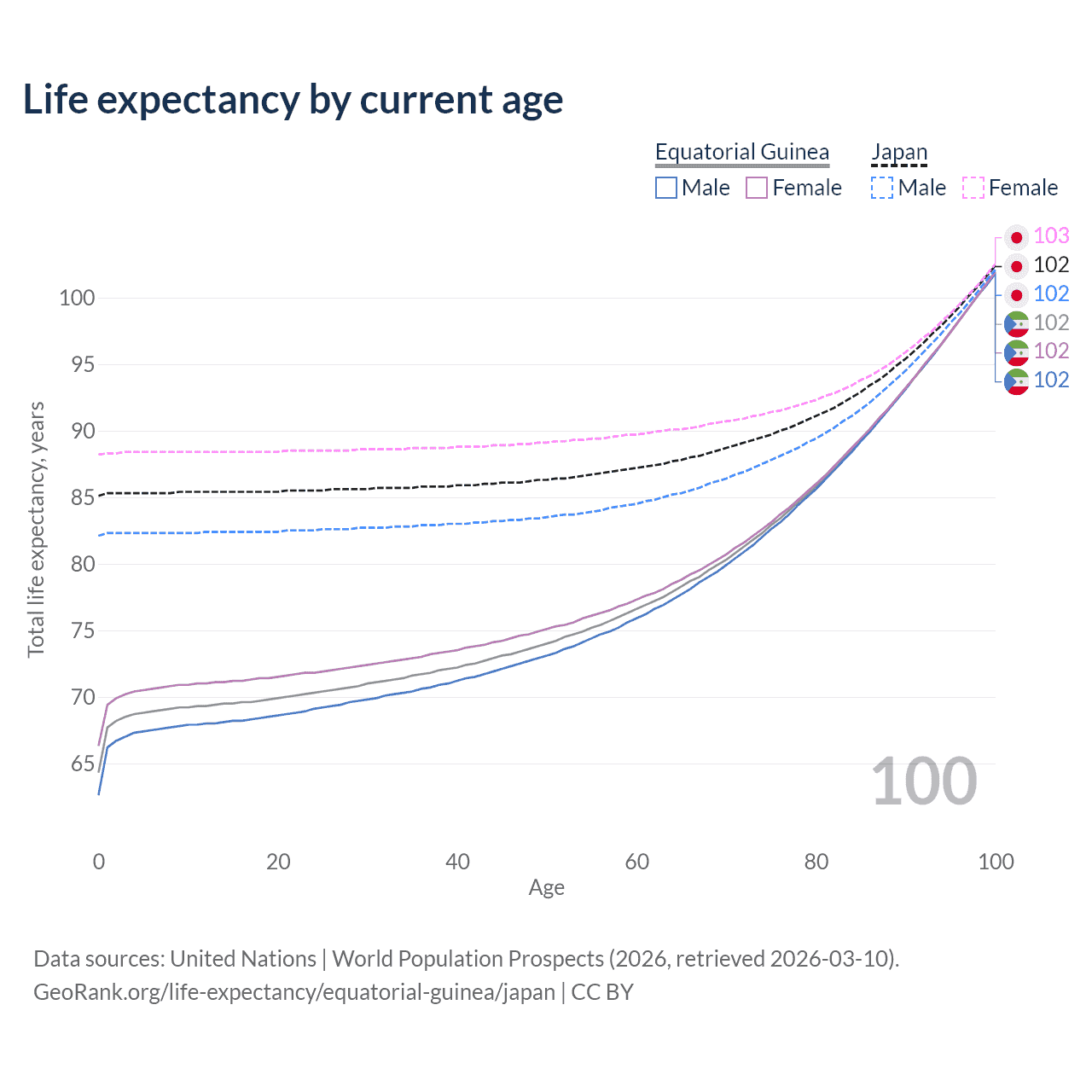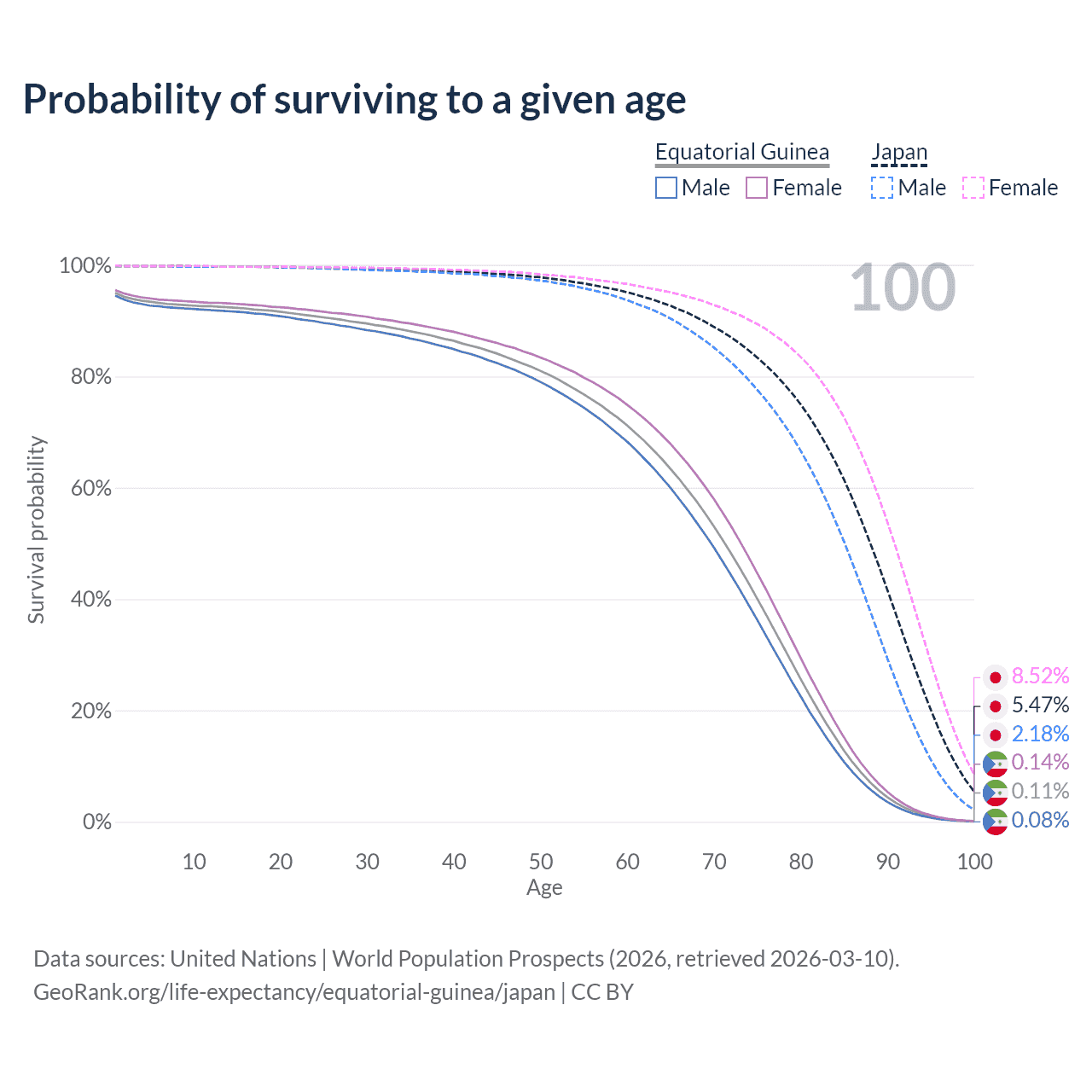 This life expectancy calculator shows the odds of living to 100, 95, 90, and below based on current age for both males and females in Equatorial Guinea and Japan, along with mean and median age of death. The calculations are based on the 2026 life tables (actuarial tables) from the UN World Population Prospects.