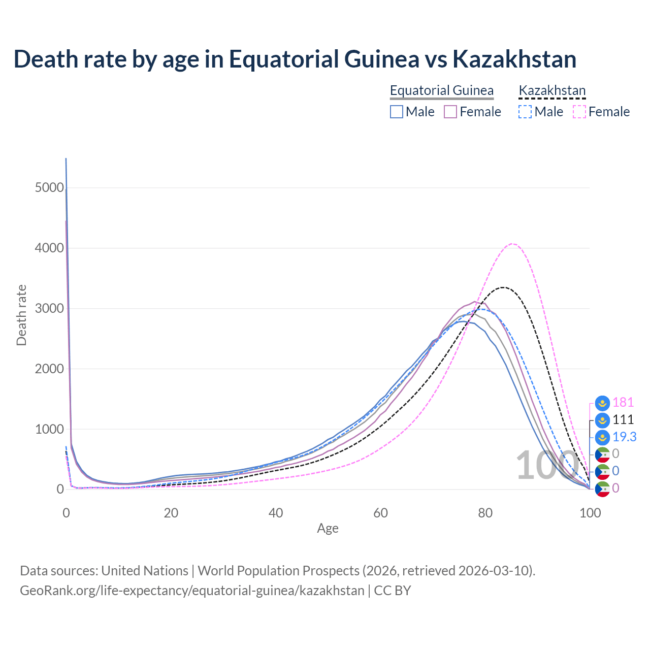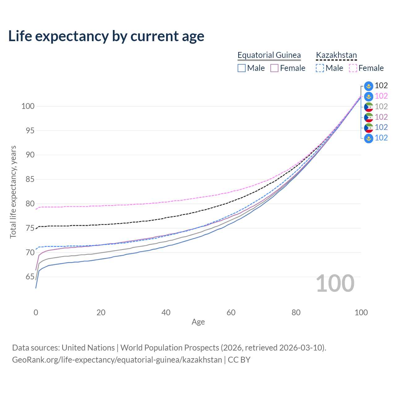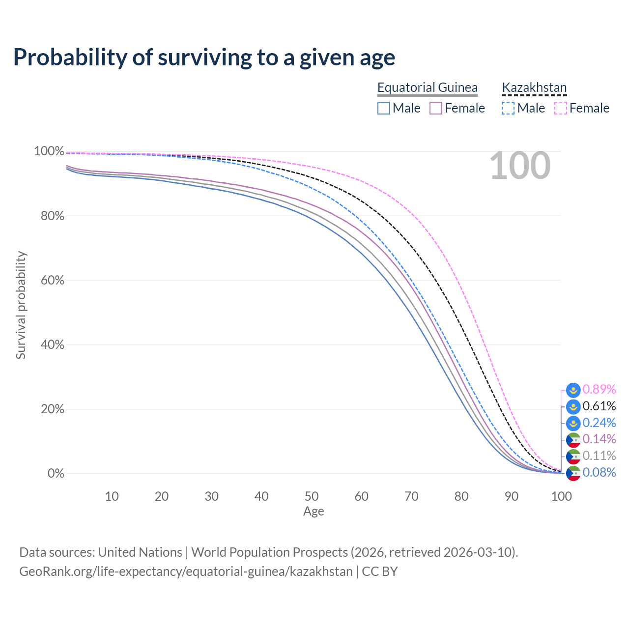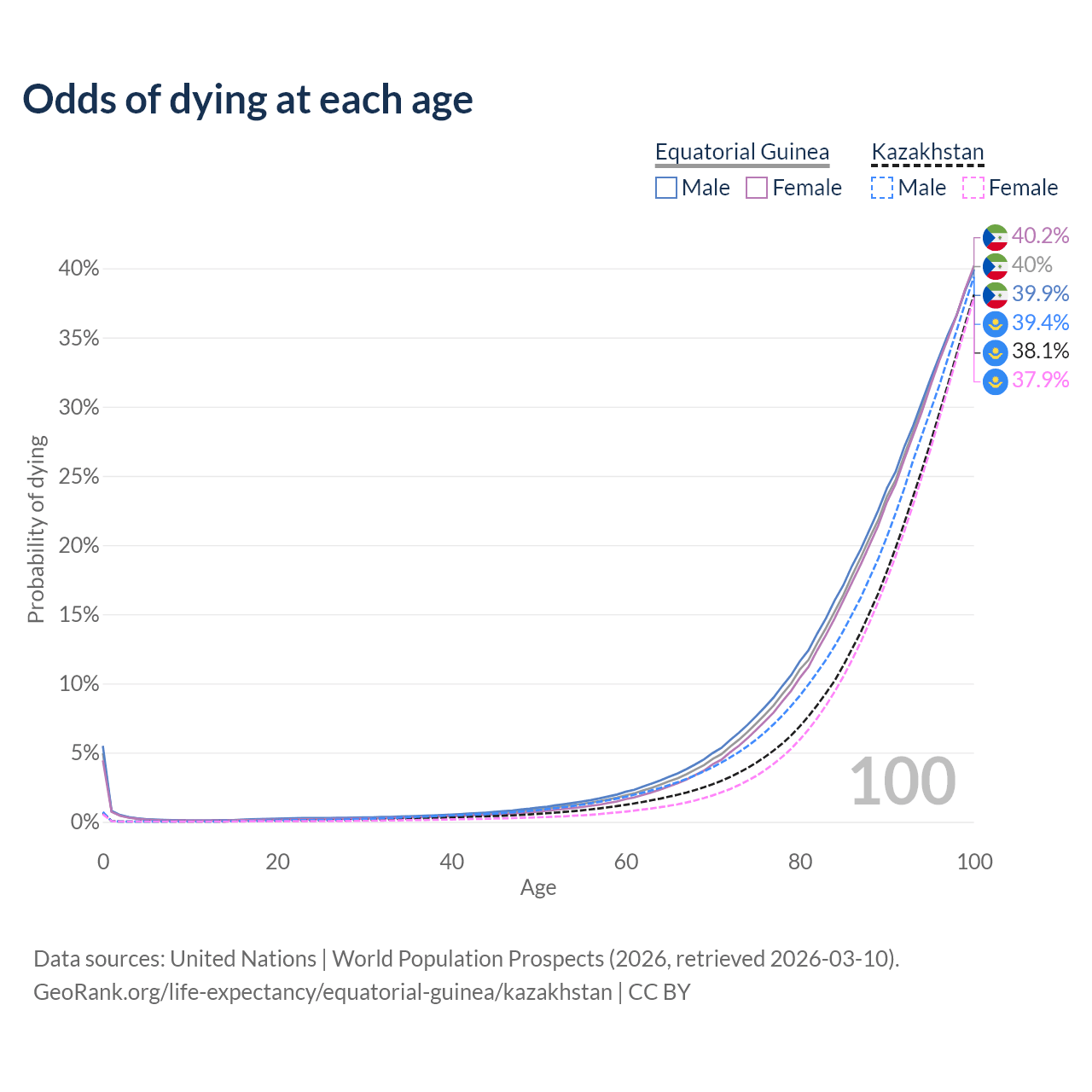 This life expectancy calculator shows the odds of living to 100, 95, 90, and below based on current age for both males and females in Equatorial Guinea and Kazakhstan, along with mean and median age of death. The calculations are based on the 2026 life tables (actuarial tables) from the UN World Population Prospects.