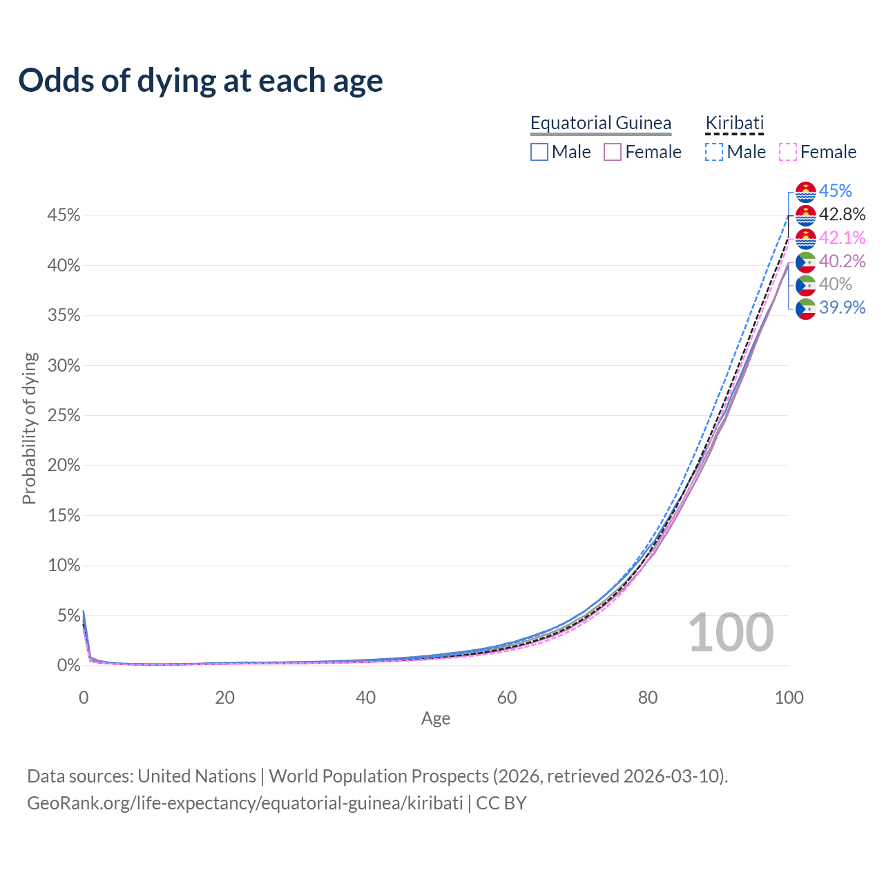 This life expectancy calculator shows the odds of living to 100, 95, 90, and below based on current age for both males and females in Equatorial Guinea and Kiribati, along with mean and median age of death. The calculations are based on the 2026 life tables (actuarial tables) from the UN World Population Prospects.