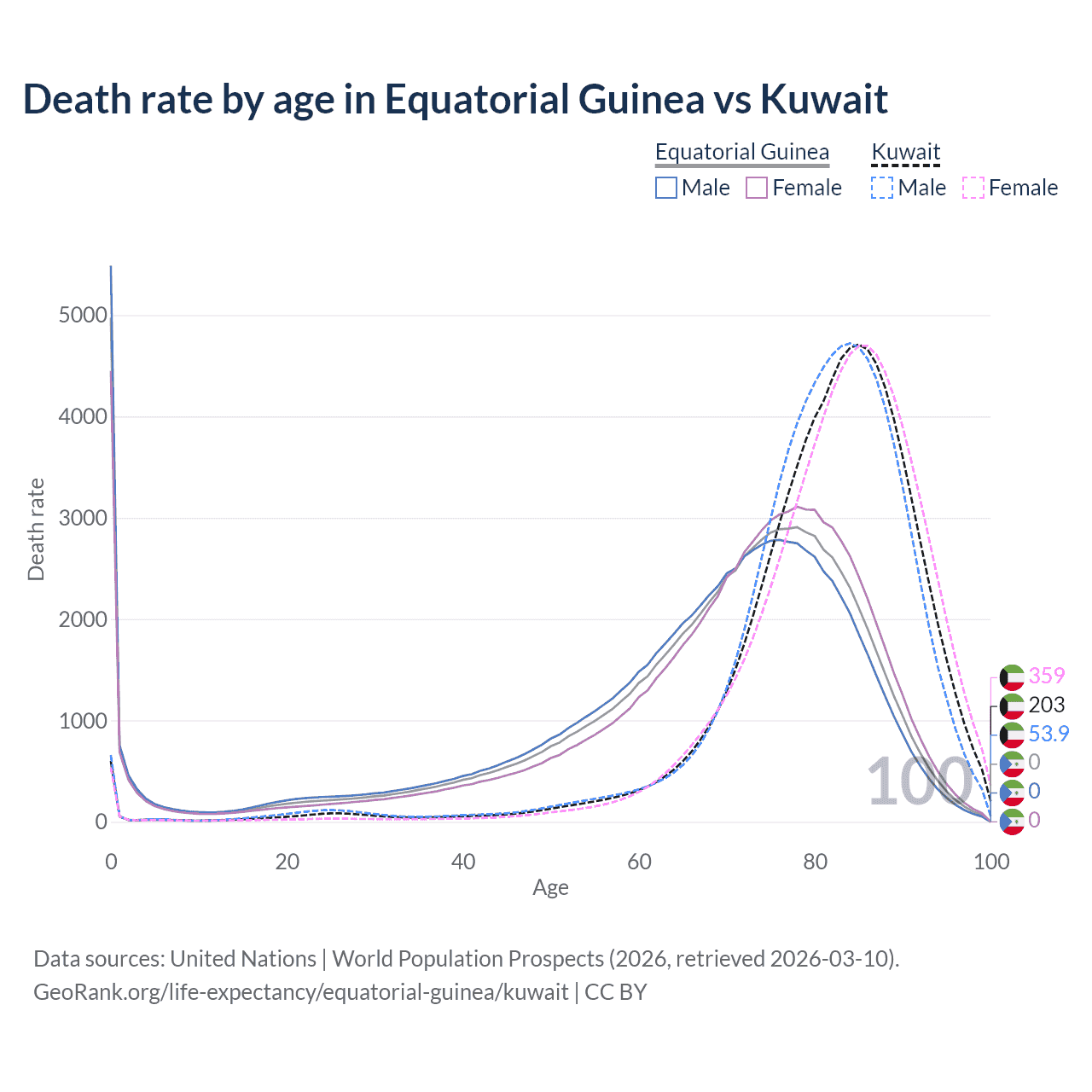 In Equatorial Guinea, the most common age of death is 0, compared to 85 in Kuwait. The median age of death is 71.3 in Equatorial Guinea and 83.3 in Kuwait, meaning only half of each cohort is expected to live past that age.