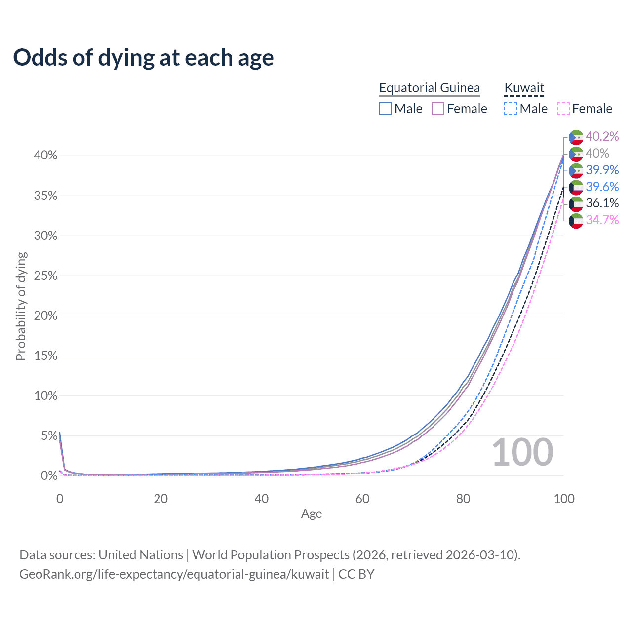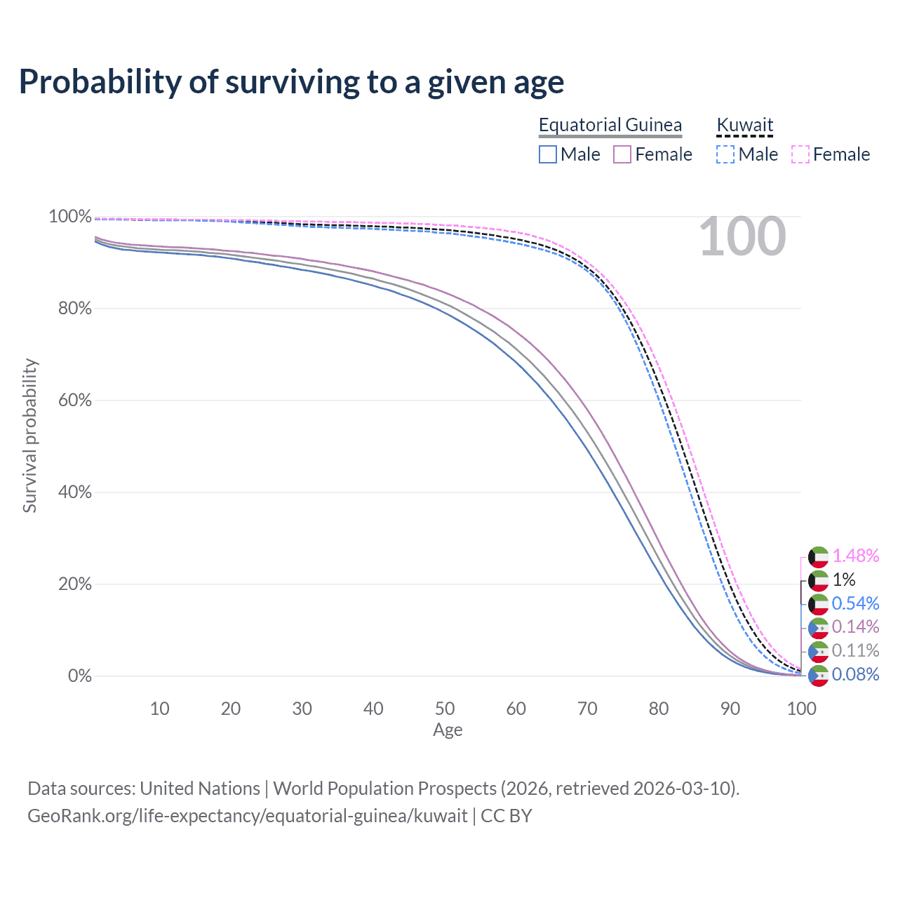 This life expectancy calculator shows the odds of living to 100, 95, 90, and below based on current age for both males and females in Equatorial Guinea and Kuwait, along with mean and median age of death. The calculations are based on the 2026 life tables (actuarial tables) from the UN World Population Prospects.