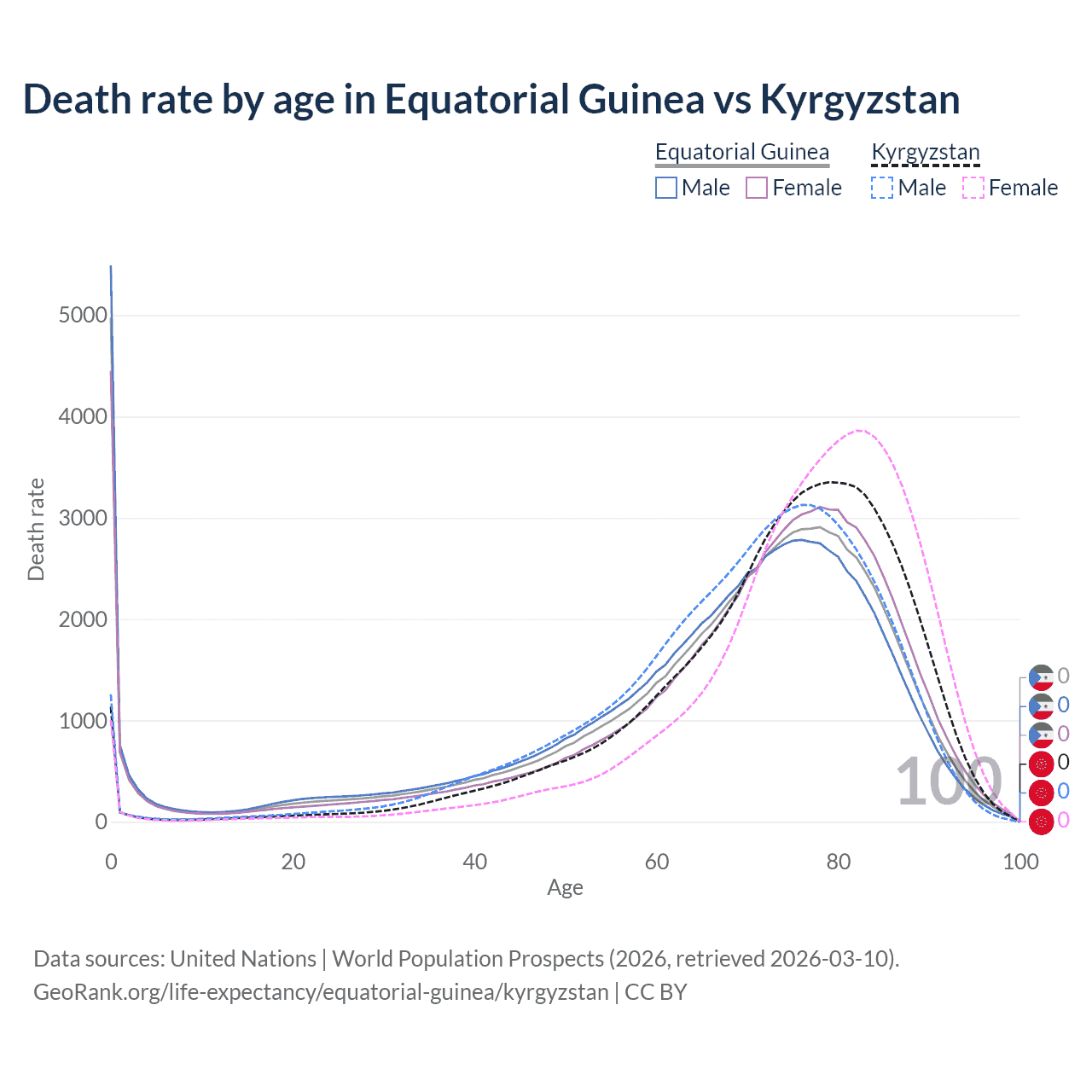 In Equatorial Guinea, the most common age of death is 0, compared to 79 in Kyrgyzstan. The median age of death is 71.3 in Equatorial Guinea and 75.6 in Kyrgyzstan, meaning only half of each cohort is expected to live past that age.