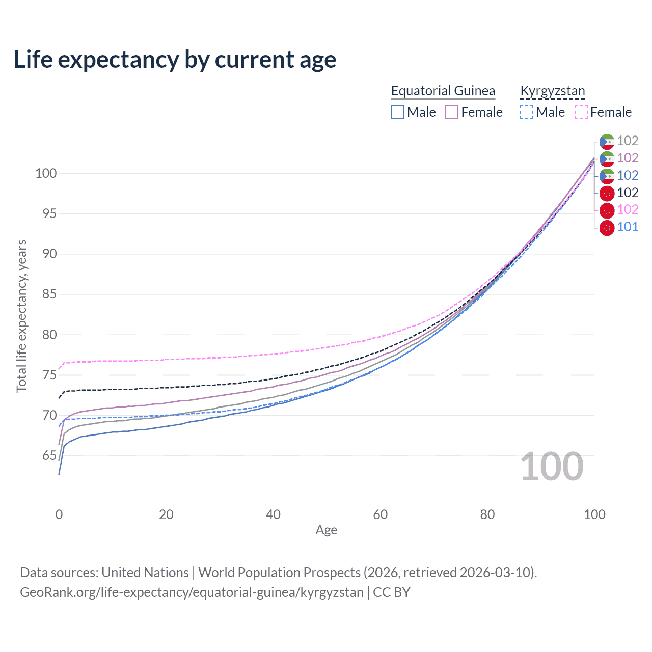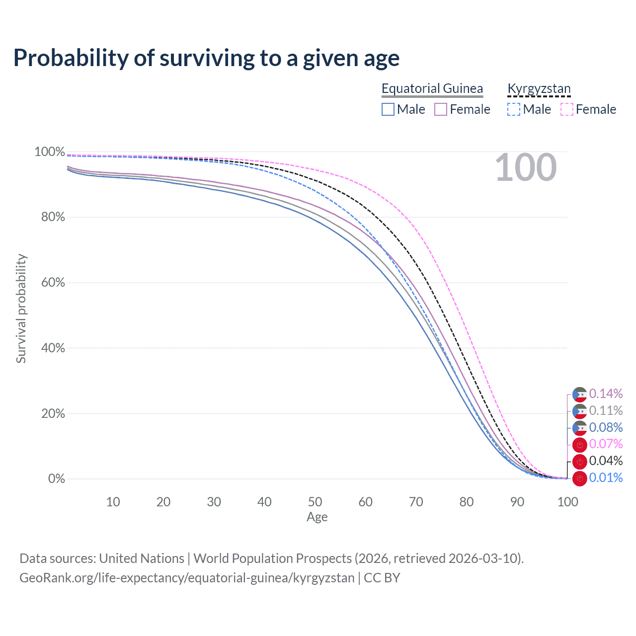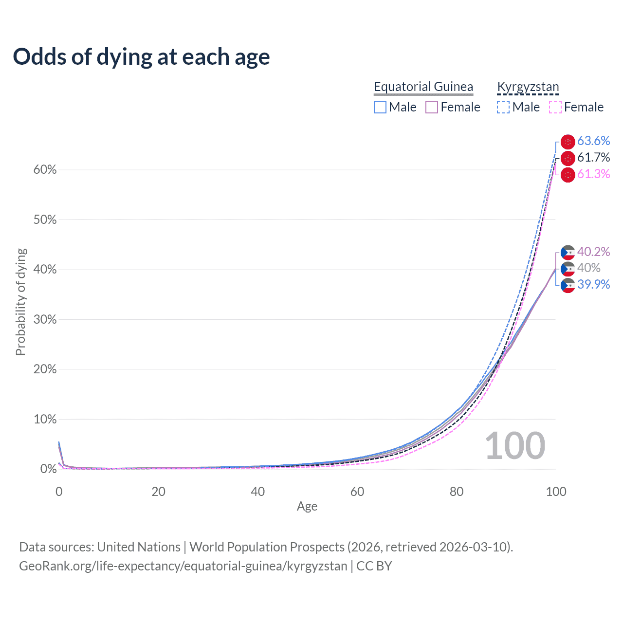 This life expectancy calculator shows the odds of living to 100, 95, 90, and below based on current age for both males and females in Equatorial Guinea and Kyrgyzstan, along with mean and median age of death. The calculations are based on the 2026 life tables (actuarial tables) from the UN World Population Prospects.