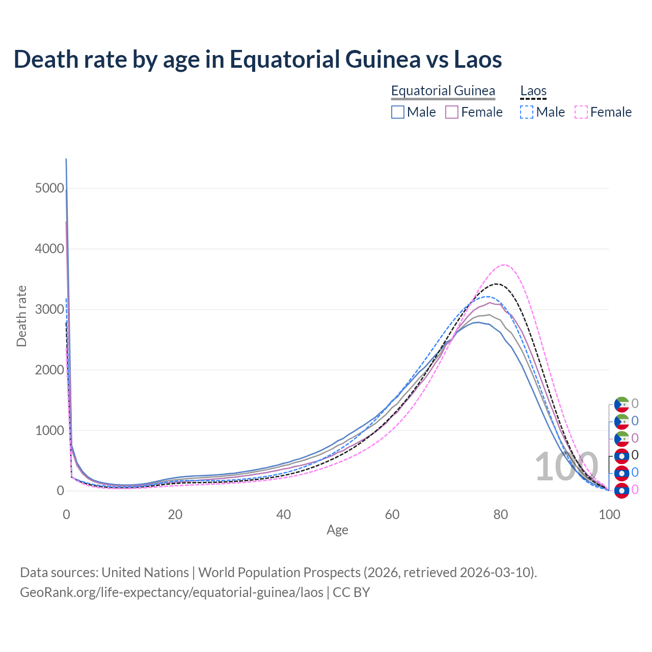 In Equatorial Guinea, the most common age of death is 0, compared to 79 in Laos. The median age of death is 71.3 in Equatorial Guinea and 74.7 in Laos, meaning only half of each cohort is expected to live past that age.