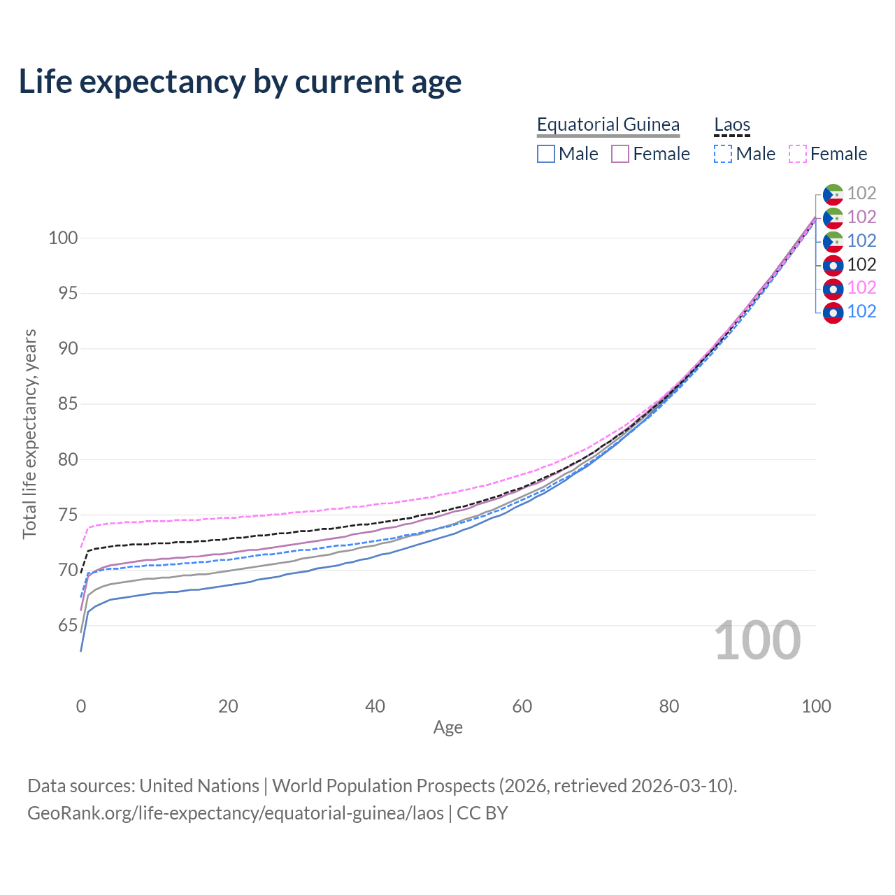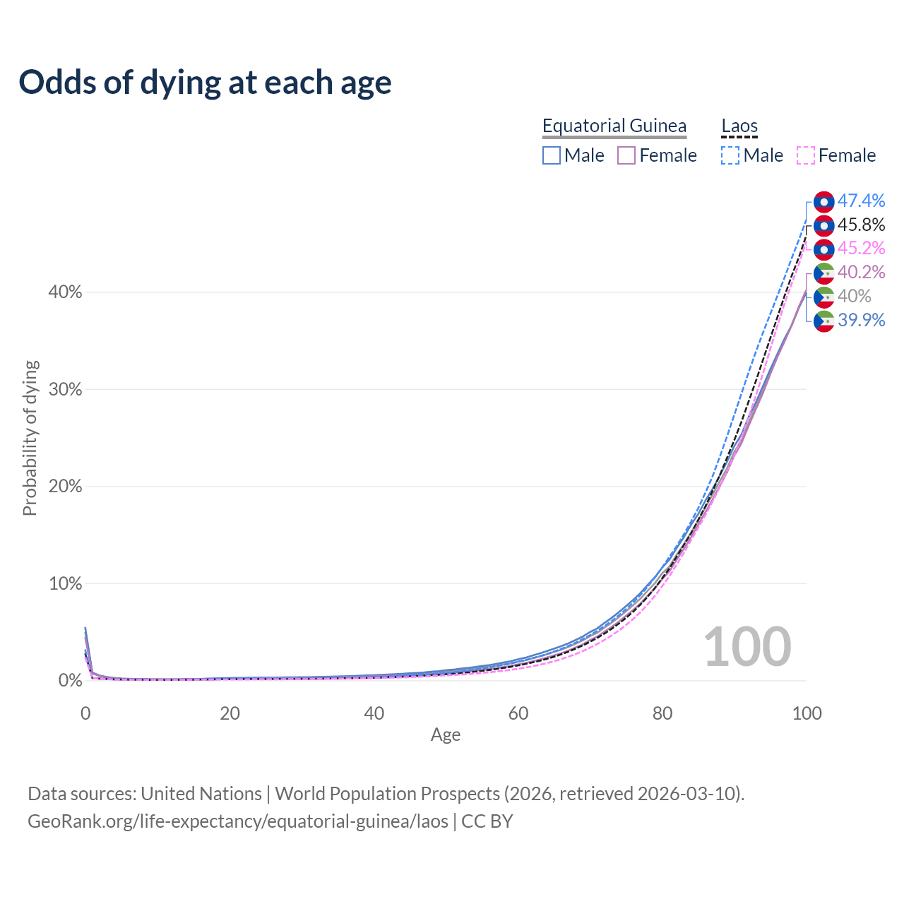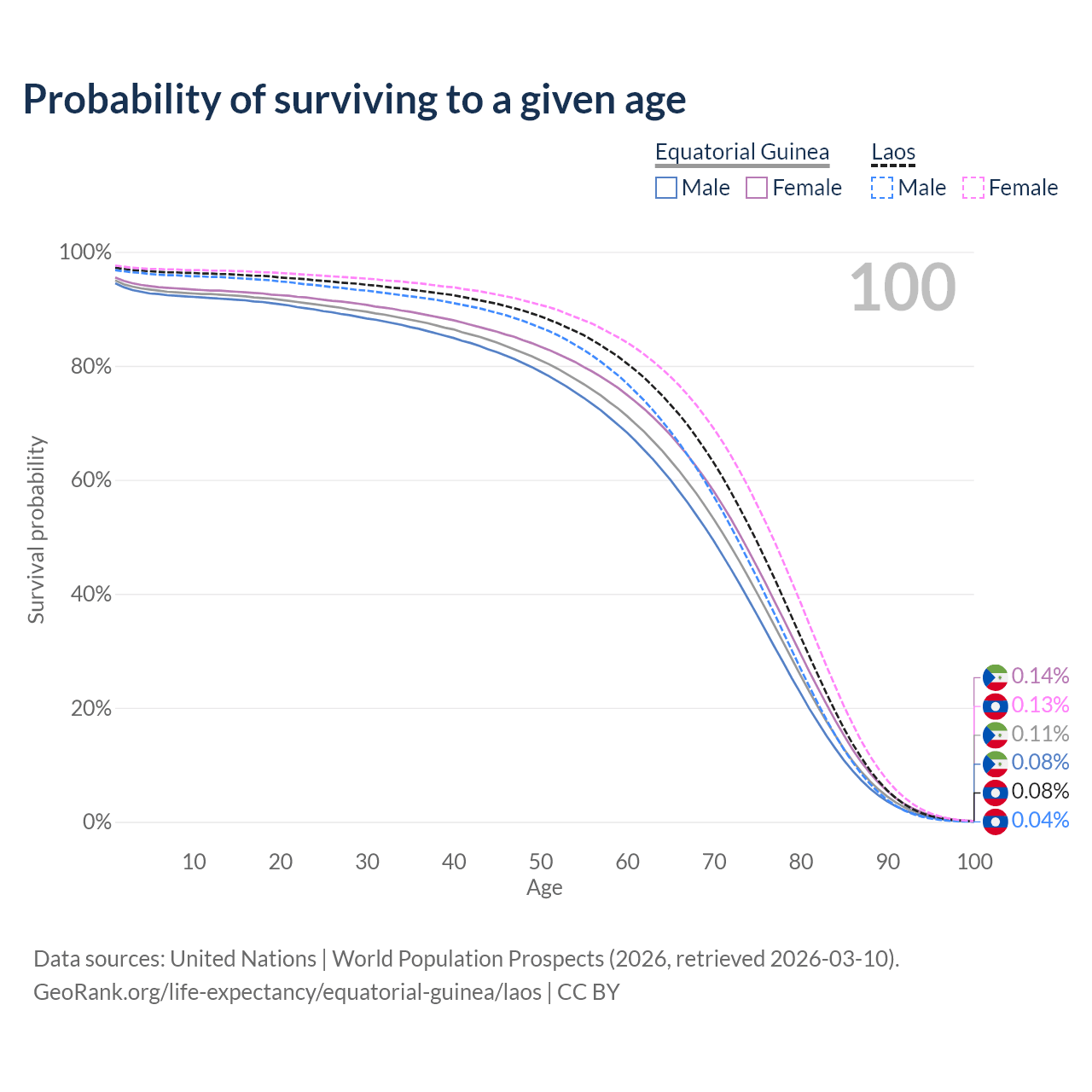 This life expectancy calculator shows the odds of living to 100, 95, 90, and below based on current age for both males and females in Equatorial Guinea and Laos, along with mean and median age of death. The calculations are based on the 2026 life tables (actuarial tables) from the UN World Population Prospects.