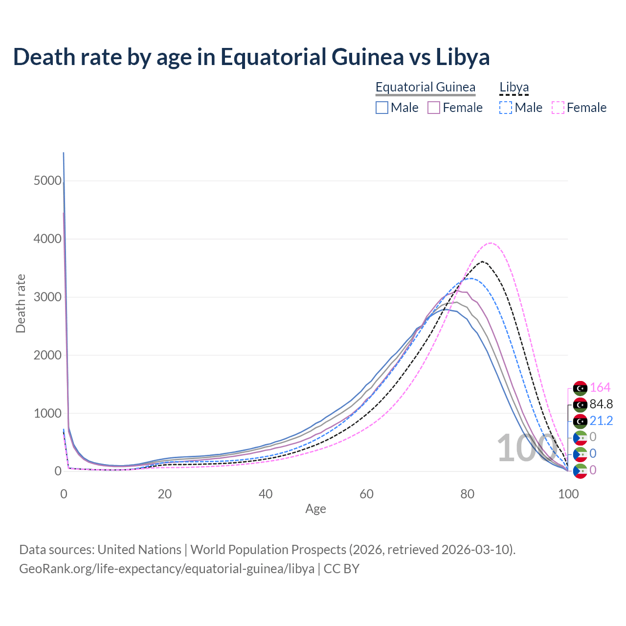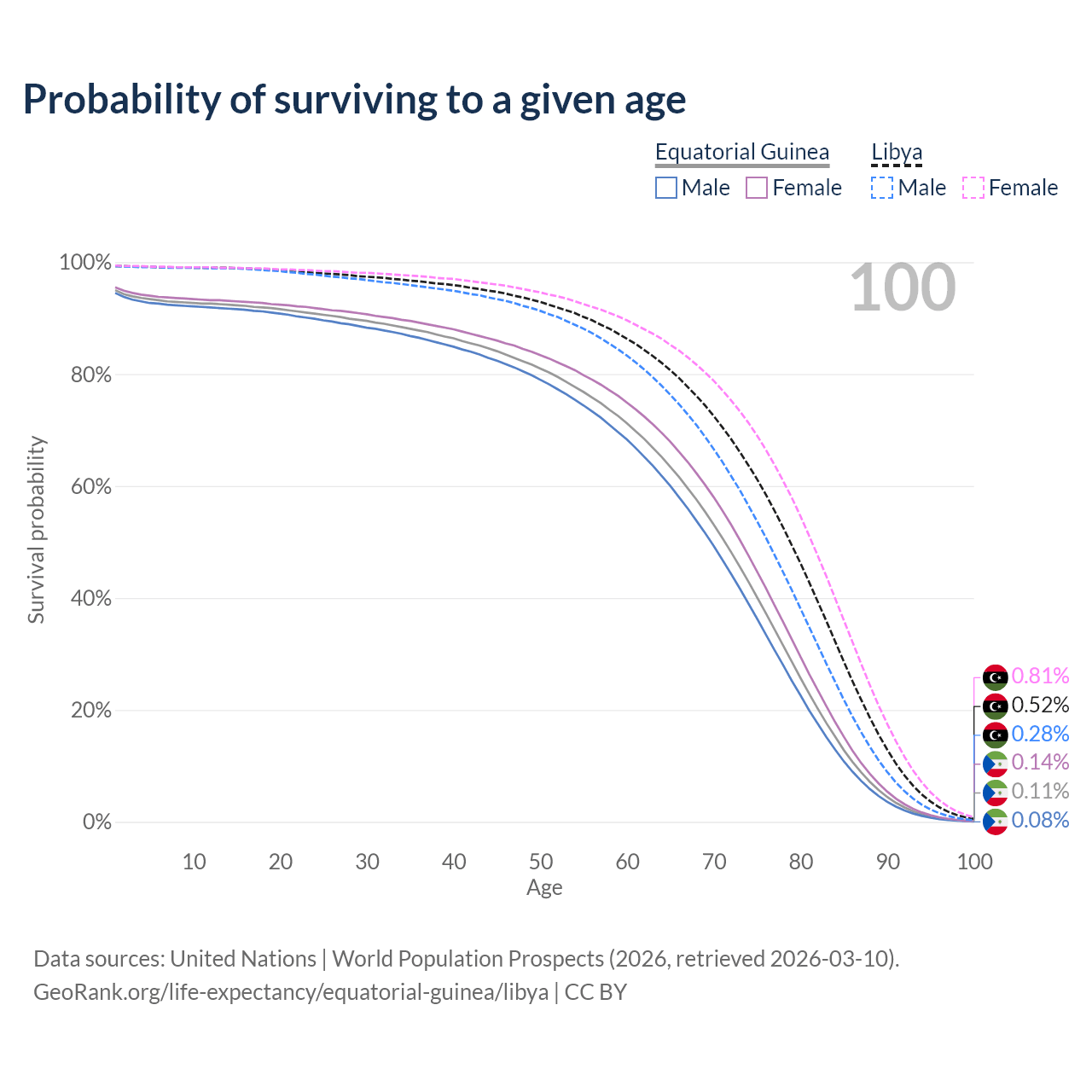 This life expectancy calculator shows the odds of living to 100, 95, 90, and below based on current age for both males and females in Equatorial Guinea and Libya, along with mean and median age of death. The calculations are based on the 2026 life tables (actuarial tables) from the UN World Population Prospects.
