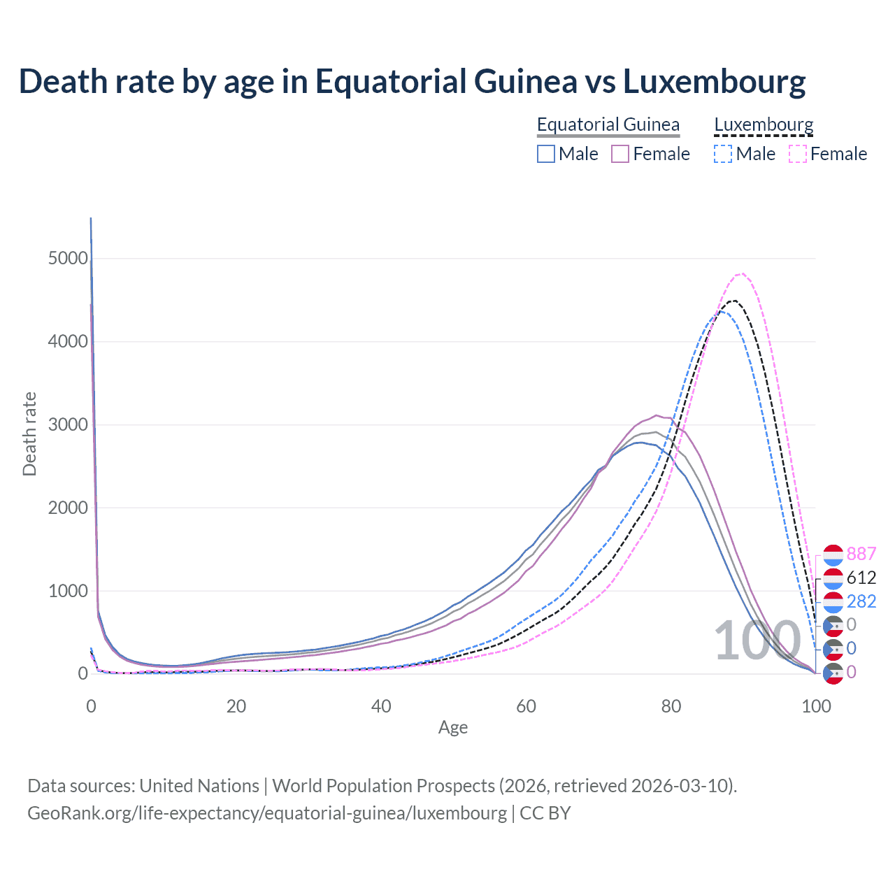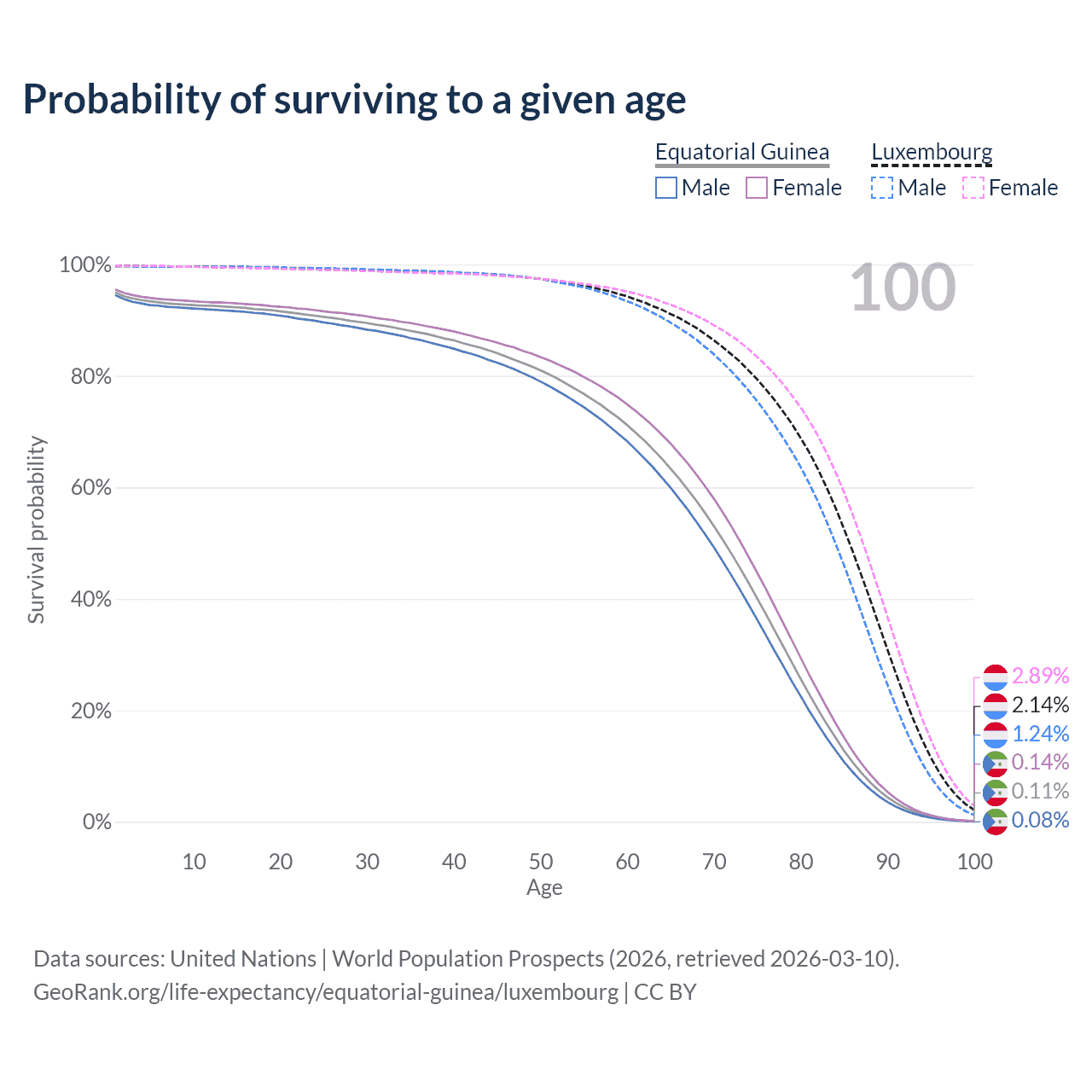 This life expectancy calculator shows the odds of living to 100, 95, 90, and below based on current age for both males and females in Equatorial Guinea and Luxembourg, along with mean and median age of death. The calculations are based on the 2026 life tables (actuarial tables) from the UN World Population Prospects.