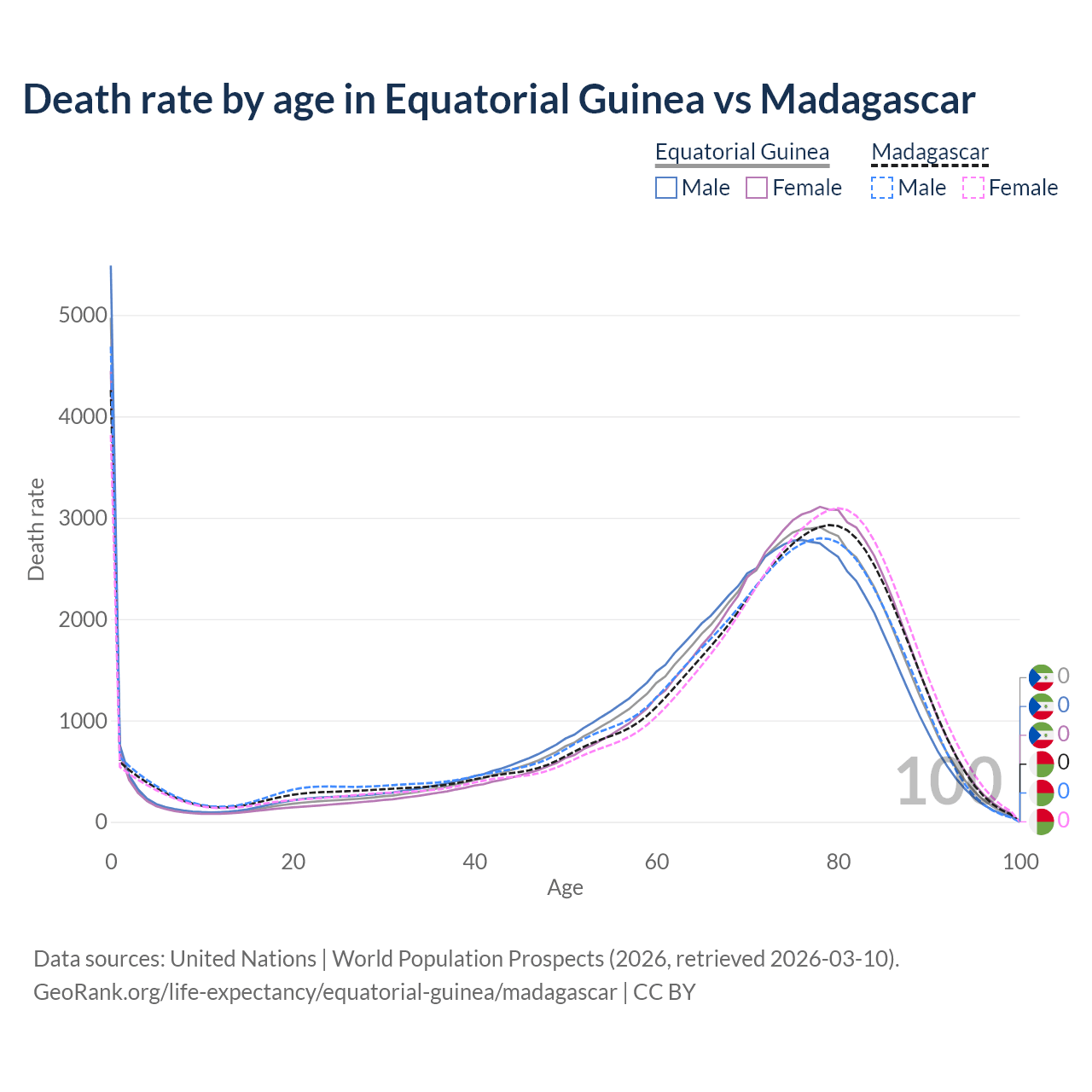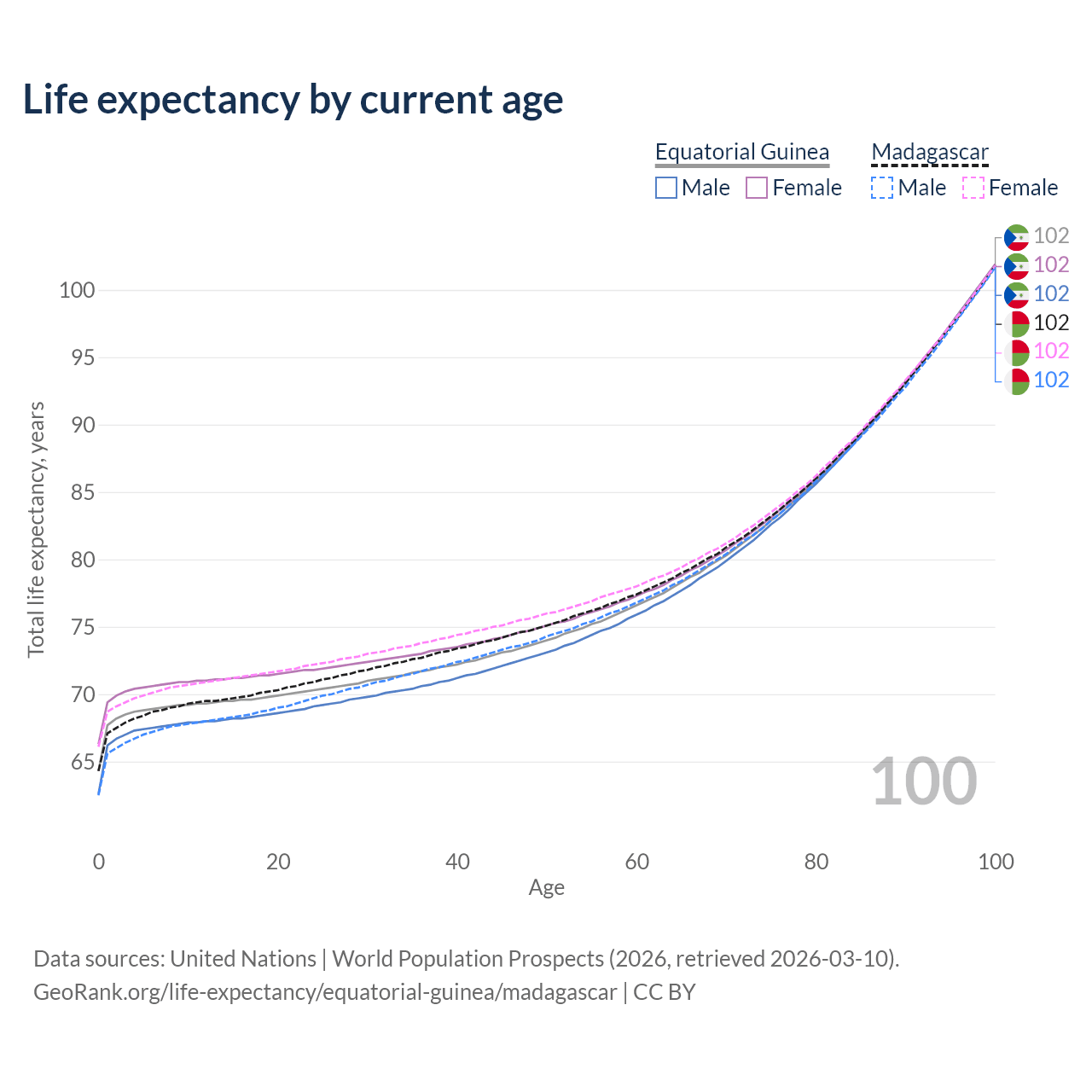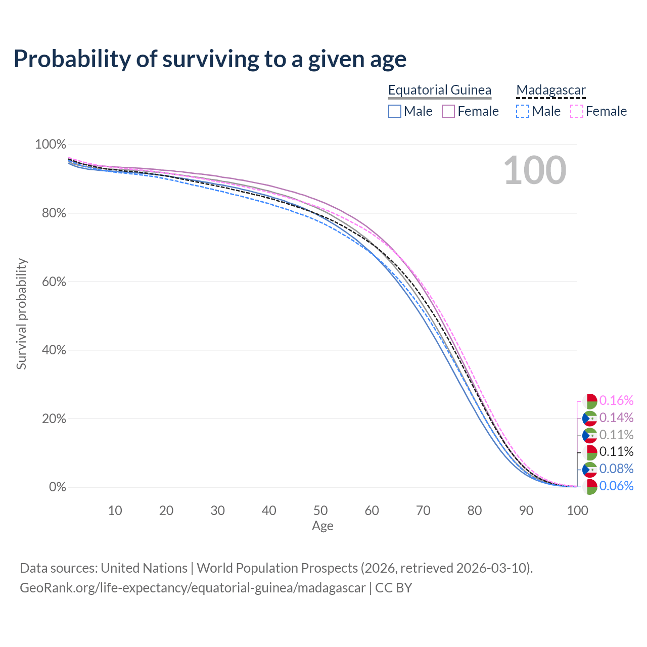 This life expectancy calculator shows the odds of living to 100, 95, 90, and below based on current age for both males and females in Equatorial Guinea and Madagascar, along with mean and median age of death. The calculations are based on the 2026 life tables (actuarial tables) from the UN World Population Prospects.