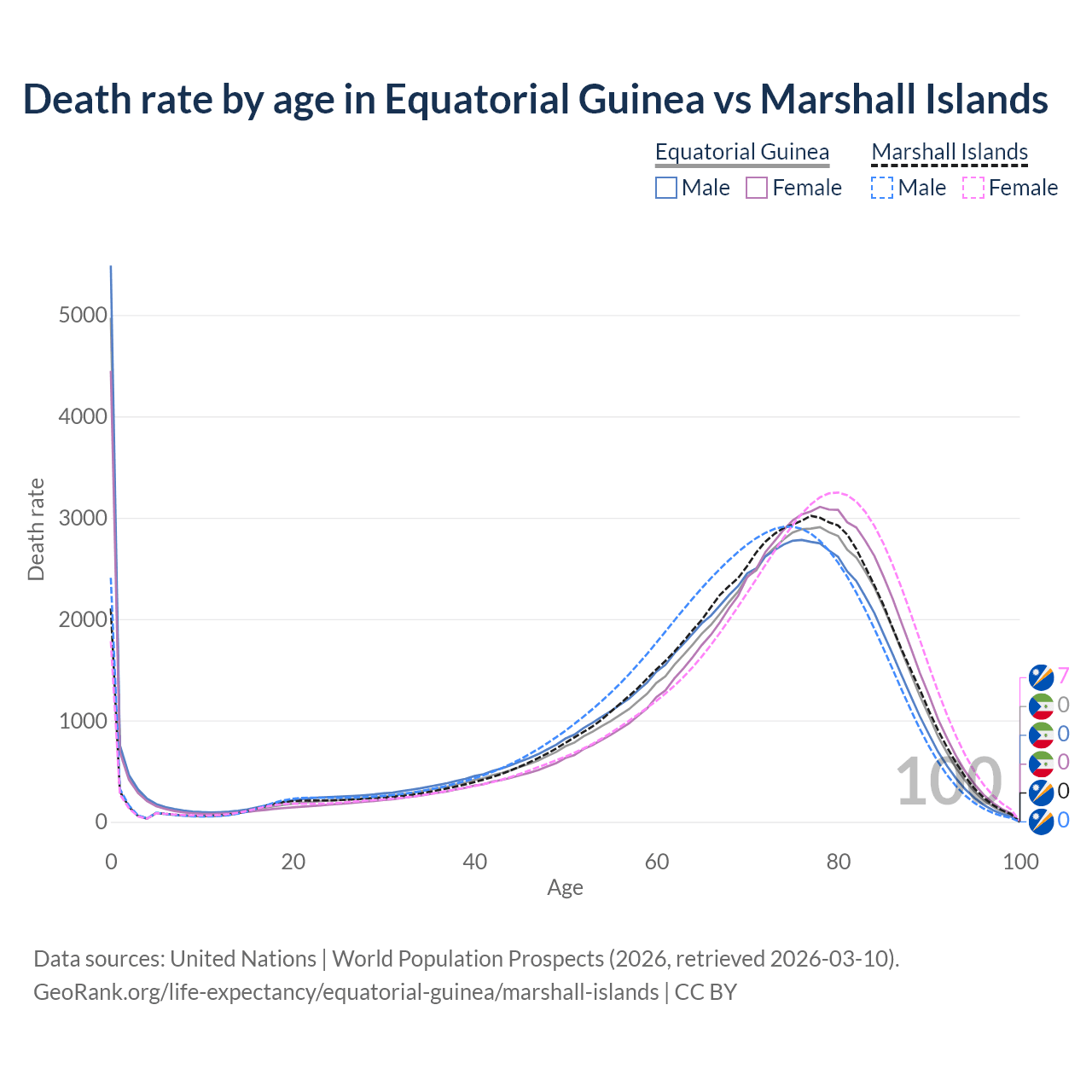 In Equatorial Guinea, the most common age of death is 0, compared to 77 in the Marshall Islands. The median age of death is 71.3 in Equatorial Guinea and 72 in the Marshall Islands, meaning only half of each cohort is expected to live past that age.