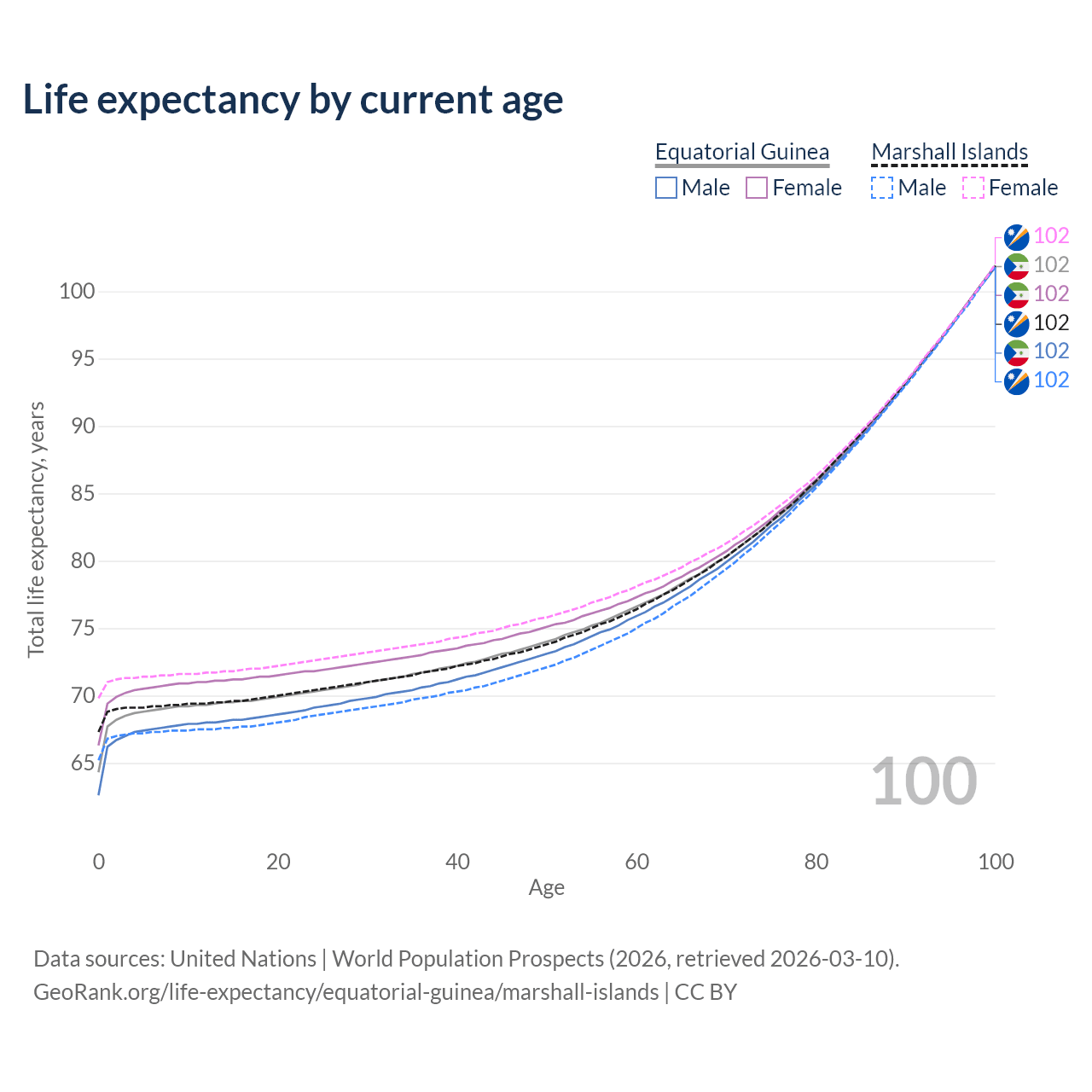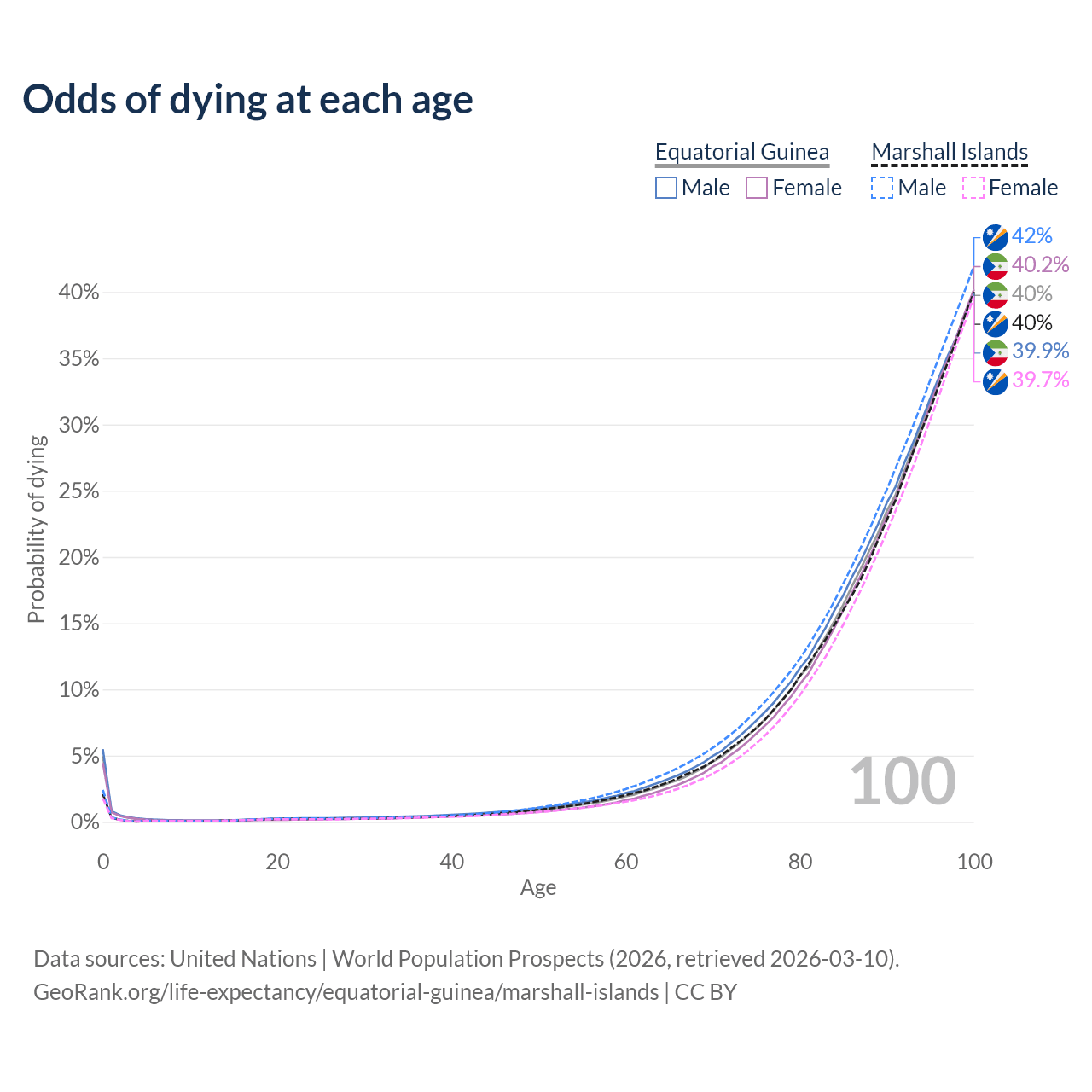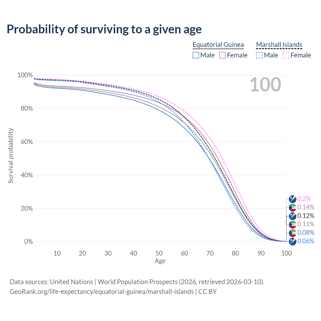 This life expectancy calculator shows the odds of living to 100, 95, 90, and below based on current age for both males and females in Equatorial Guinea and the Marshall Islands, along with mean and median age of death. The calculations are based on the 2026 life tables (actuarial tables) from the UN World Population Prospects.