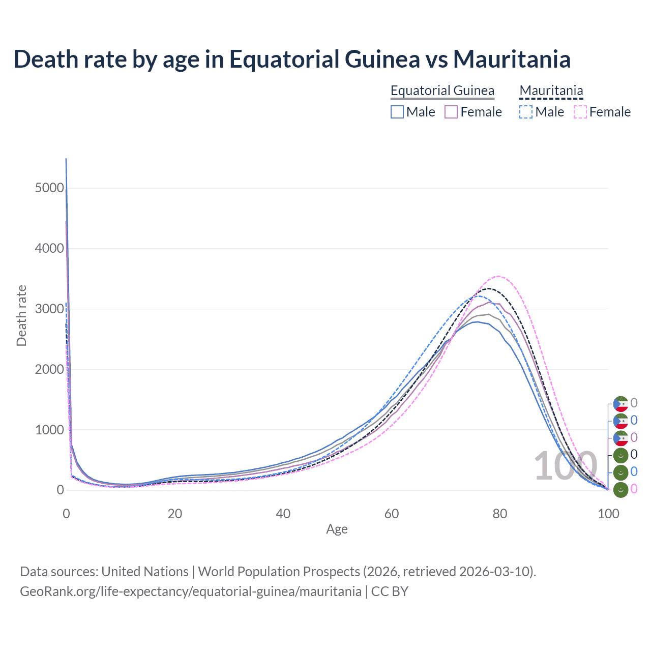 In Equatorial Guinea, the most common age of death is 0, compared to 78 in Mauritania. The median age of death is 71.3 in Equatorial Guinea and 74.1 in Mauritania, meaning only half of each cohort is expected to live past that age.