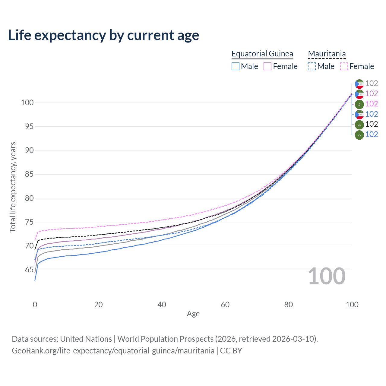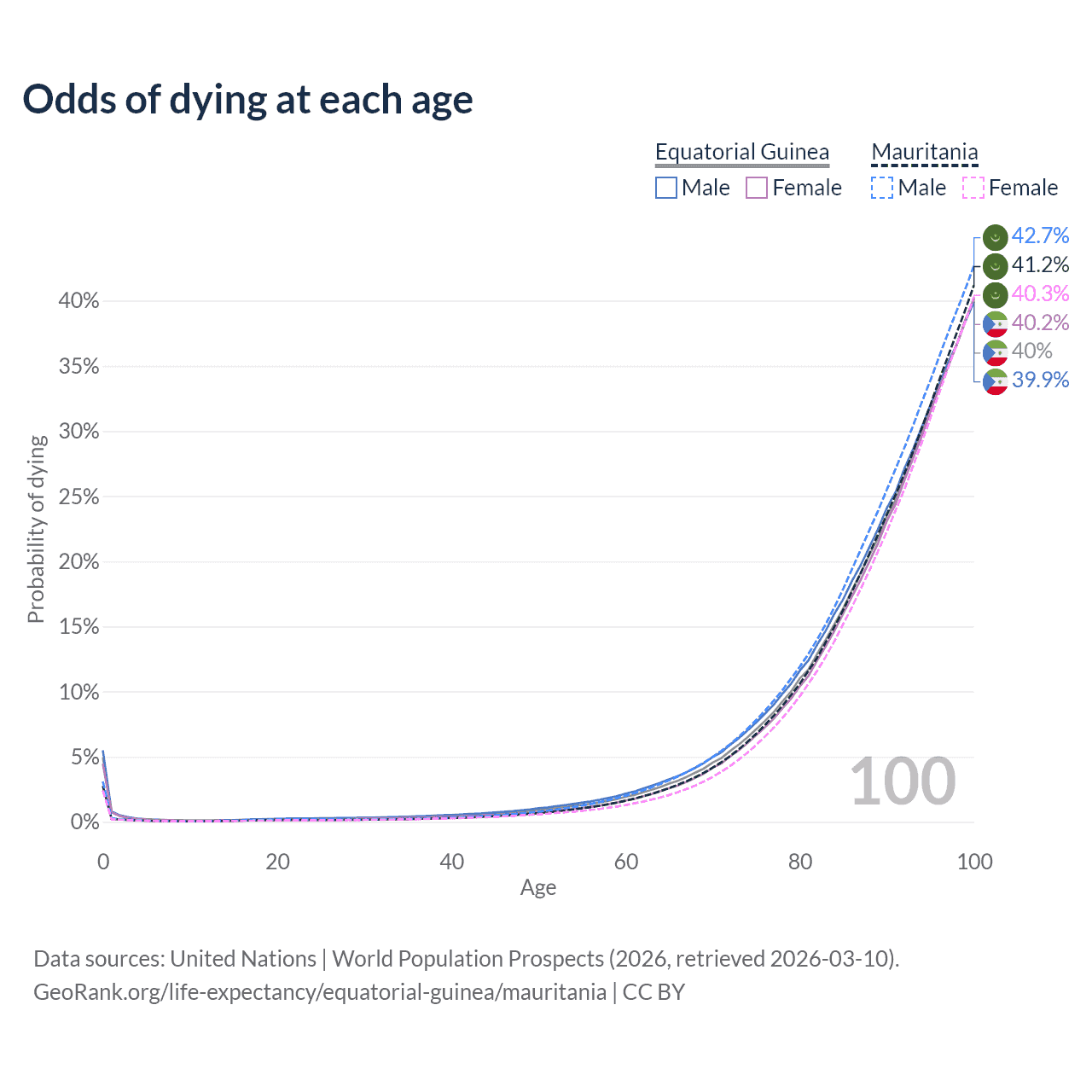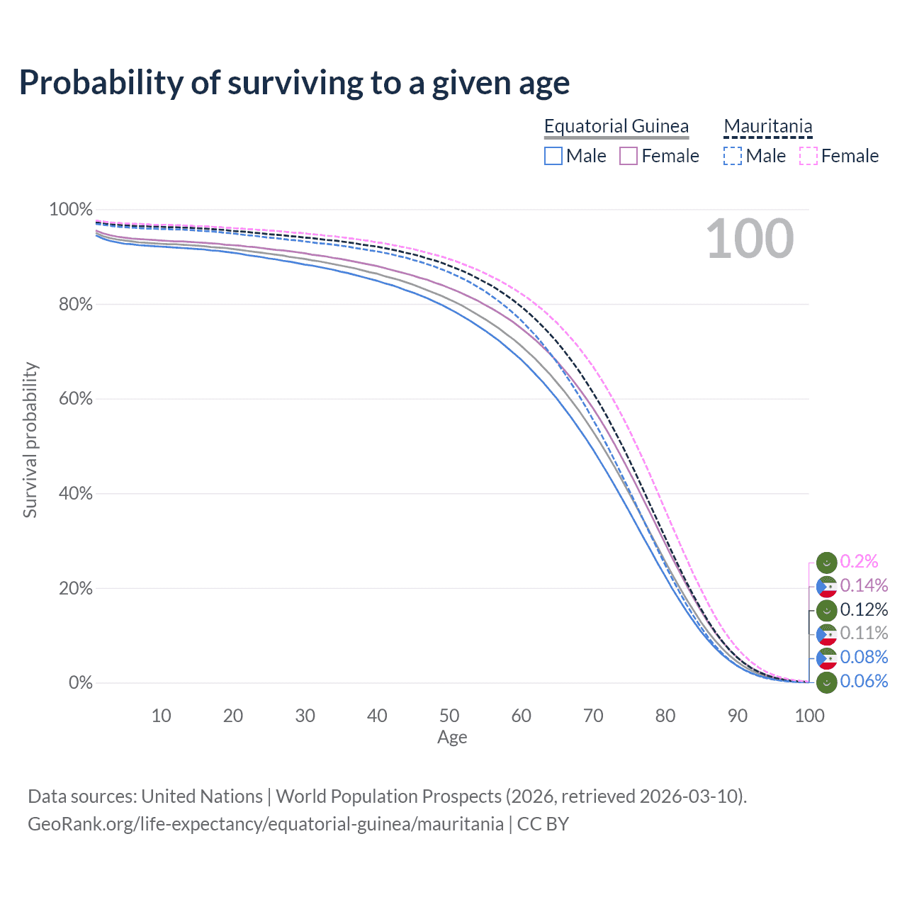 This life expectancy calculator shows the odds of living to 100, 95, 90, and below based on current age for both males and females in Equatorial Guinea and Mauritania, along with mean and median age of death. The calculations are based on the 2026 life tables (actuarial tables) from the UN World Population Prospects.