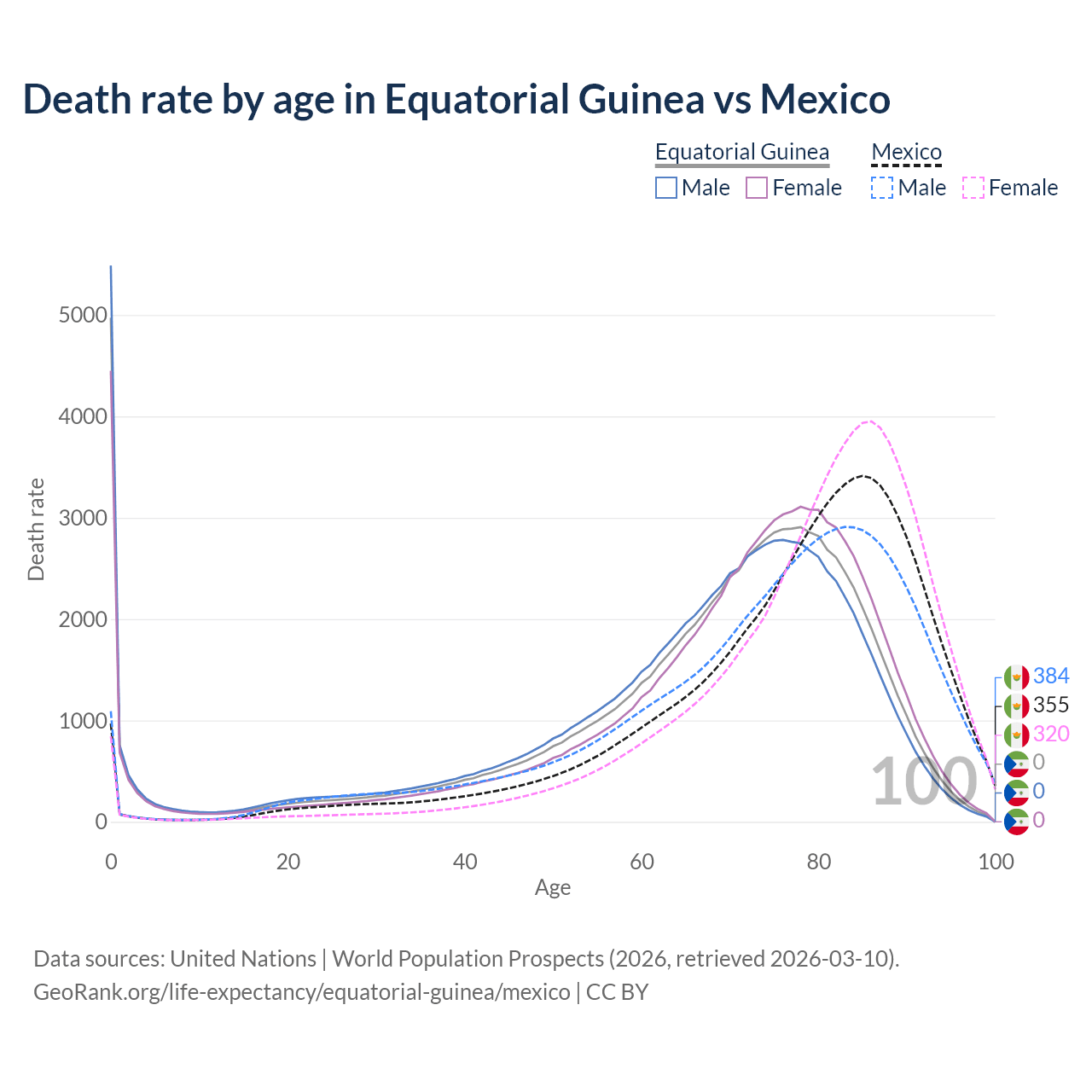 In Equatorial Guinea, the most common age of death is 0, compared to 85 in Mexico. The median age of death is 71.3 in Equatorial Guinea and 80.1 in Mexico, meaning only half of each cohort is expected to live past that age.