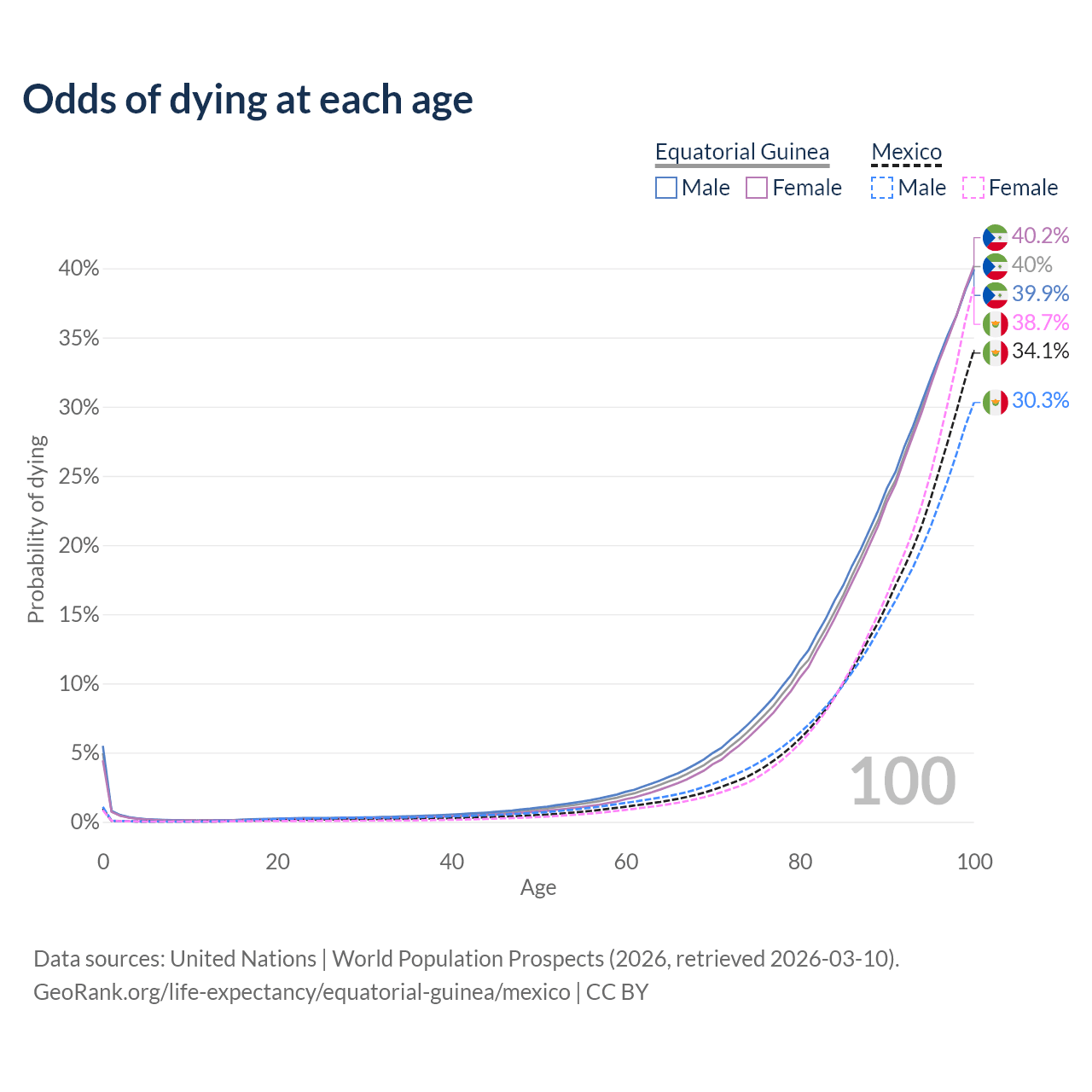 This life expectancy calculator shows the odds of living to 100, 95, 90, and below based on current age for both males and females in Equatorial Guinea and Mexico, along with mean and median age of death. The calculations are based on the 2026 life tables (actuarial tables) from the UN World Population Prospects.
