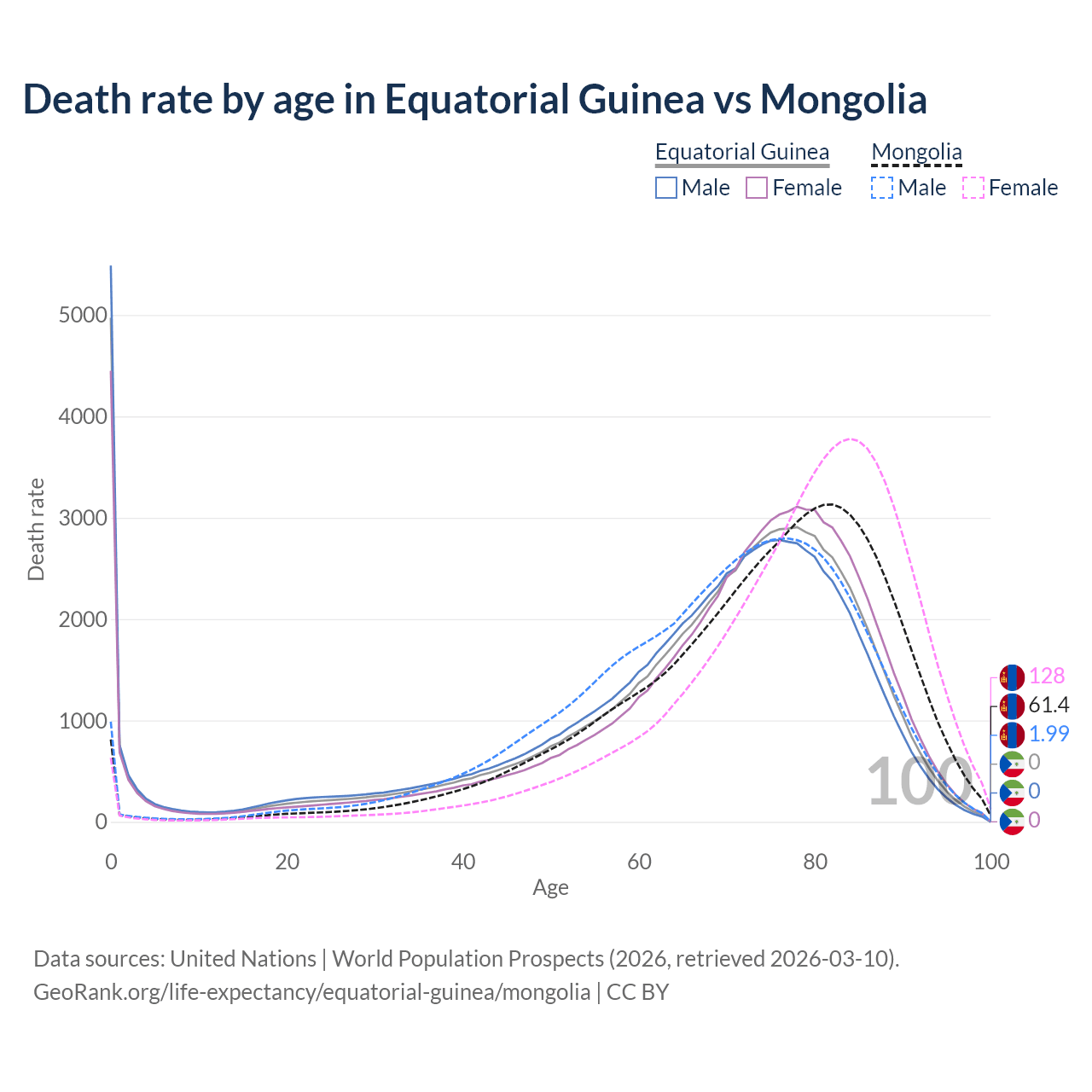 In Equatorial Guinea, the most common age of death is 0, compared to 82 in Mongolia. The median age of death is 71.3 in Equatorial Guinea and 76 in Mongolia, meaning only half of each cohort is expected to live past that age.