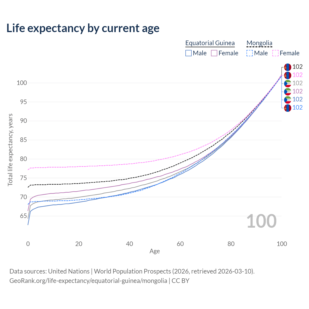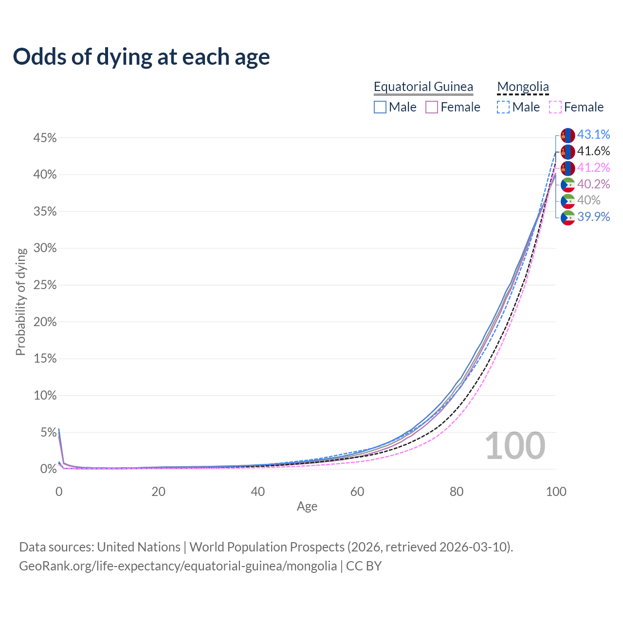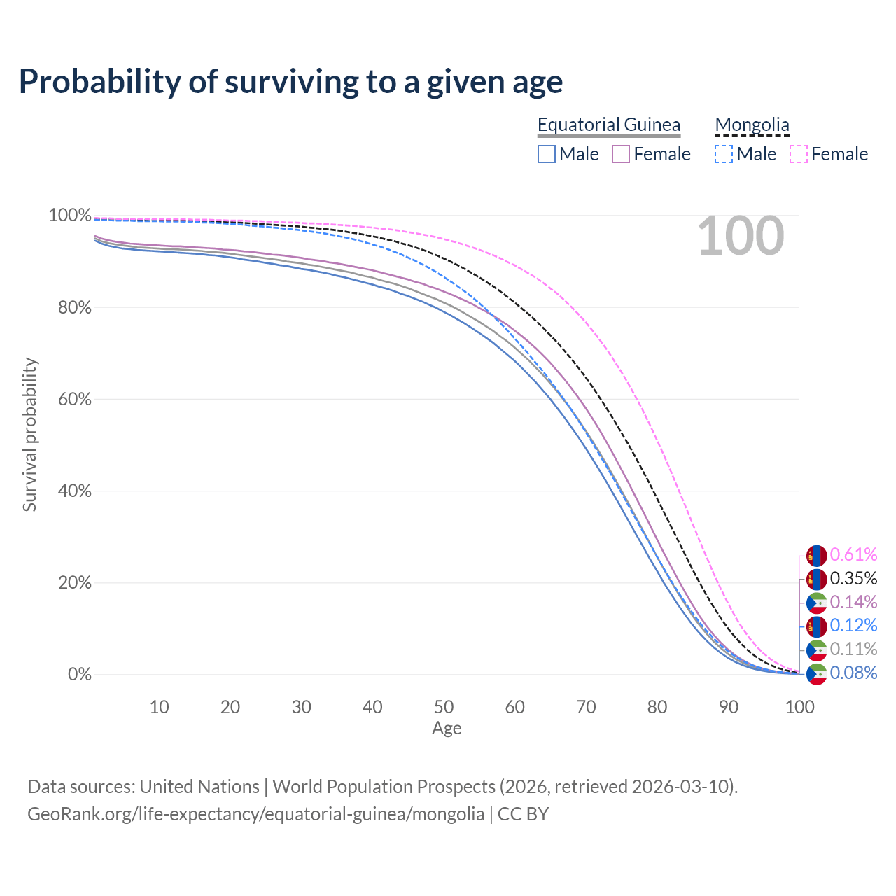 This life expectancy calculator shows the odds of living to 100, 95, 90, and below based on current age for both males and females in Equatorial Guinea and Mongolia, along with mean and median age of death. The calculations are based on the 2026 life tables (actuarial tables) from the UN World Population Prospects.