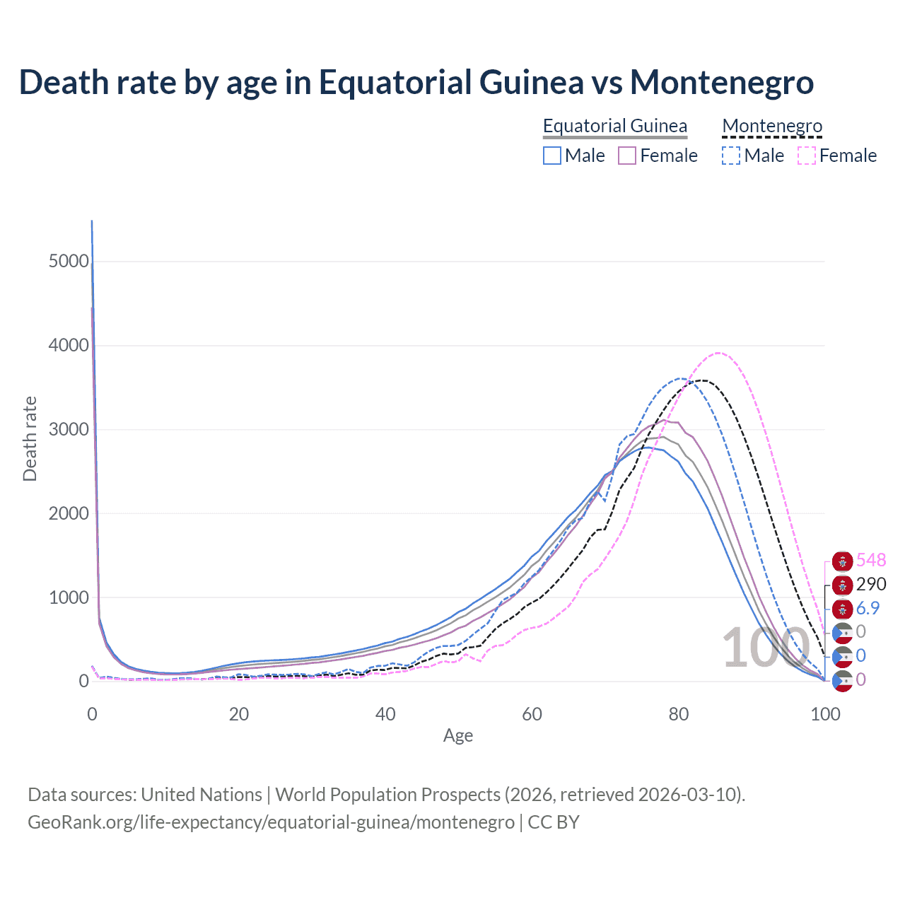 In Equatorial Guinea, the most common age of death is 0, compared to 83 in Montenegro. The median age of death is 71.3 in Equatorial Guinea and 80.1 in Montenegro, meaning only half of each cohort is expected to live past that age.