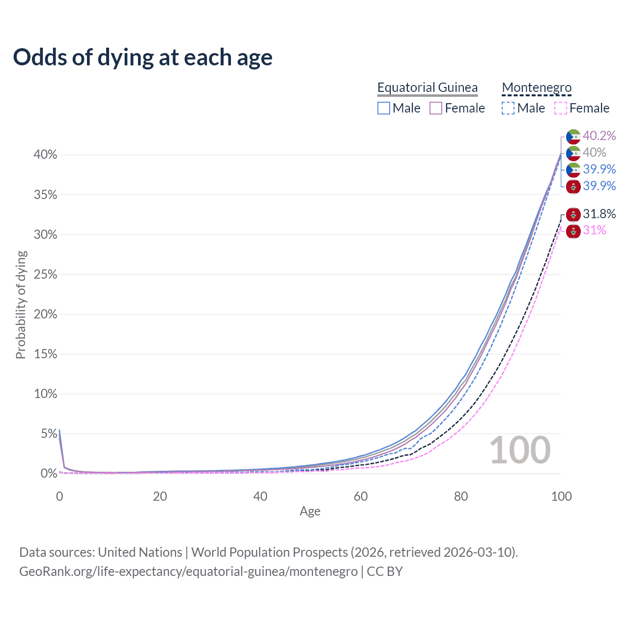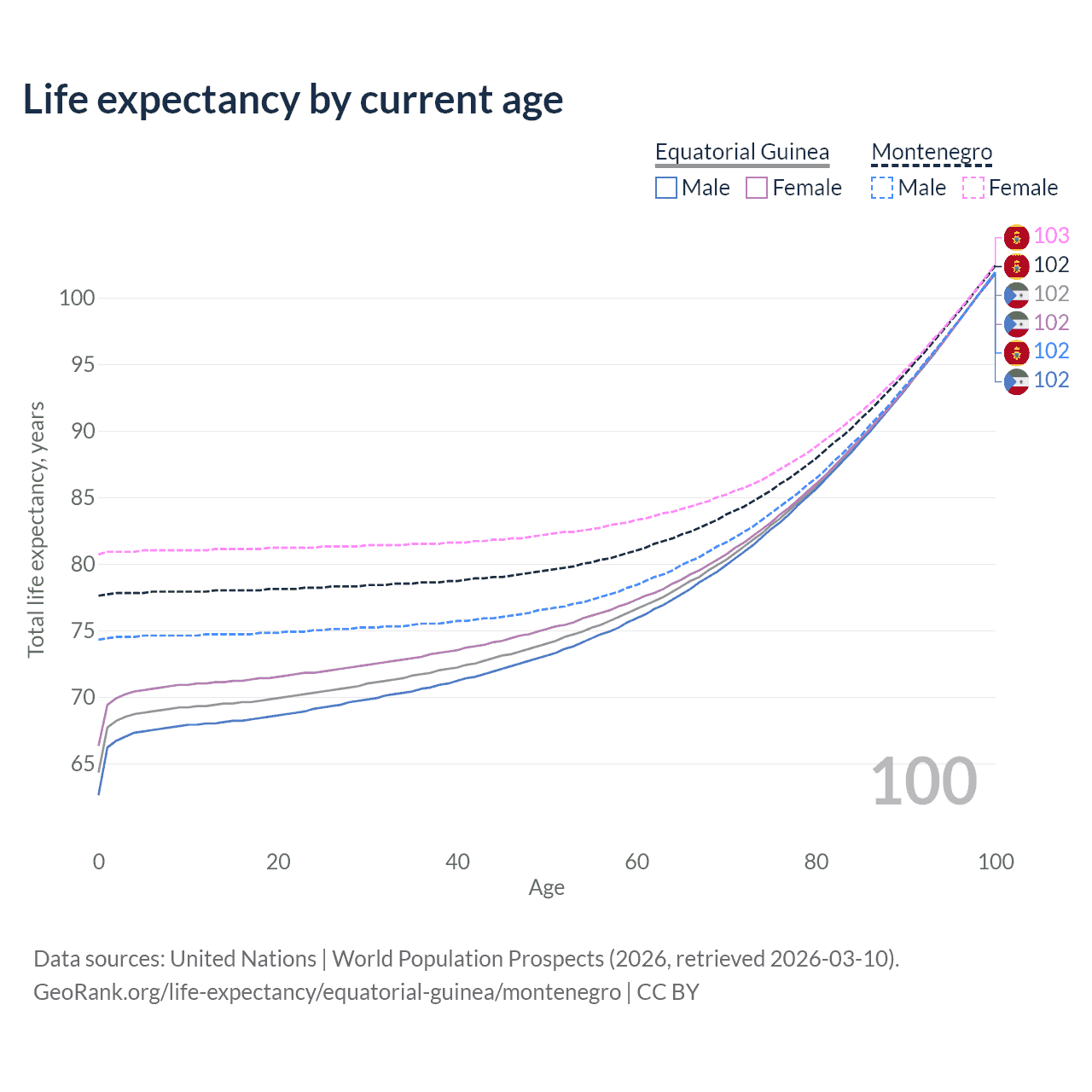 This life expectancy calculator shows the odds of living to 100, 95, 90, and below based on current age for both males and females in Equatorial Guinea and Montenegro, along with mean and median age of death. The calculations are based on the 2026 life tables (actuarial tables) from the UN World Population Prospects.