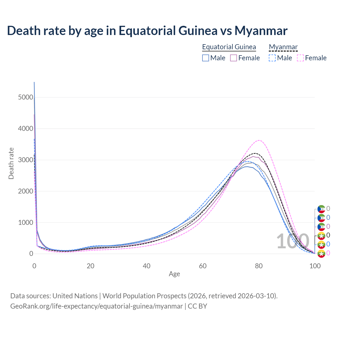 In Equatorial Guinea, the most common age of death is 0, compared to 79 in Myanmar. The median age of death is 71.3 in Equatorial Guinea and 73.1 in Myanmar, meaning only half of each cohort is expected to live past that age.