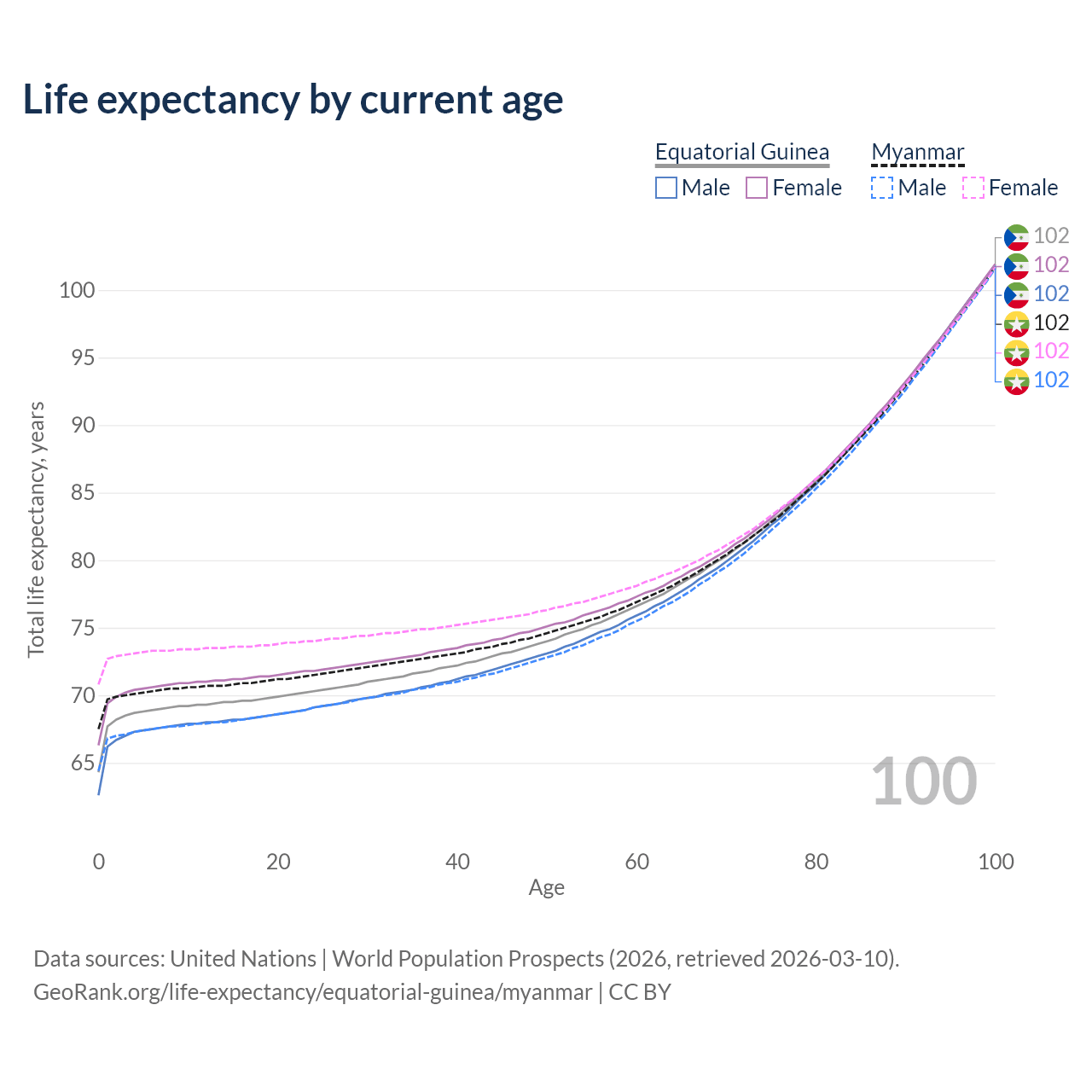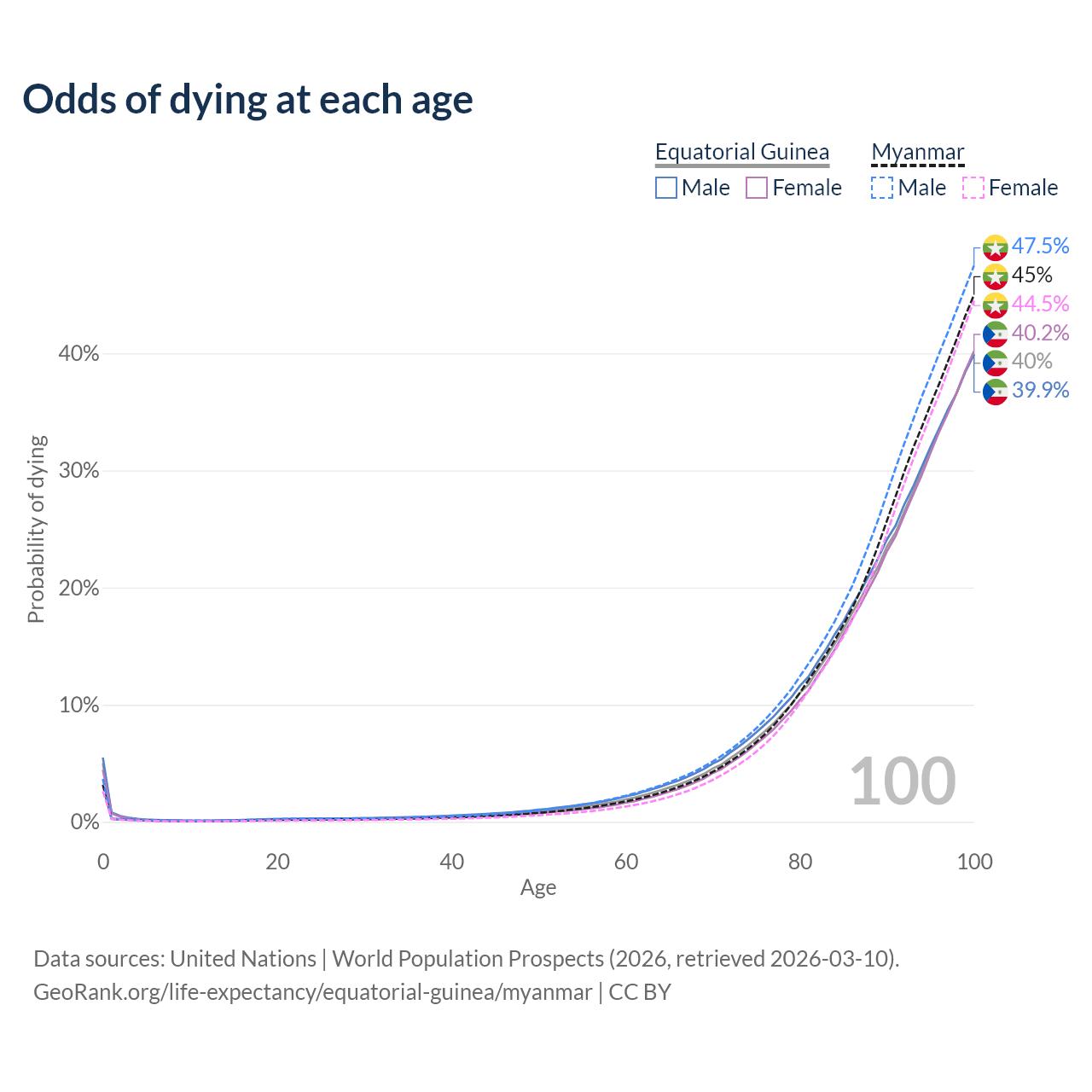 This life expectancy calculator shows the odds of living to 100, 95, 90, and below based on current age for both males and females in Equatorial Guinea and Myanmar, along with mean and median age of death. The calculations are based on the 2026 life tables (actuarial tables) from the UN World Population Prospects.