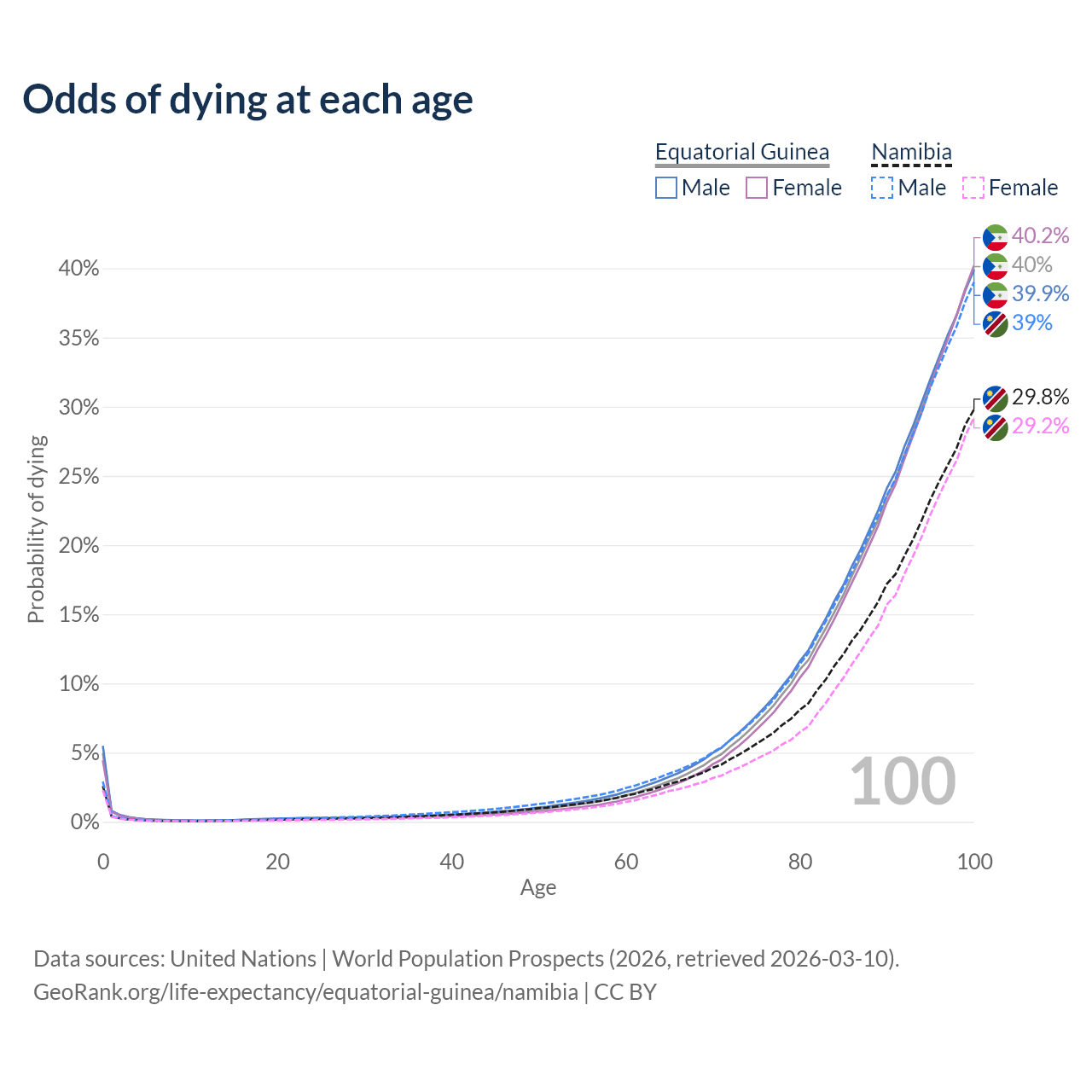 This life expectancy calculator shows the odds of living to 100, 95, 90, and below based on current age for both males and females in Equatorial Guinea and Namibia, along with mean and median age of death. The calculations are based on the 2026 life tables (actuarial tables) from the UN World Population Prospects.