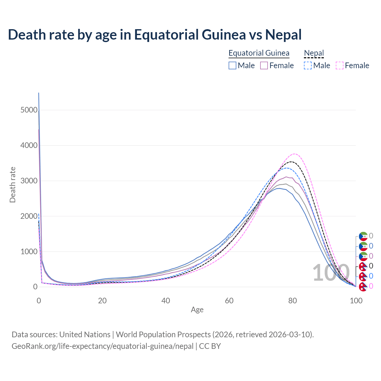 In Equatorial Guinea, the most common age of death is 0, compared to 80 in Nepal. The median age of death is 71.3 in Equatorial Guinea and 75.4 in Nepal, meaning only half of each cohort is expected to live past that age.