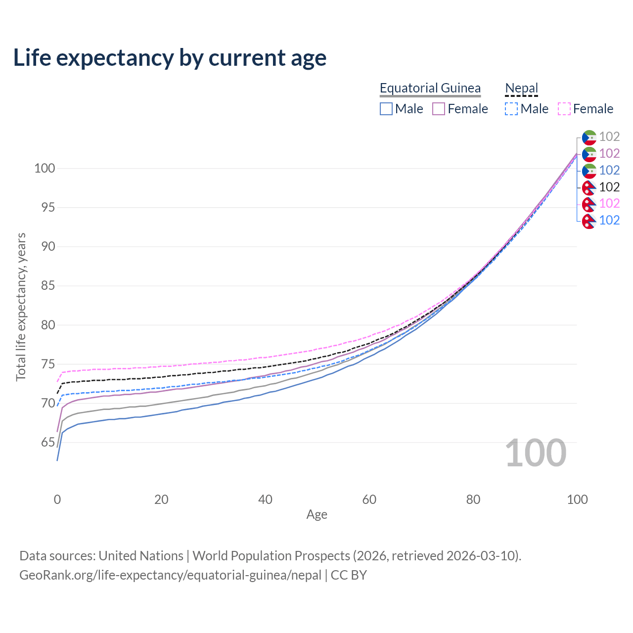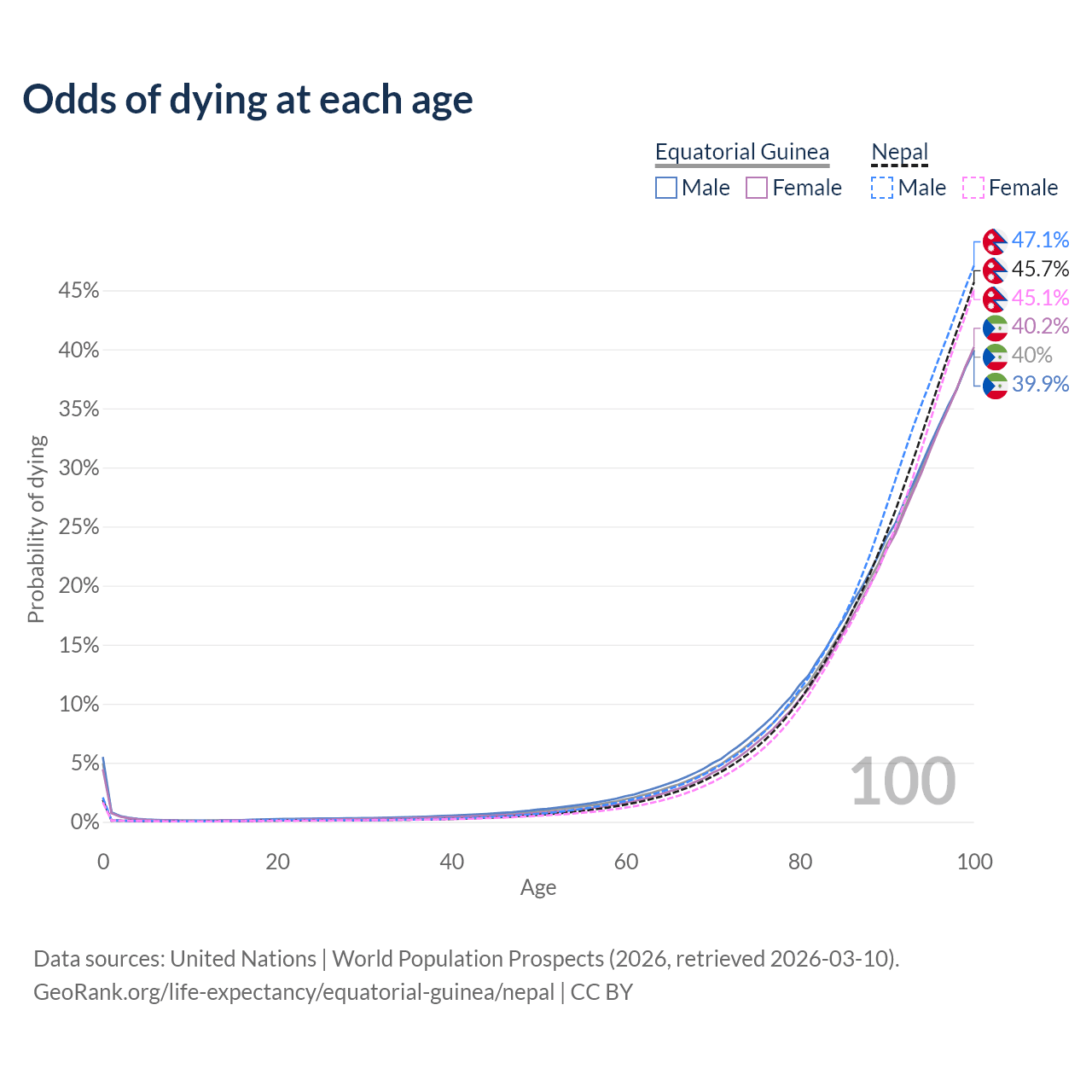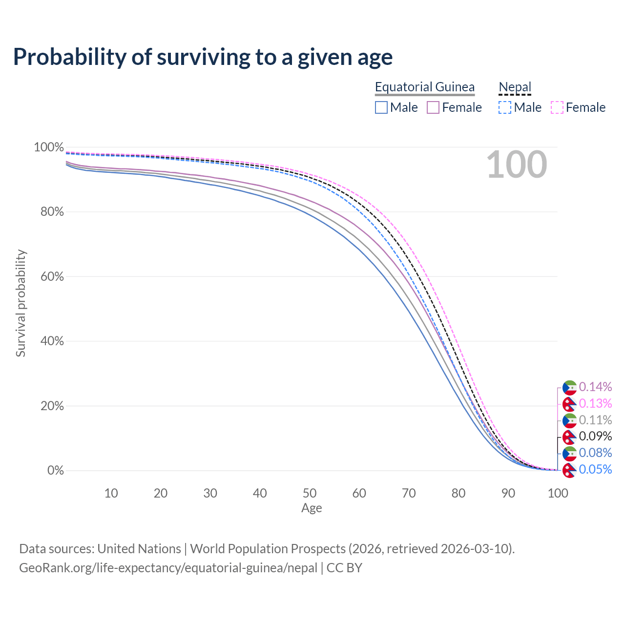 This life expectancy calculator shows the odds of living to 100, 95, 90, and below based on current age for both males and females in Equatorial Guinea and Nepal, along with mean and median age of death. The calculations are based on the 2026 life tables (actuarial tables) from the UN World Population Prospects.