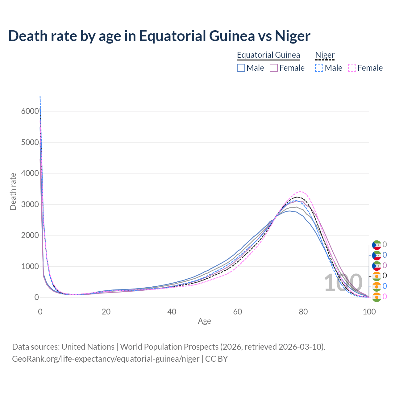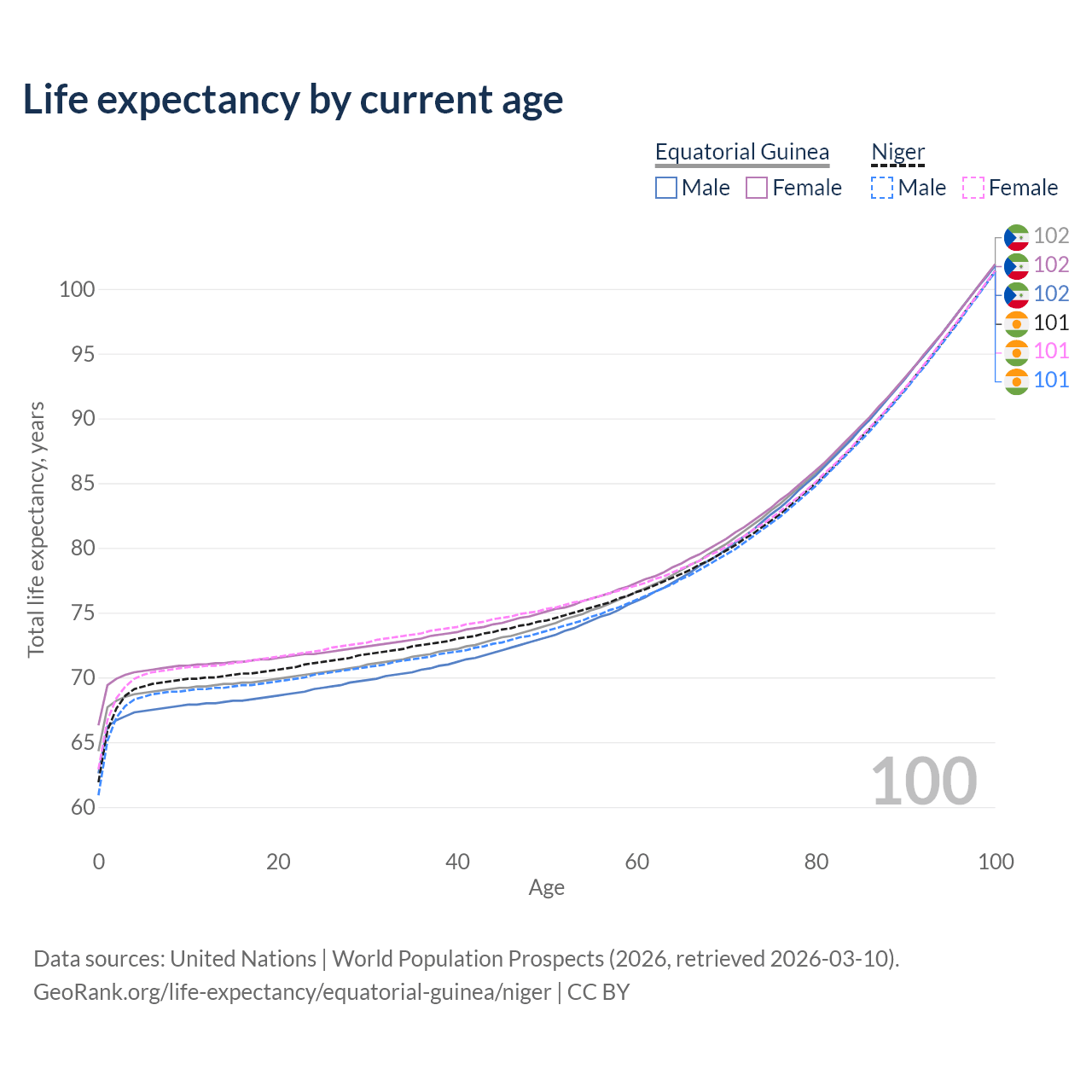 This life expectancy calculator shows the odds of living to 100, 95, 90, and below based on current age for both males and females in Equatorial Guinea and Niger, along with mean and median age of death. The calculations are based on the 2026 life tables (actuarial tables) from the UN World Population Prospects.