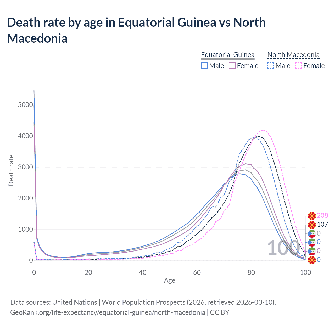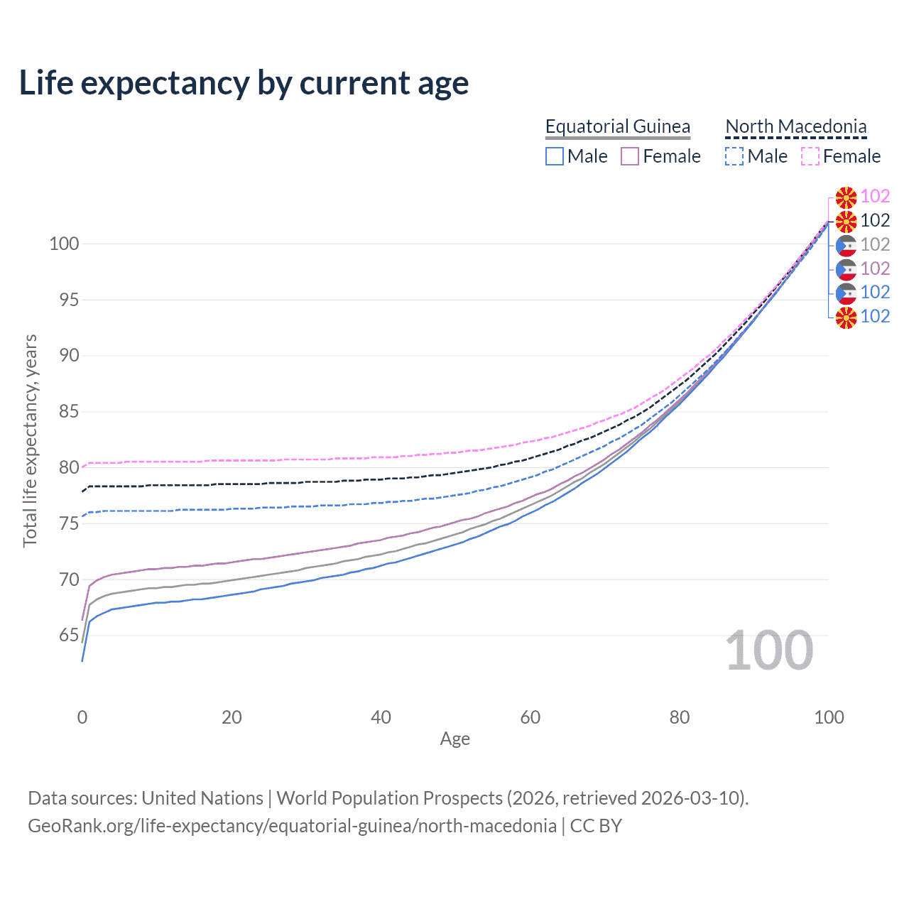 This life expectancy calculator shows the odds of living to 100, 95, 90, and below based on current age for both males and females in Equatorial Guinea and North Macedonia, along with mean and median age of death. The calculations are based on the 2026 life tables (actuarial tables) from the UN World Population Prospects.