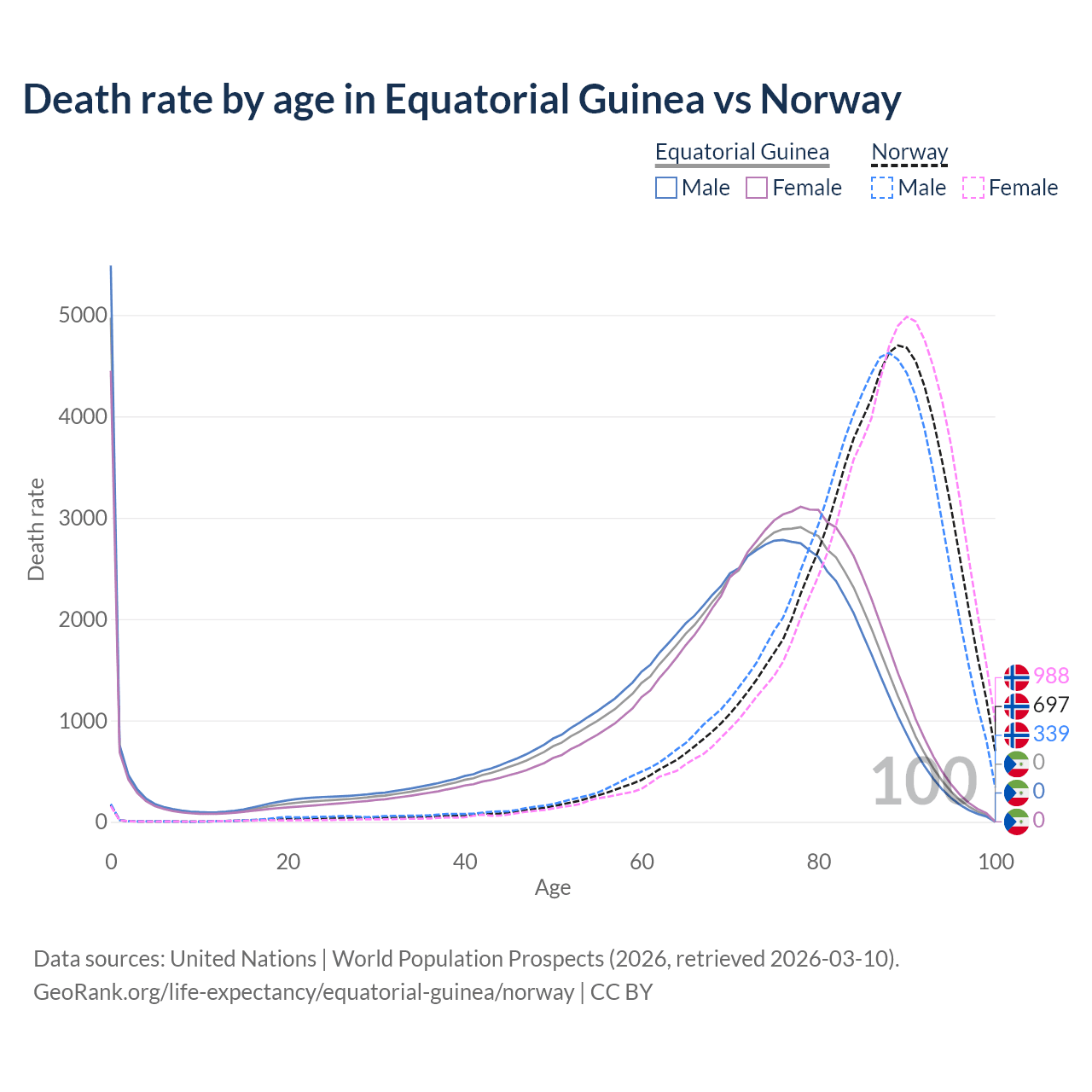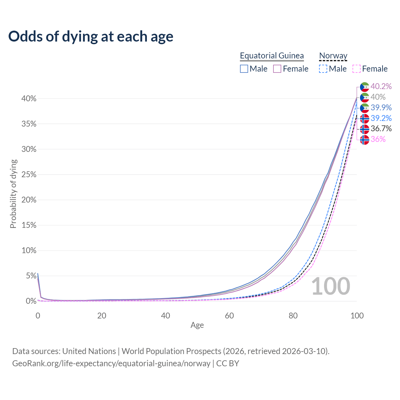 This life expectancy calculator shows the odds of living to 100, 95, 90, and below based on current age for both males and females in Equatorial Guinea and Norway, along with mean and median age of death. The calculations are based on the 2026 life tables (actuarial tables) from the UN World Population Prospects.