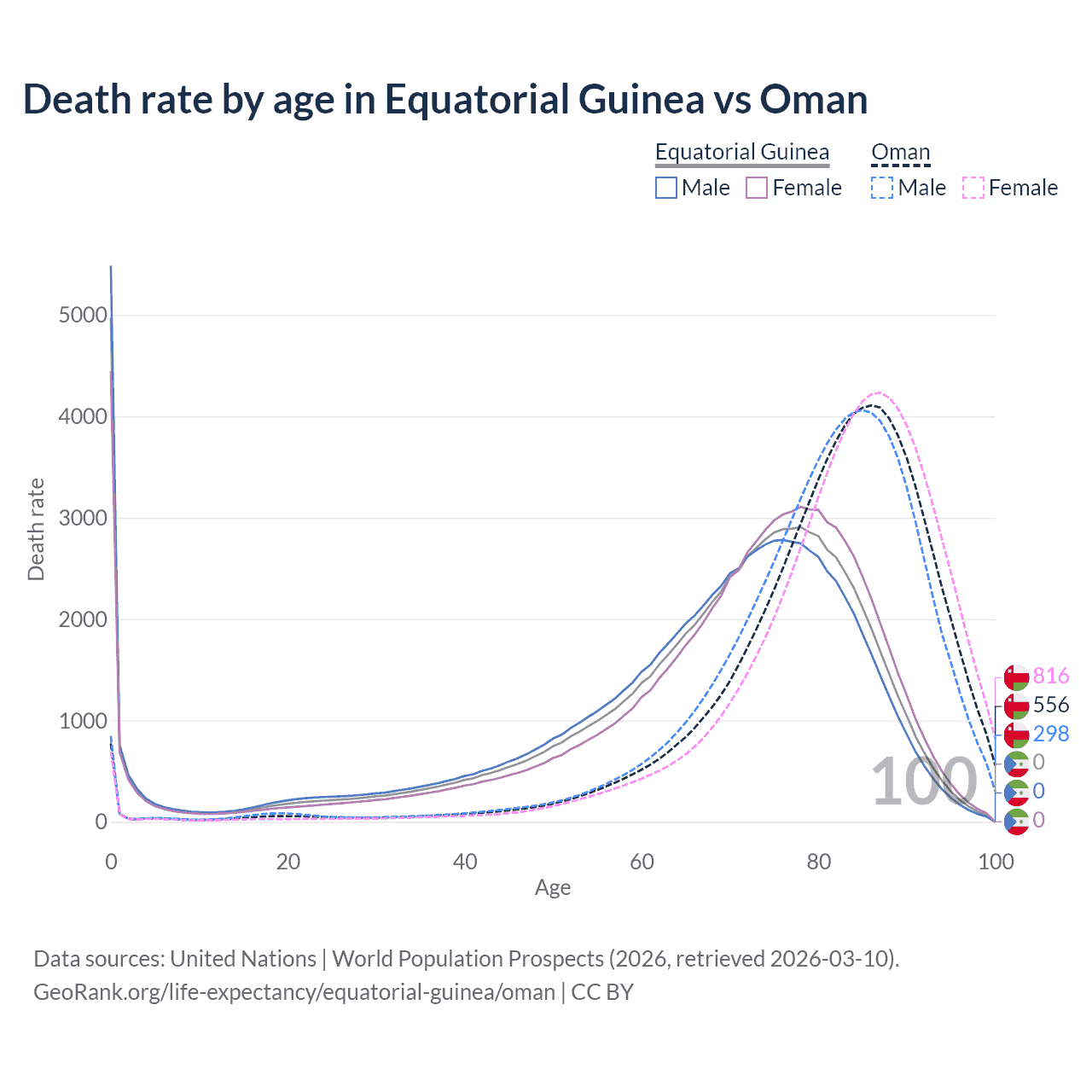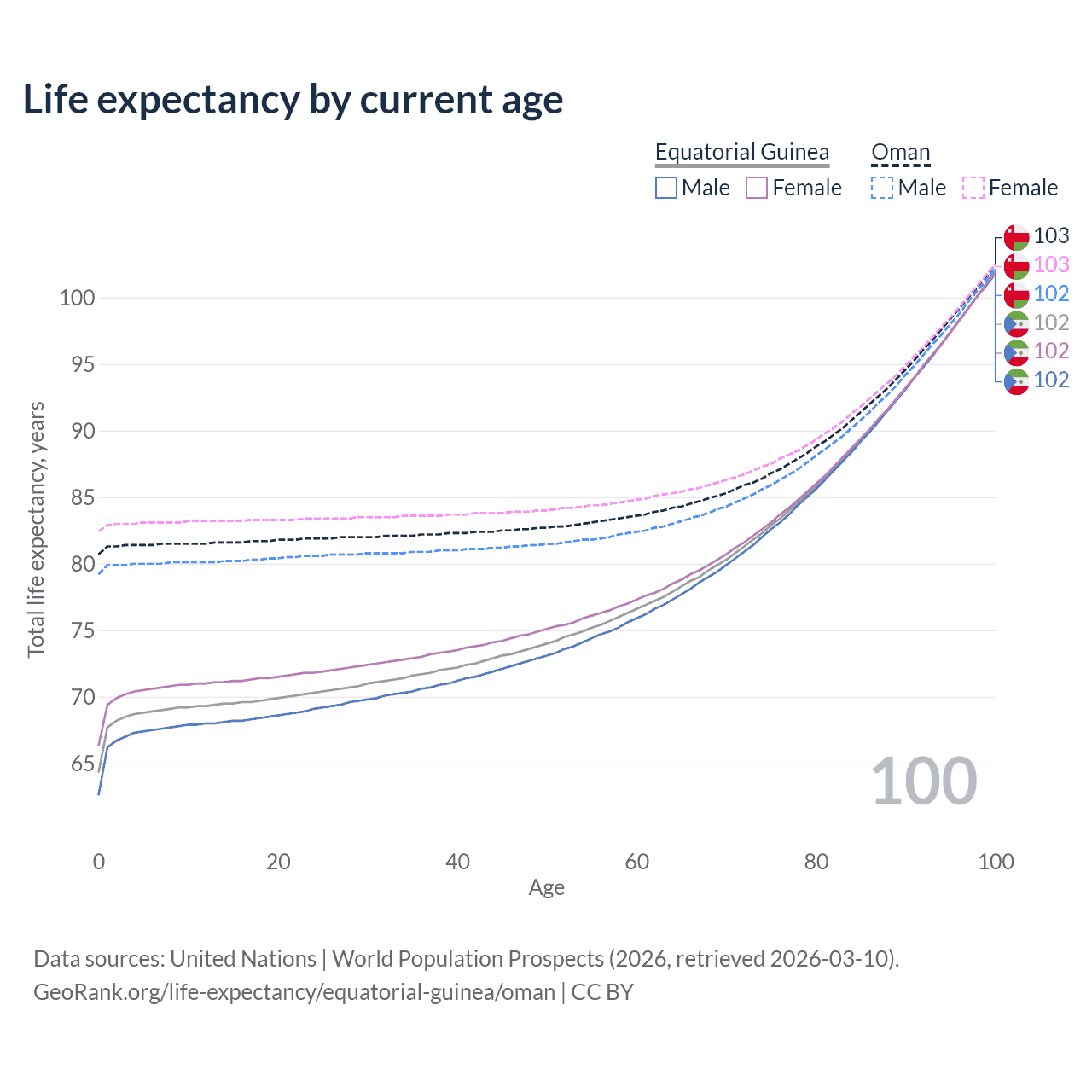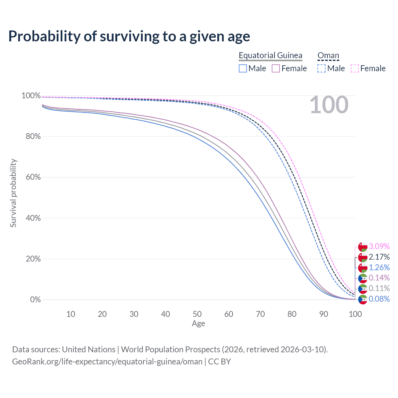 This life expectancy calculator shows the odds of living to 100, 95, 90, and below based on current age for both males and females in Equatorial Guinea and Oman, along with mean and median age of death. The calculations are based on the 2026 life tables (actuarial tables) from the UN World Population Prospects.