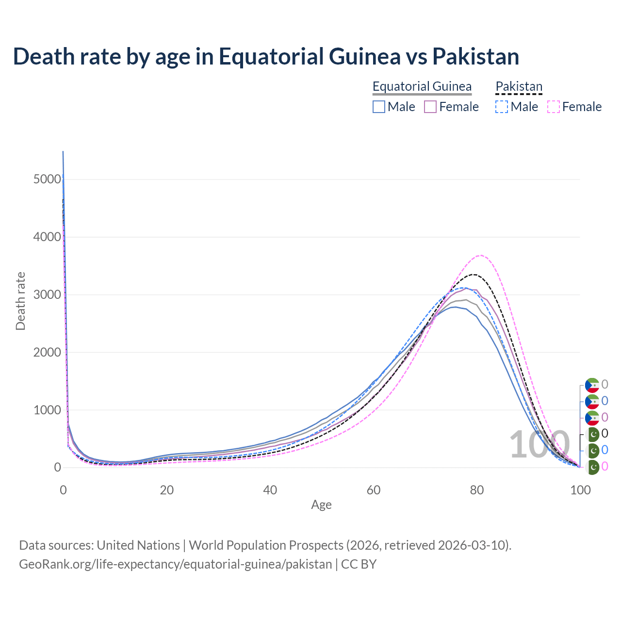 In Equatorial Guinea, the most common age of death is 0, compared to 0 in Pakistan. The median age of death is 71.3 in Equatorial Guinea and 74.3 in Pakistan, meaning only half of each cohort is expected to live past that age.