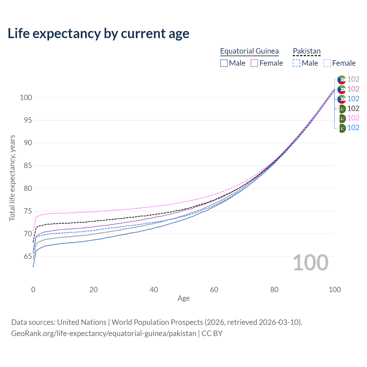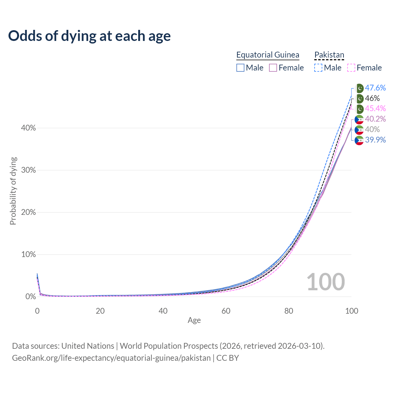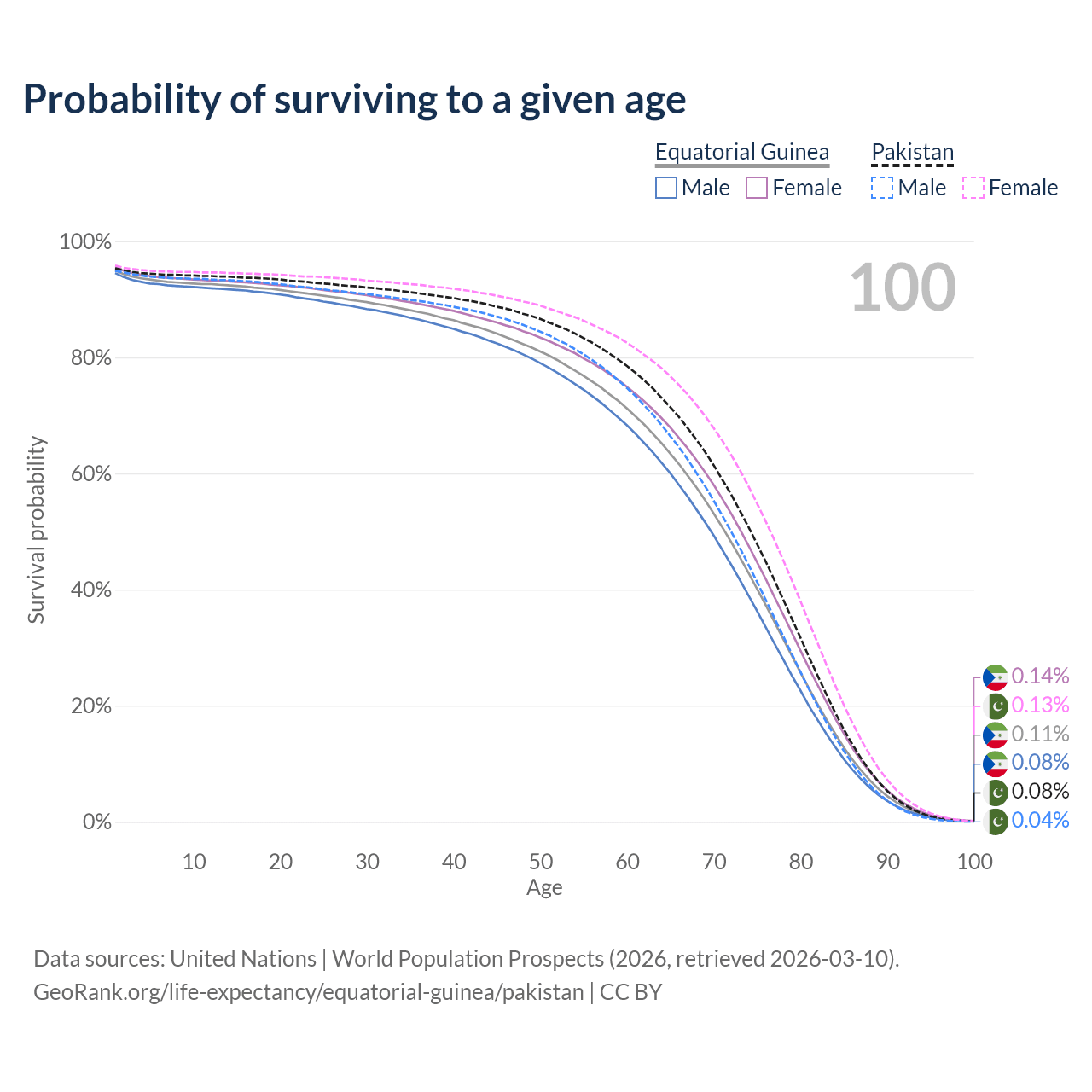 This life expectancy calculator shows the odds of living to 100, 95, 90, and below based on current age for both males and females in Equatorial Guinea and Pakistan, along with mean and median age of death. The calculations are based on the 2026 life tables (actuarial tables) from the UN World Population Prospects.