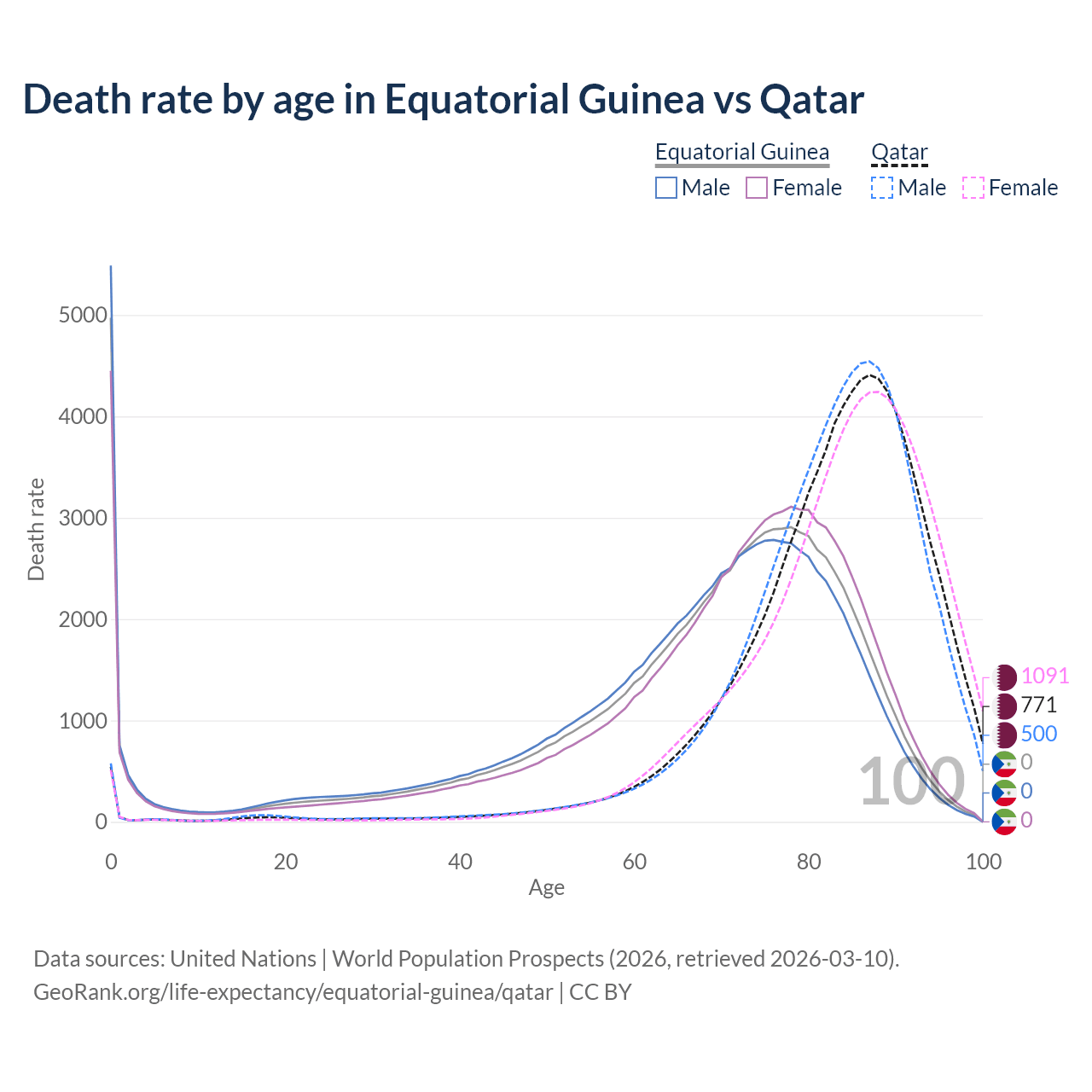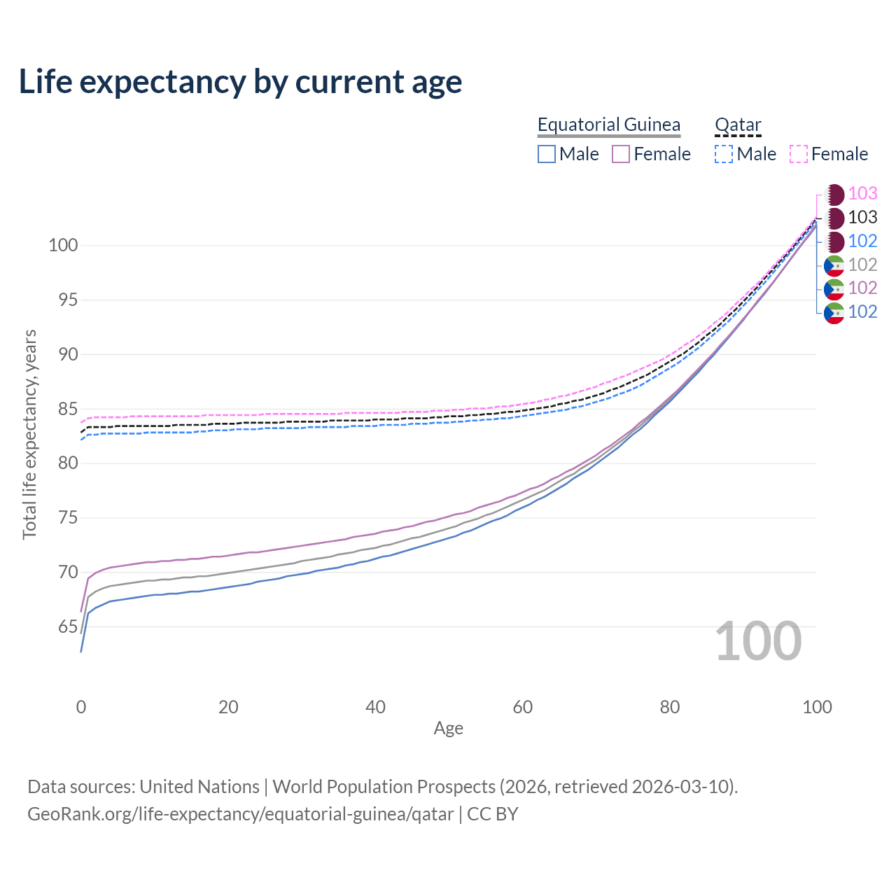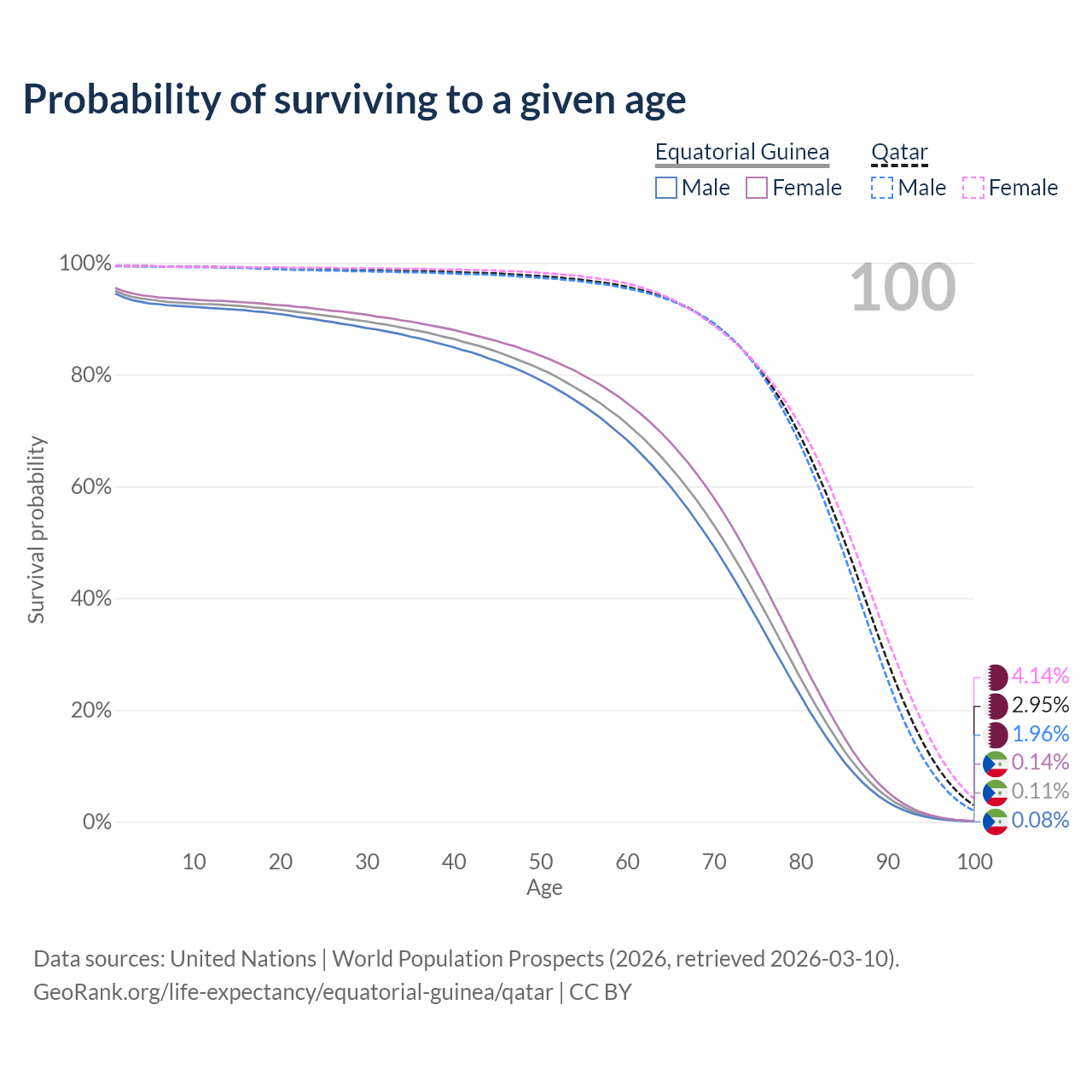 This life expectancy calculator shows the odds of living to 100, 95, 90, and below based on current age for both males and females in Equatorial Guinea and Qatar, along with mean and median age of death. The calculations are based on the 2026 life tables (actuarial tables) from the UN World Population Prospects.